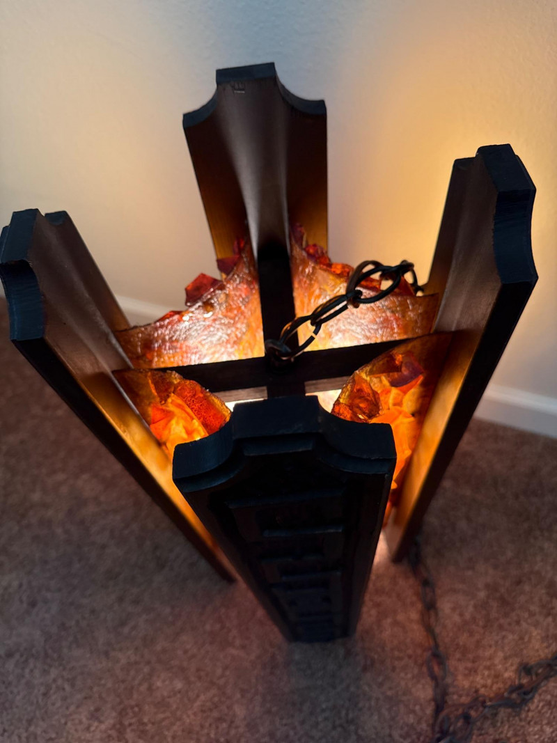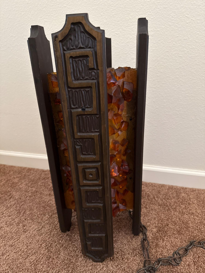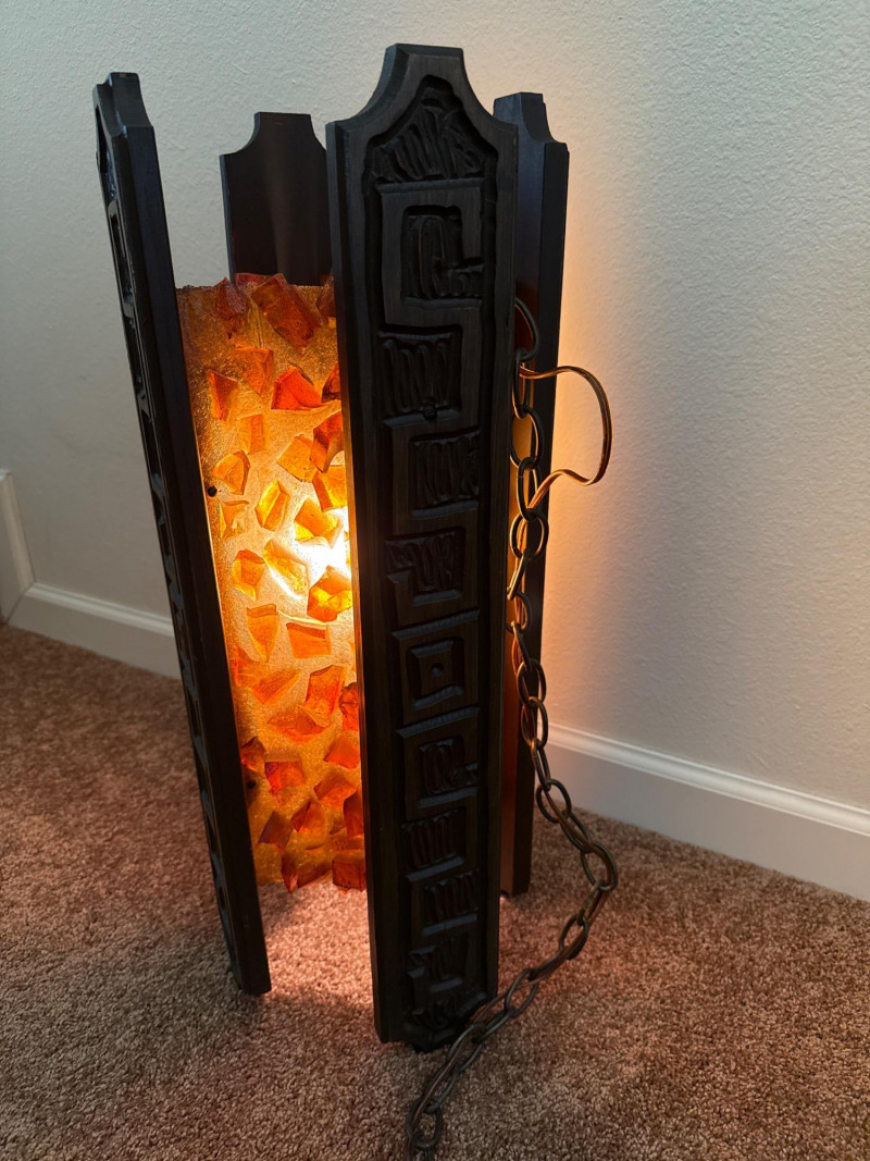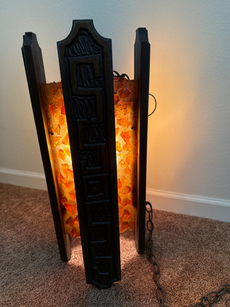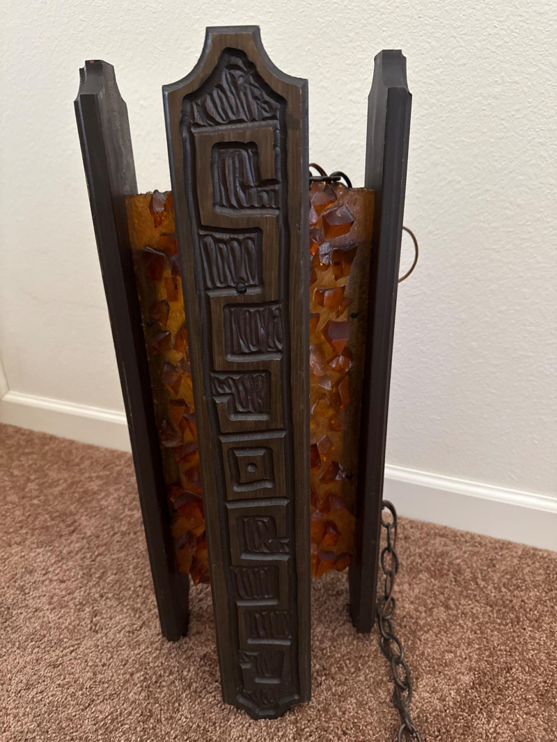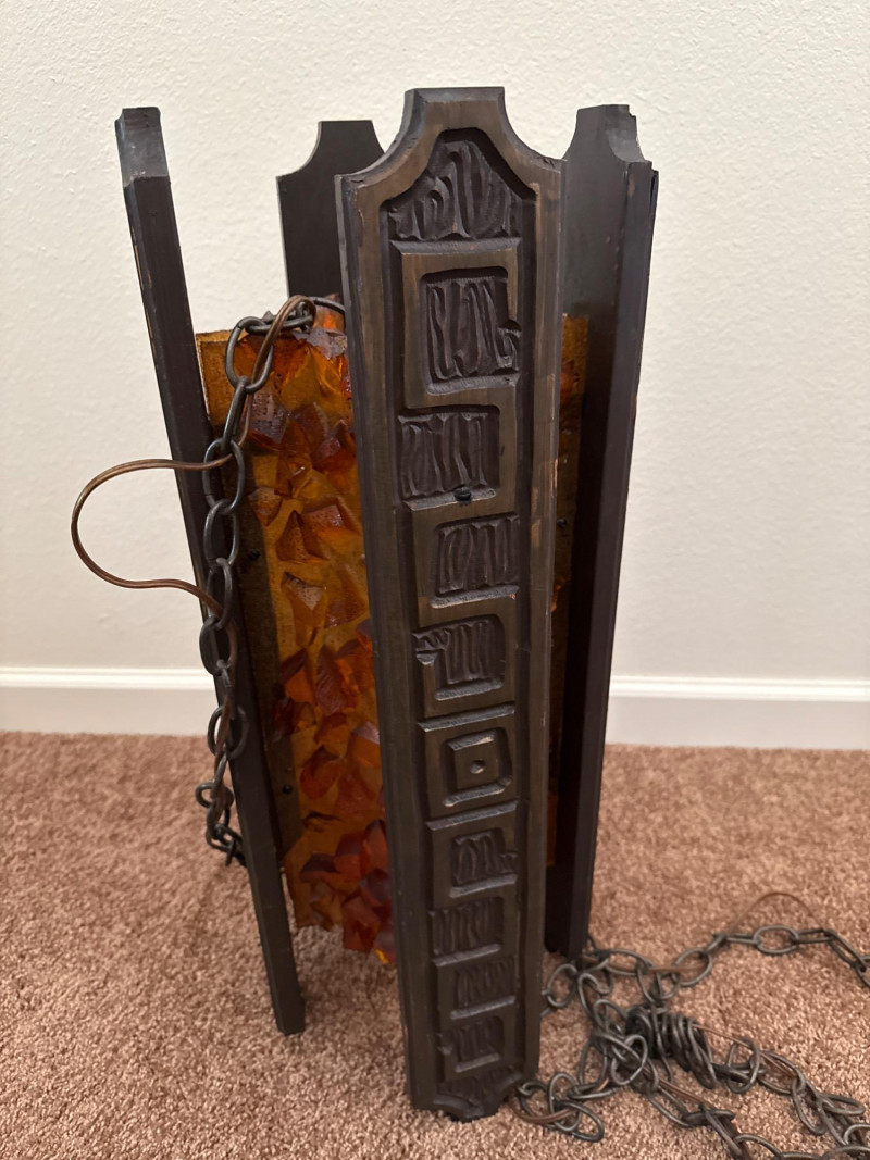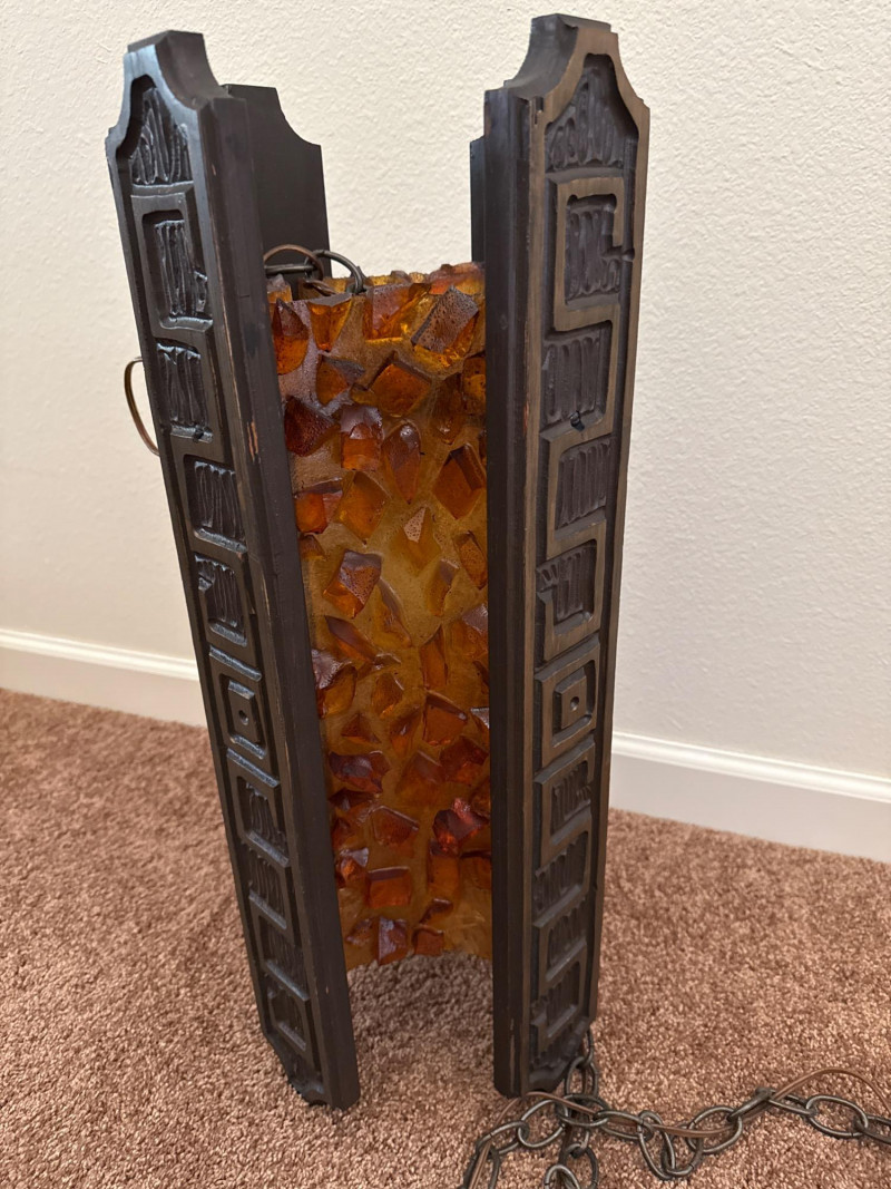 Vintage Chunky Lucite Swag Hanging Lamp - Works Great! This is a vintage hanging swag lamp featuring chunky amber-colored Lucite panels. It has a dark, possibly wood or wood-look, frame and comes with a very long chain and cord. This lamp works great and is ready to hang.