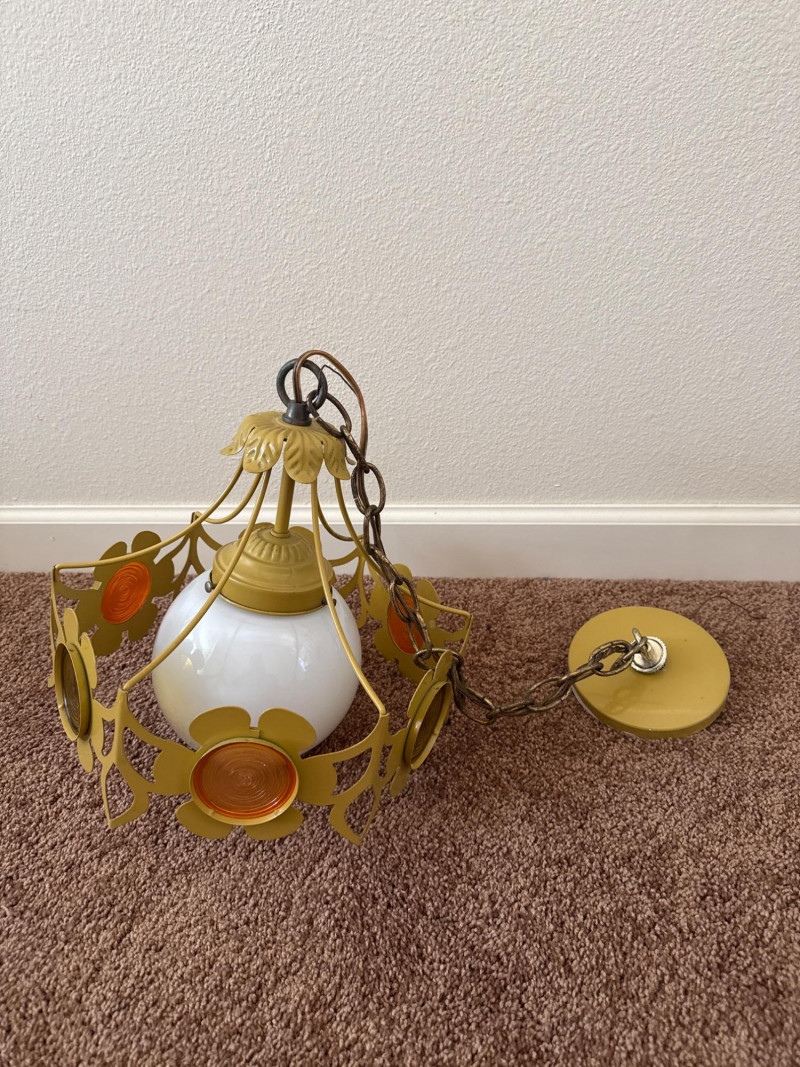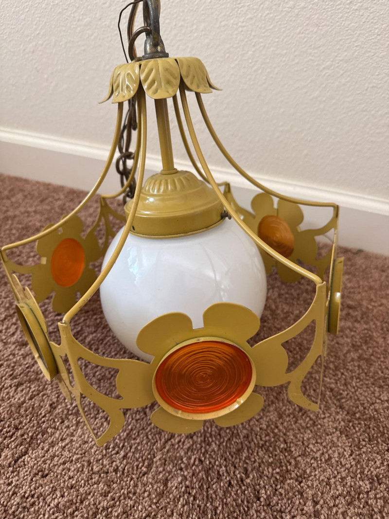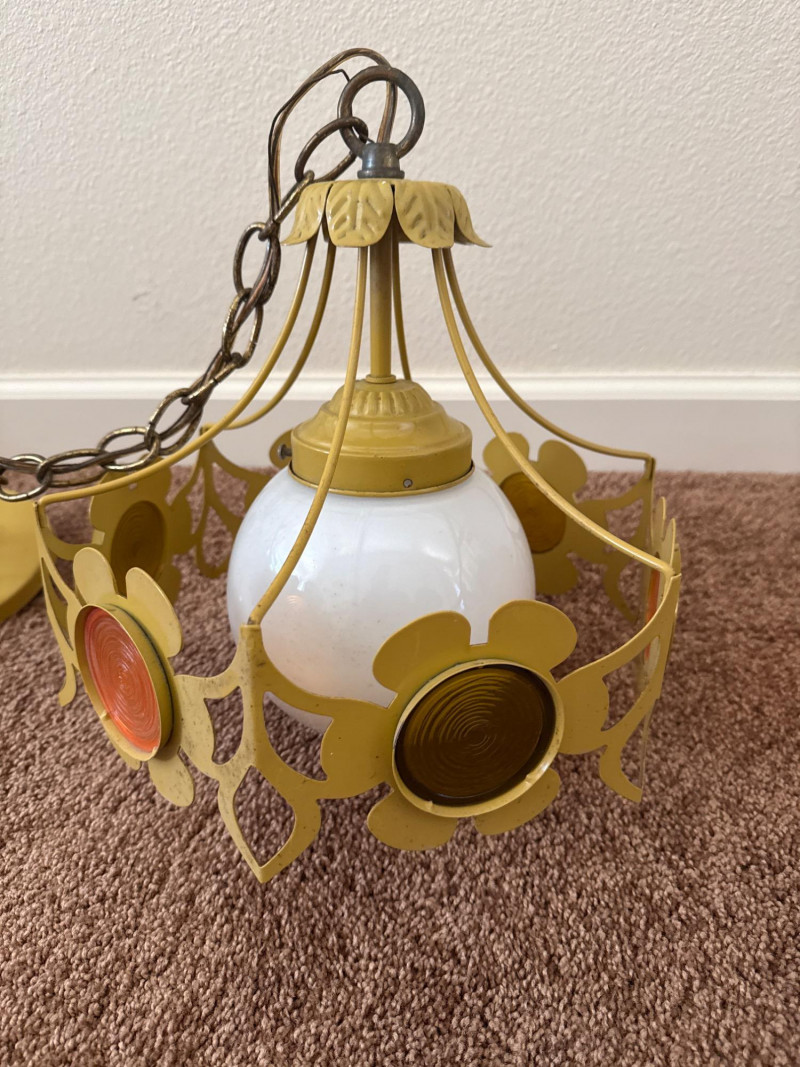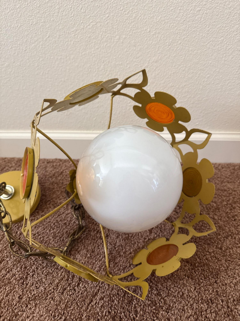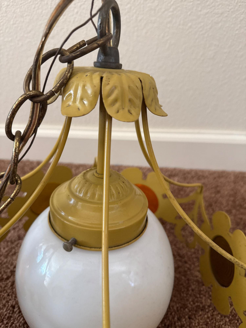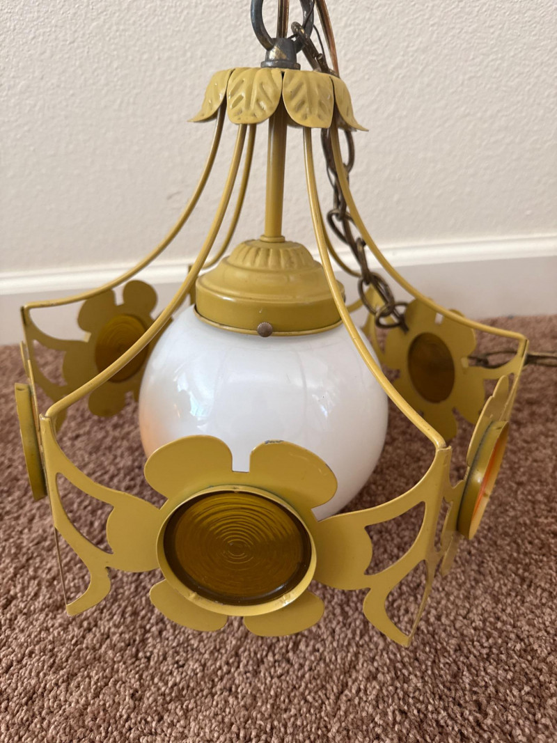 Vintage L&S Lighting Floral Swag Chandelier, Yellow & White 11”D This vintage L&S Lighting floral swag chandelier features a mustard-yellow metal frame with flower-shaped accents surrounding a white glass globe—ideal for mid-century-style décor. Marked by L&S Lighting Fixture Co. (Los Angeles) and UL-listed (Issue No. G-526,617). Dimensions: 11″ diameter × 14″ total height Condition: Vintage with light surface wear and minor paint loss on petal edges; glass globe solid with no cracks Wiring has not been tested and likely requires professional inspection. Bid knowing this piece is structurally sound but will require an electrician to test/replace wiring before use.