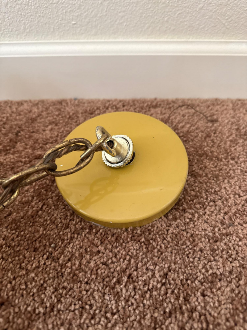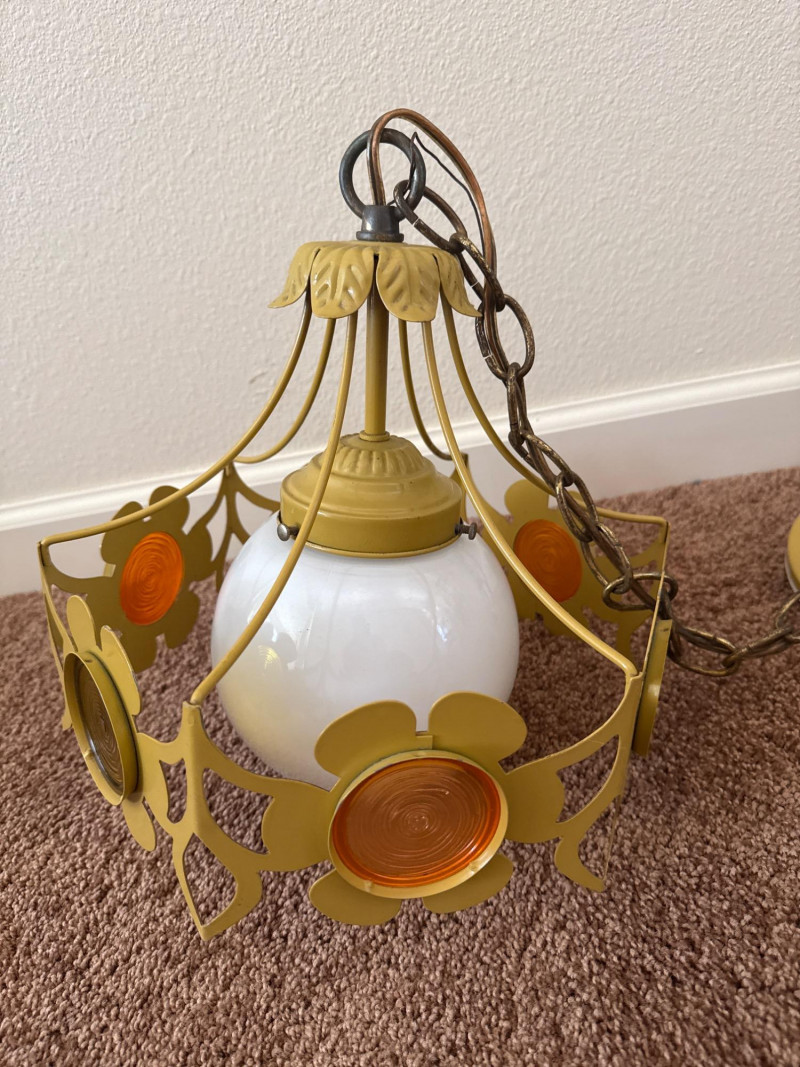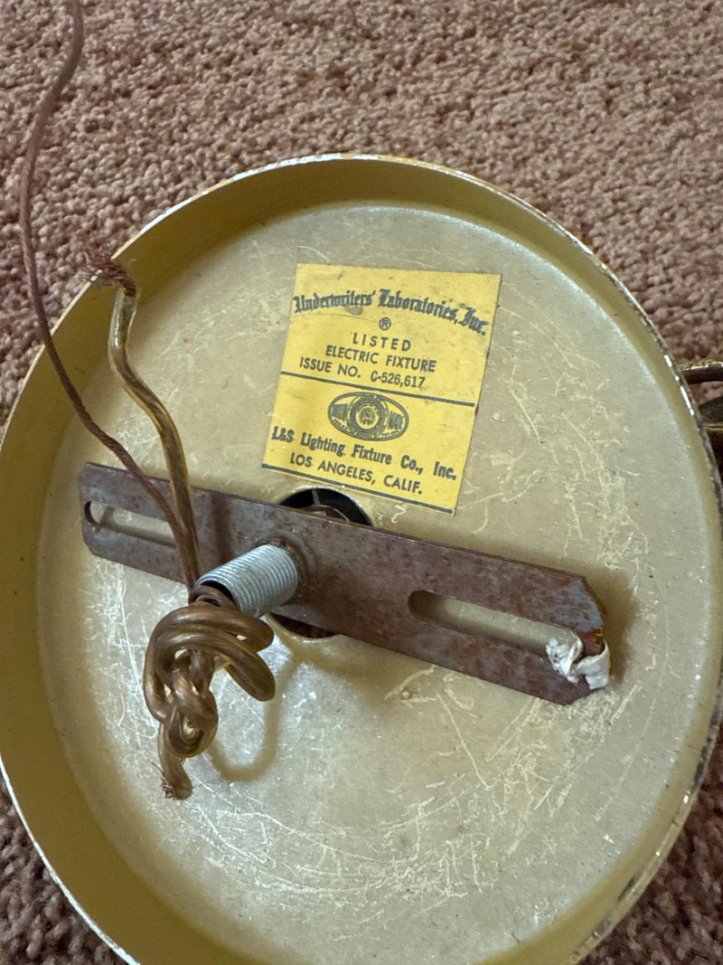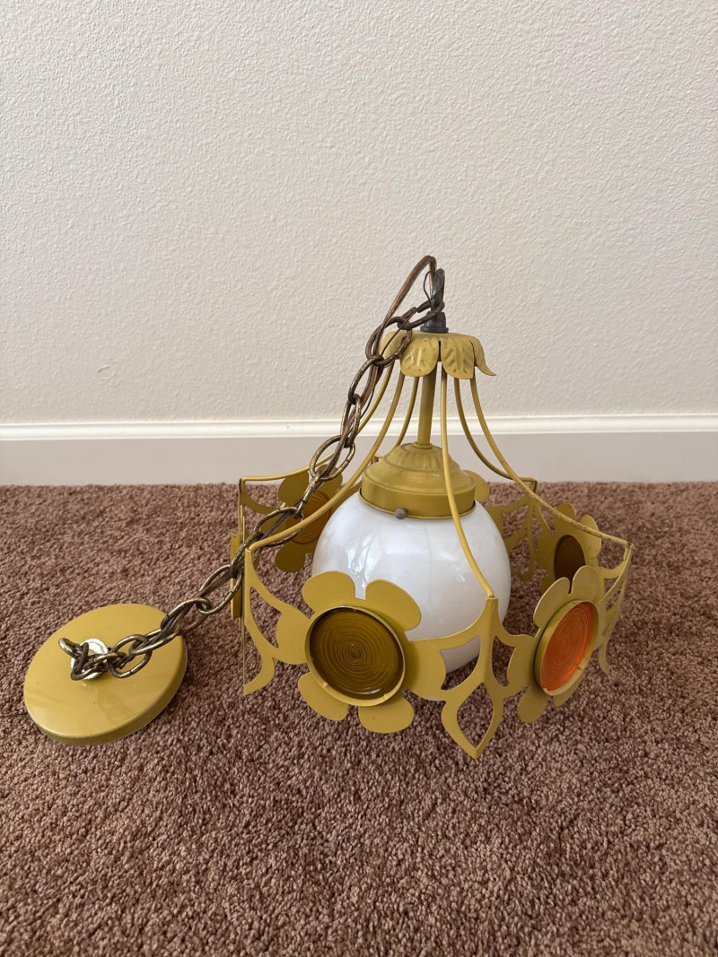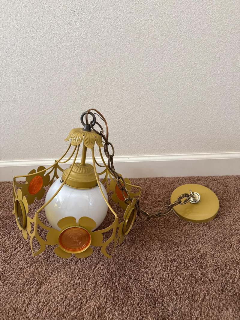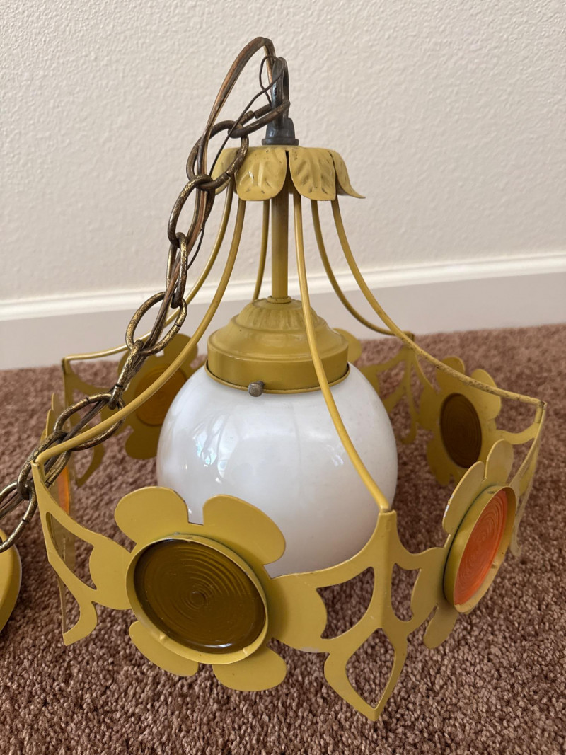 Vintage L&S Lighting Floral Swag Chandelier, Yellow & White 11”D This vintage L&S Lighting floral swag chandelier features a mustard-yellow metal frame with flower-shaped accents surrounding a white glass globe—ideal for mid-century-style décor. Marked by L&S Lighting Fixture Co. (Los Angeles) and UL-listed (Issue No. G-526,617). Dimensions: 11″ diameter × 14″ total height Condition: Vintage with light surface wear and minor paint loss on petal edges; glass globe solid with no cracks Wiring has not been tested and likely requires professional inspection. Bid knowing this piece is structurally sound but will require an electrician to test/replace wiring before use.