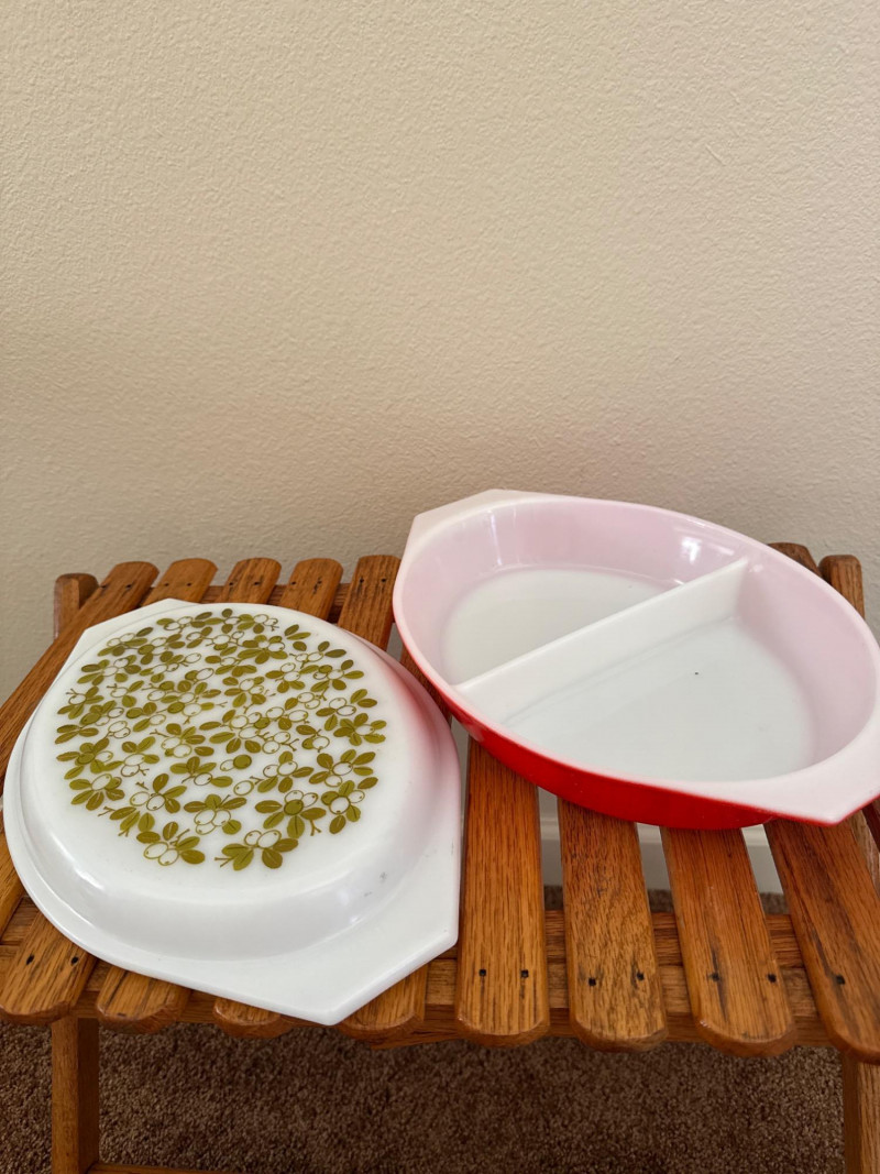 Lot # 34 - Vintage 1960’s PYREX Verde Divided Casserole, Pyrex FlameGlo, & More