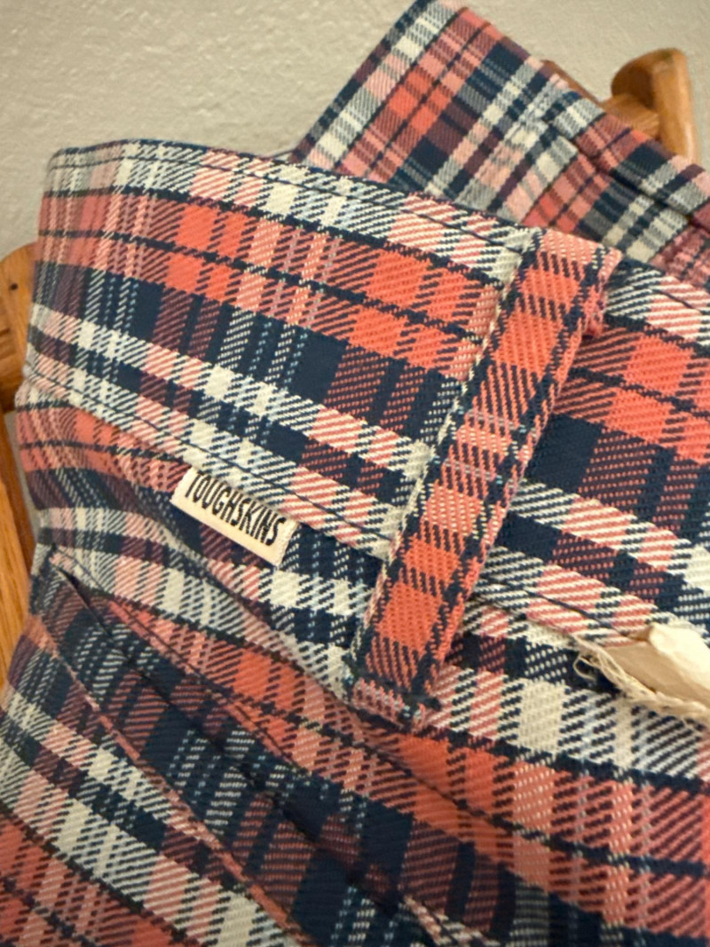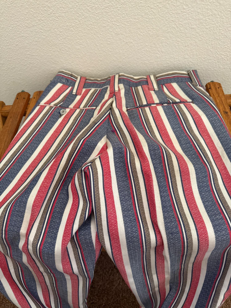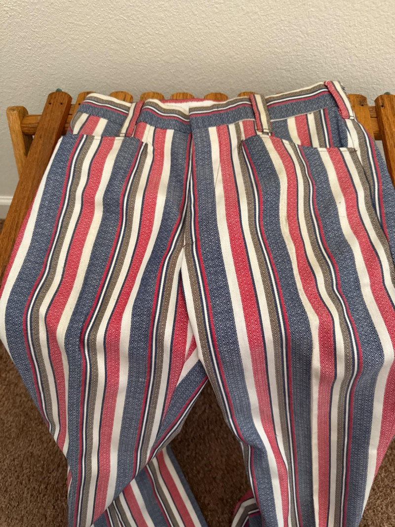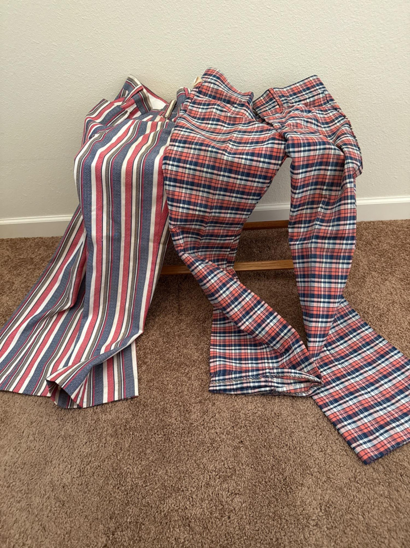 One pair is Sears Toughskins in a red-white-blue plaid (size 30×31), and the other is Koratron striped pants in red, white, and blue (approximate length 30″, fits like a modern size 2). Both pairs have a straight-leg cut and are made from durable polyester-cotton blends.