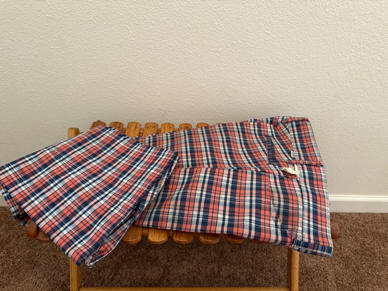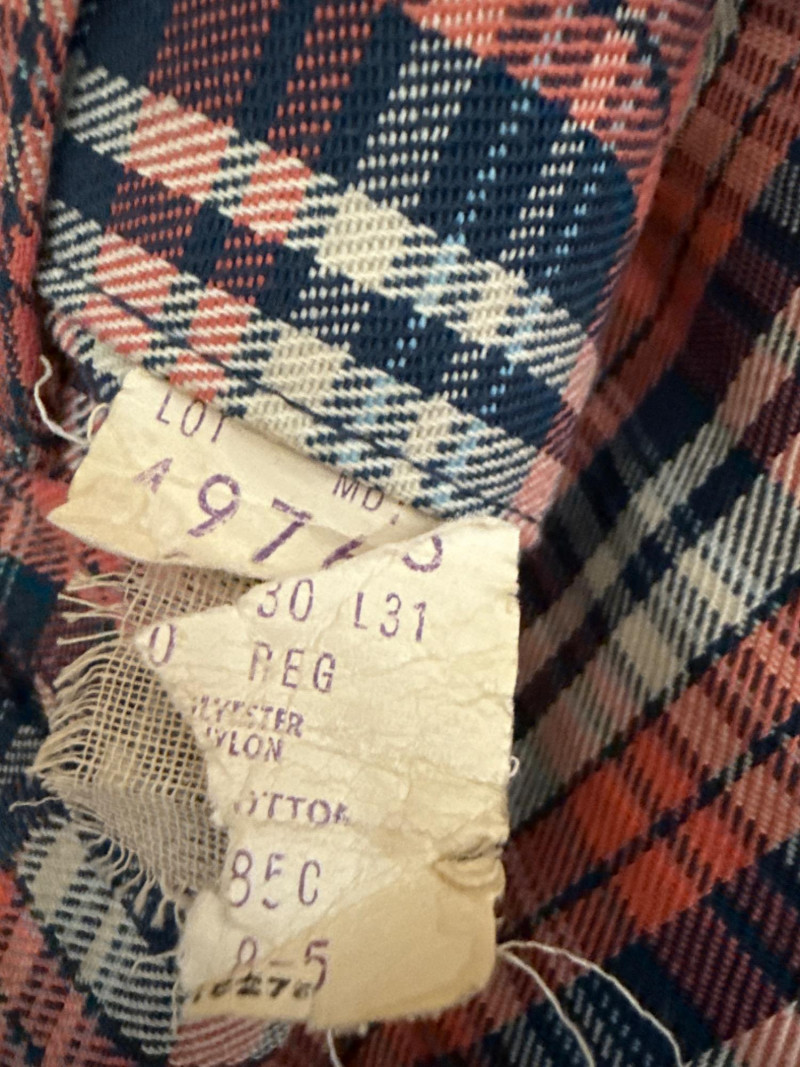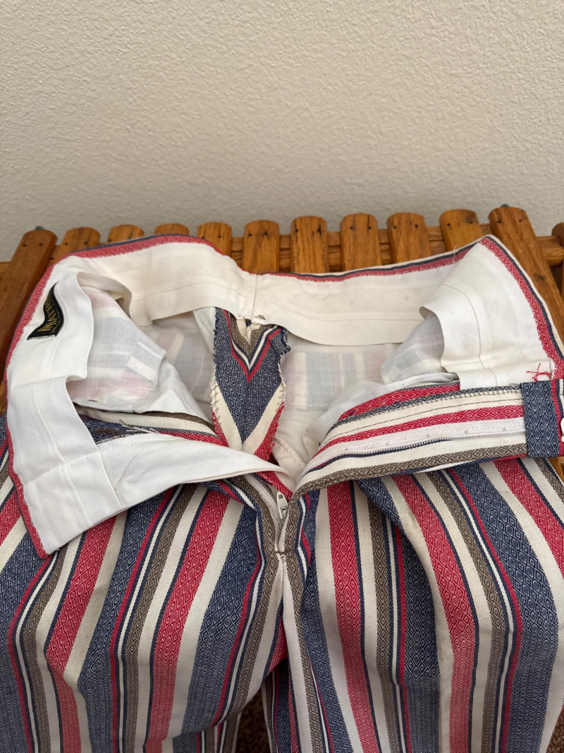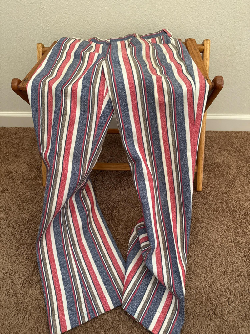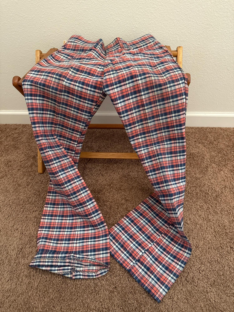 One pair is Sears Toughskins in a red-white-blue plaid (size 30×31), and the other is Koratron striped pants in red, white, and blue (approximate length 30″, fits like a modern size 2). Both pairs have a straight-leg cut and are made from durable polyester-cotton blends.
