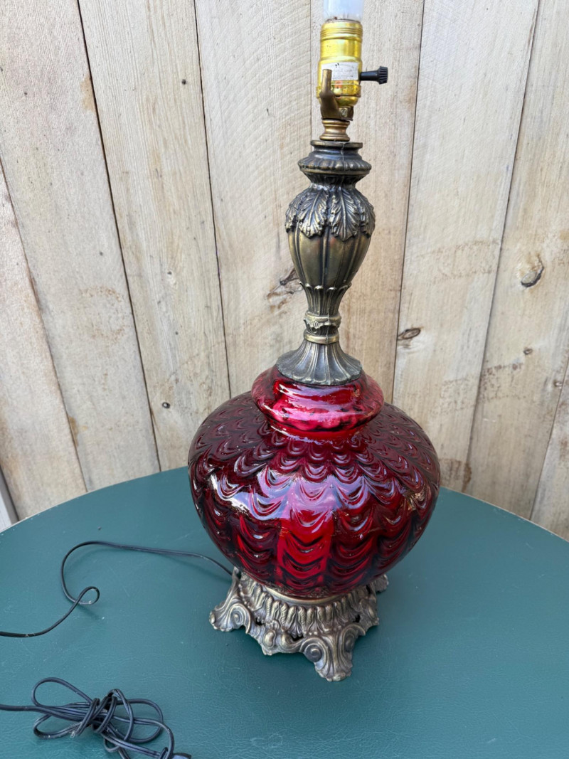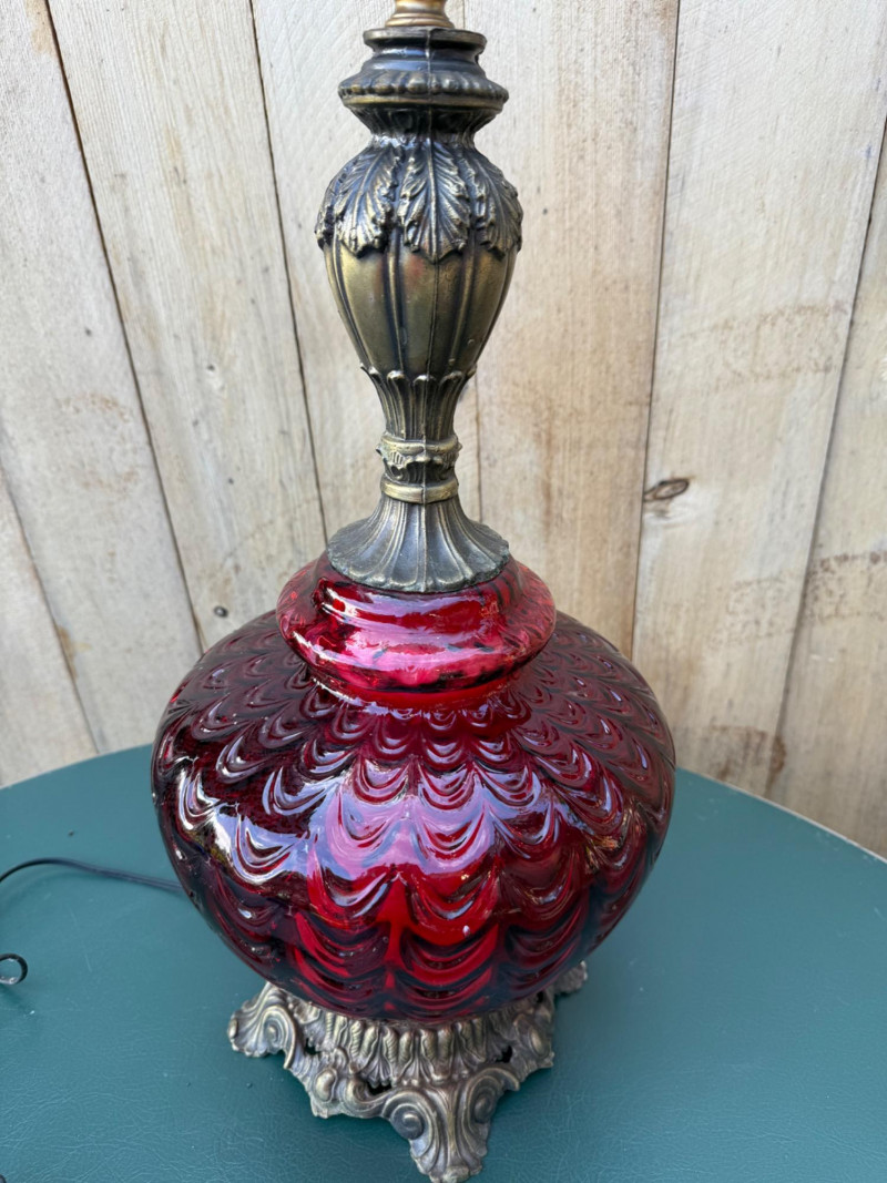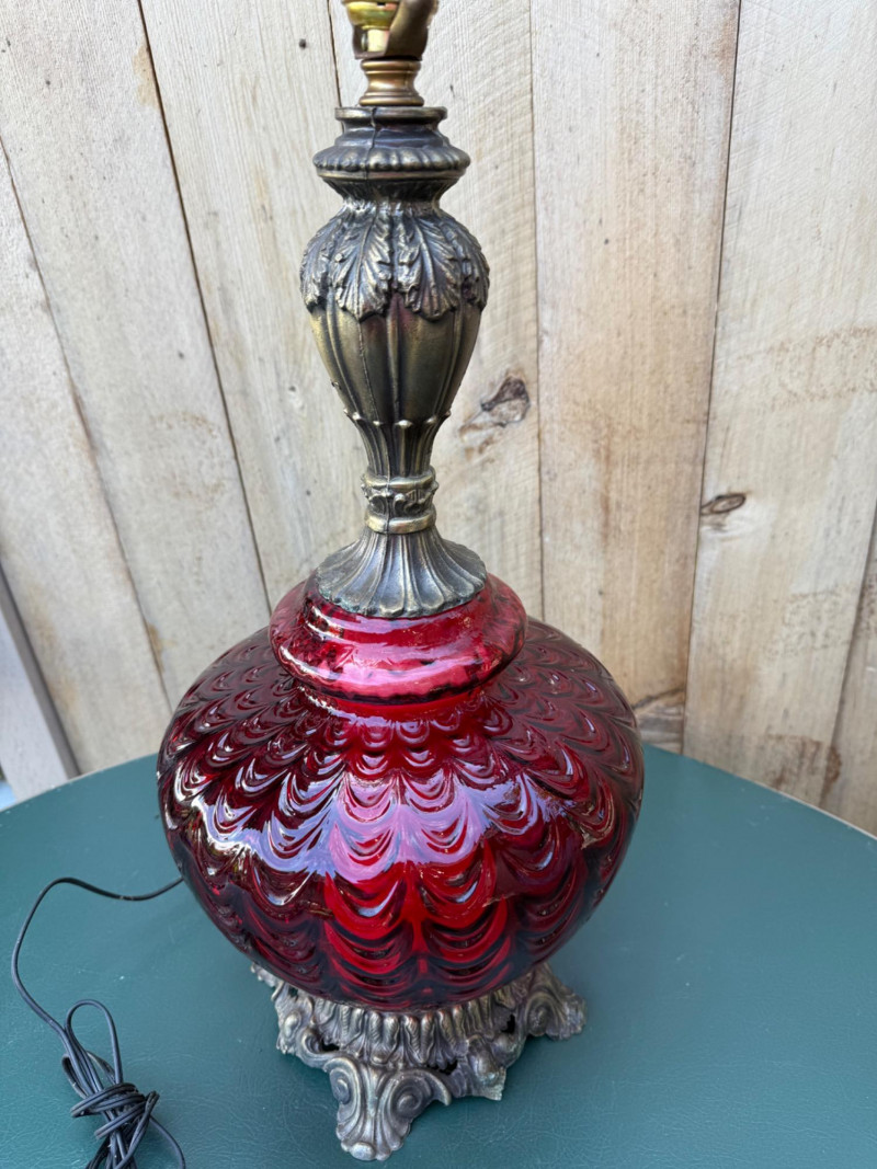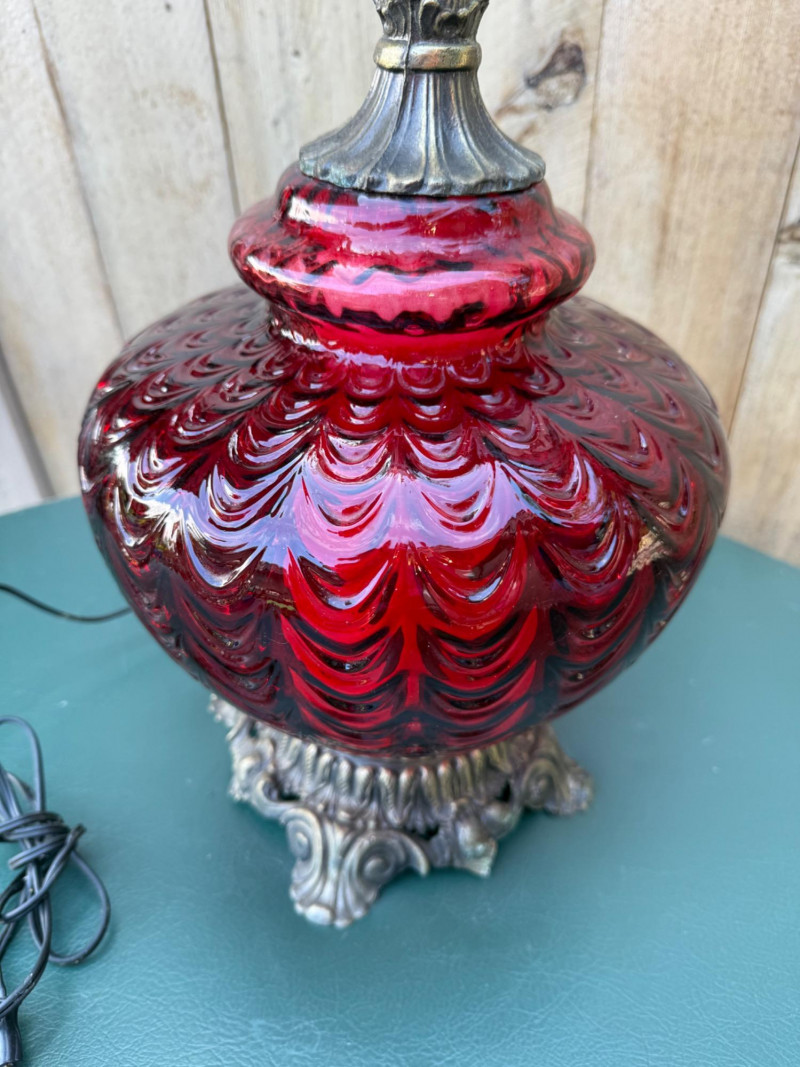 Vintage Hollywood Regency Style Ruby Red Swirl Glass Table Lamp 21" This is a vintage table lamp in the Hollywood Regency style, featuring a rich ruby red glass body with a distinctive raised swirl pattern throughout. It sits on a sculpted metal base with four feet and has an ornate metal neck and socket assembly.