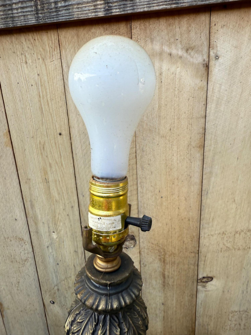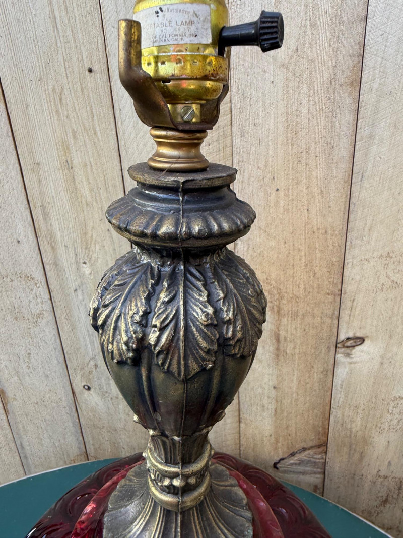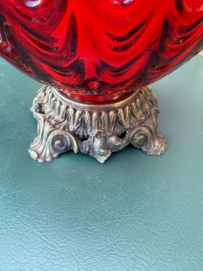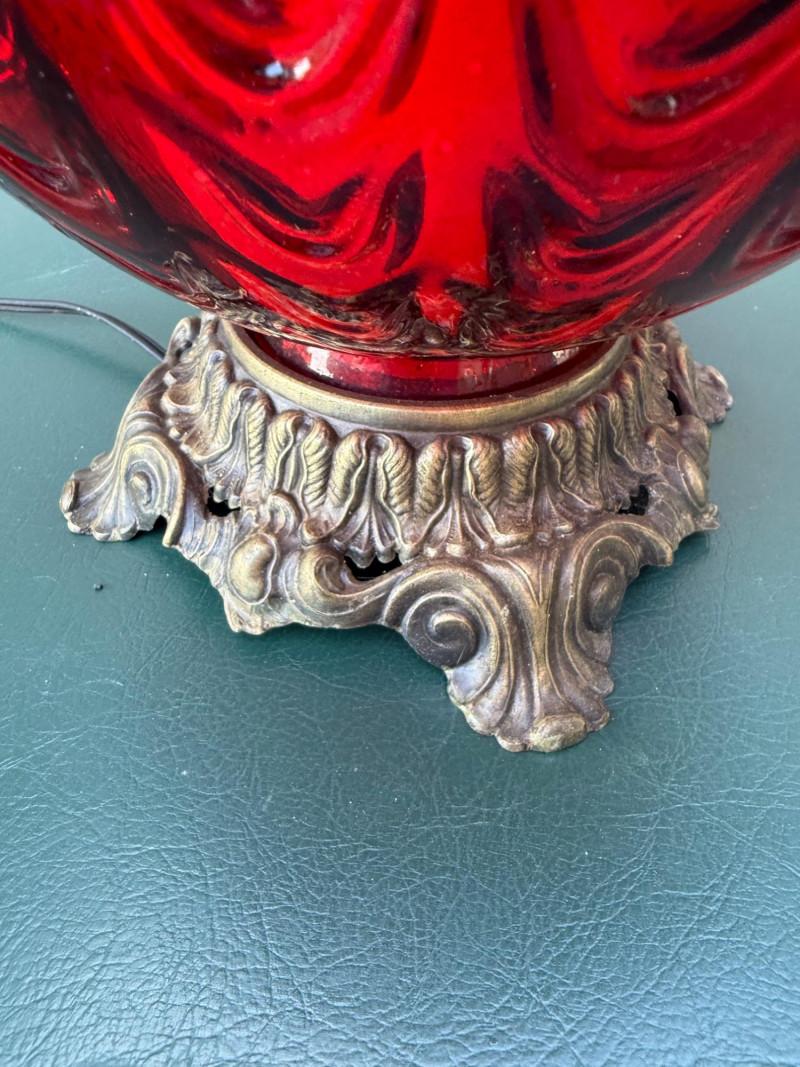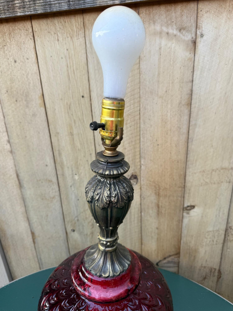 Vintage Hollywood Regency Style Ruby Red Swirl Glass Table Lamp 21" This is a vintage table lamp in the Hollywood Regency style, featuring a rich ruby red glass body with a distinctive raised swirl pattern throughout. It sits on a sculpted metal base with four feet and has an ornate metal neck and socket assembly.