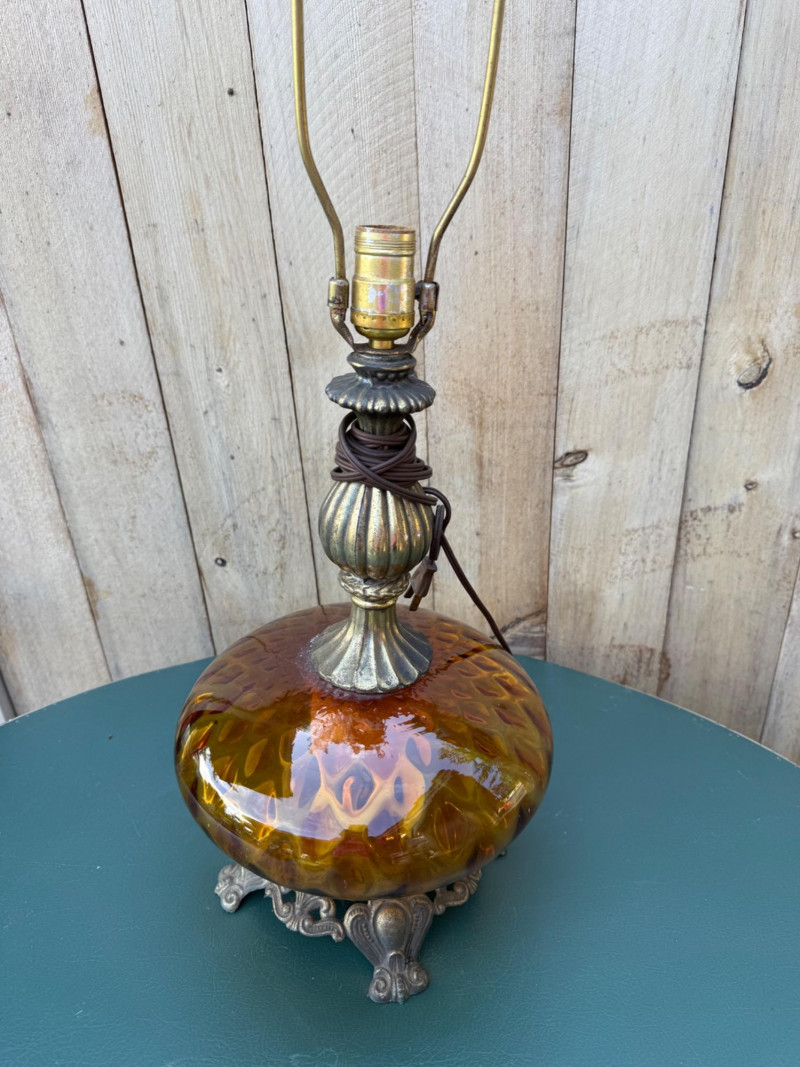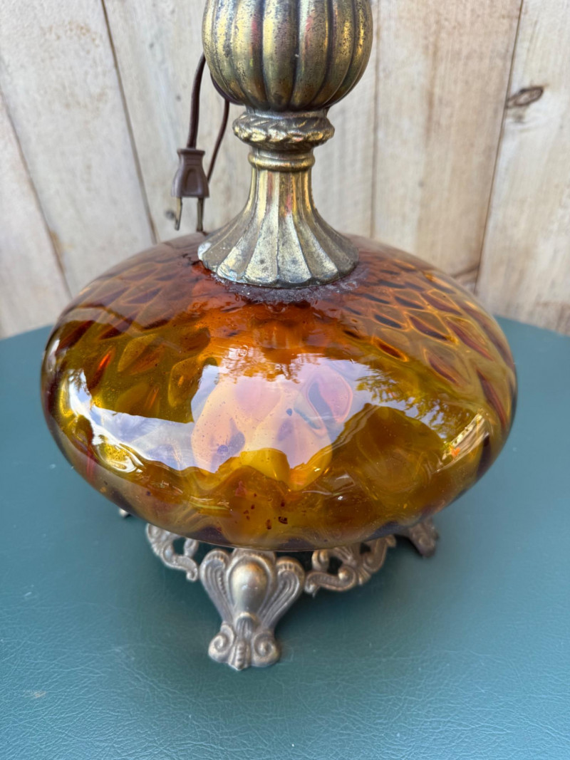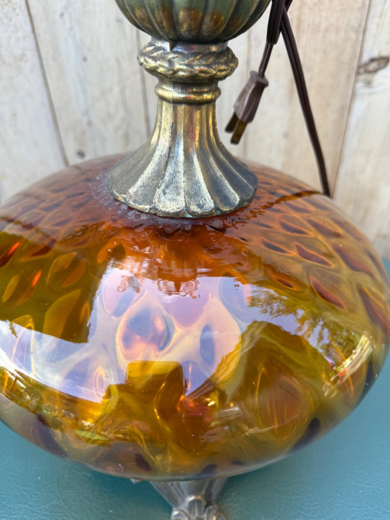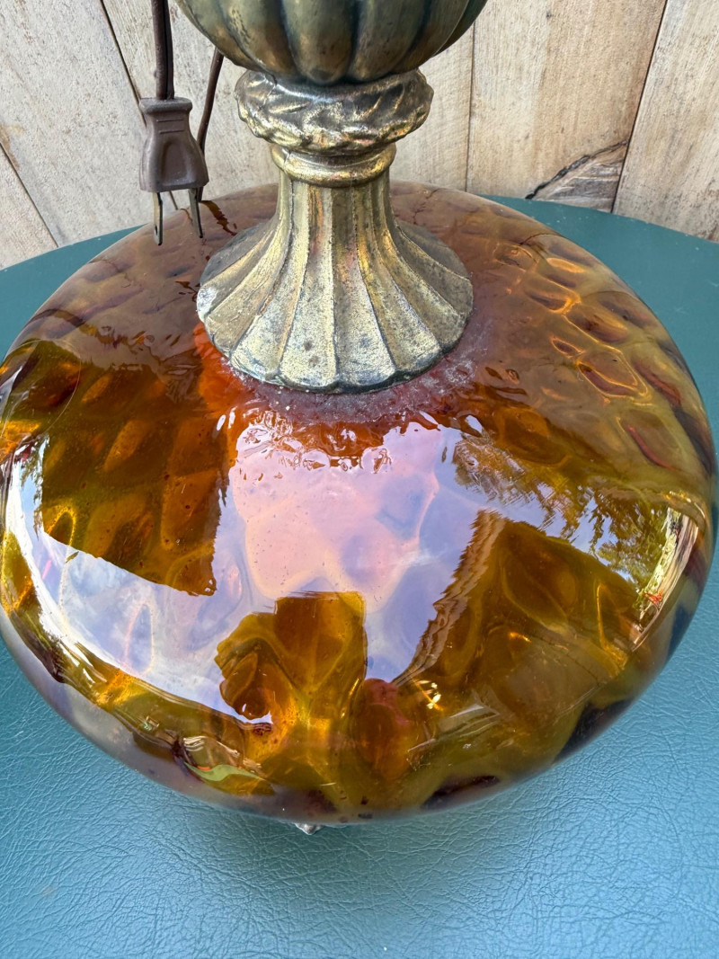 Vintage 1970s Hollywood Regency Style Amber Optic Glass Lamp This vintage table lamp embodies the 1970s Hollywood Regency style. It features a large, distinctive amber optic glass body in a flying saucer shape. The lamp is complemented by an antique ornate brass finish on its metal components.