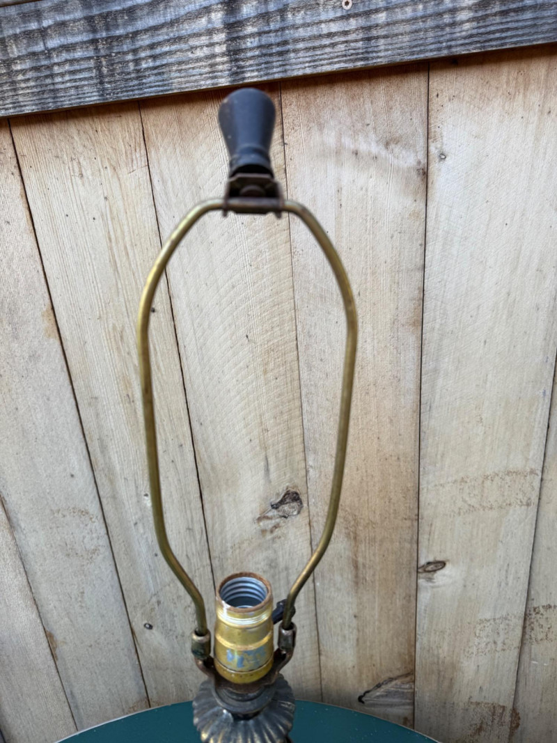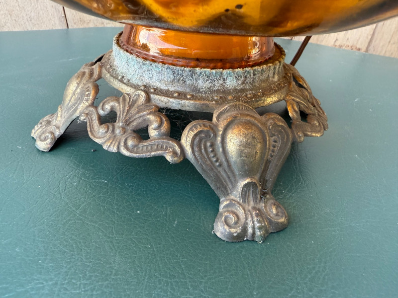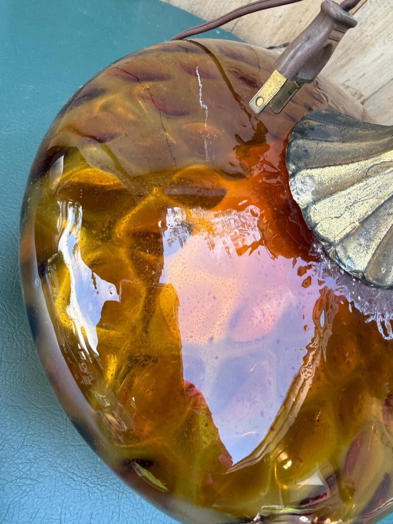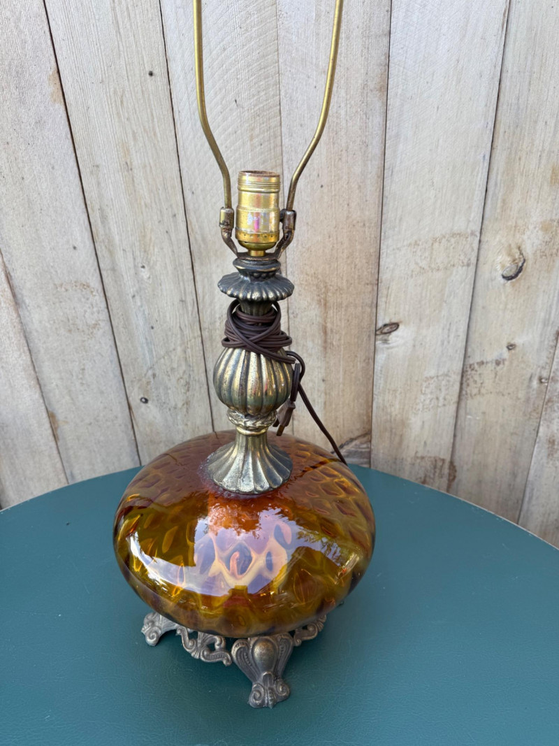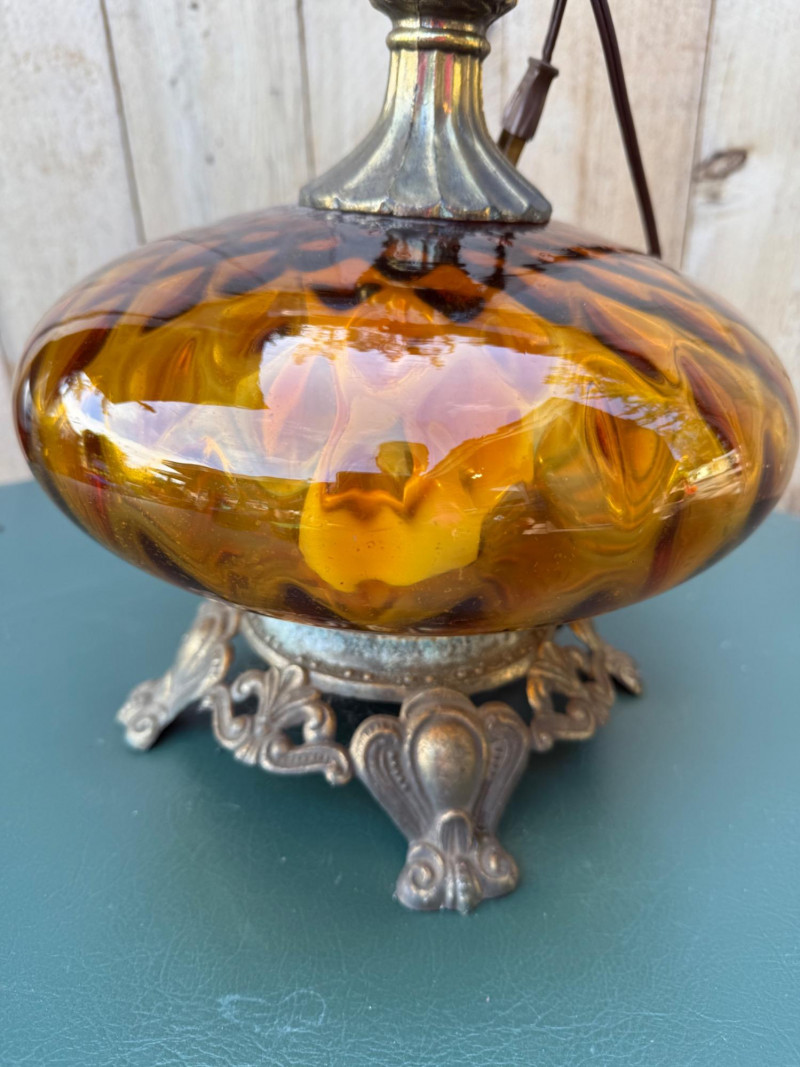 Vintage 1970s Hollywood Regency Style Amber Optic Glass Lamp This vintage table lamp embodies the 1970s Hollywood Regency style. It features a large, distinctive amber optic glass body in a flying saucer shape. The lamp is complemented by an antique ornate brass finish on its metal components.