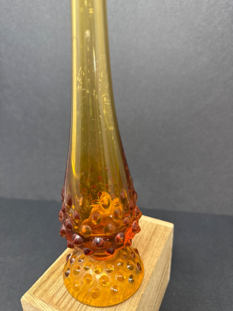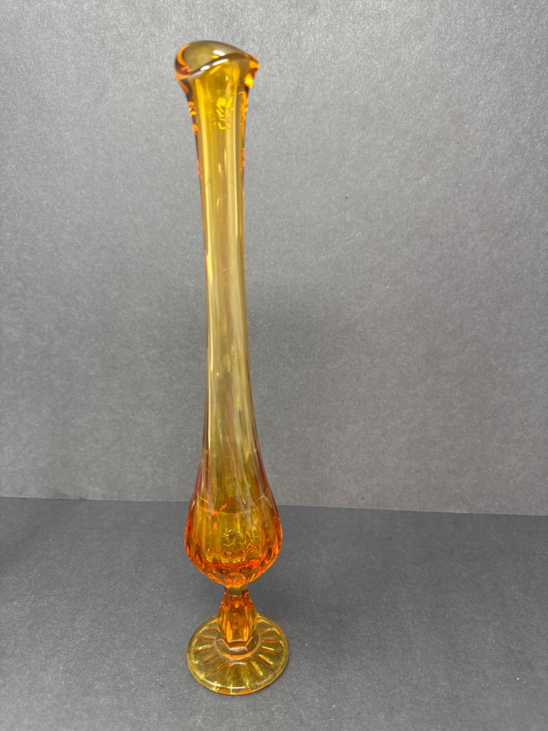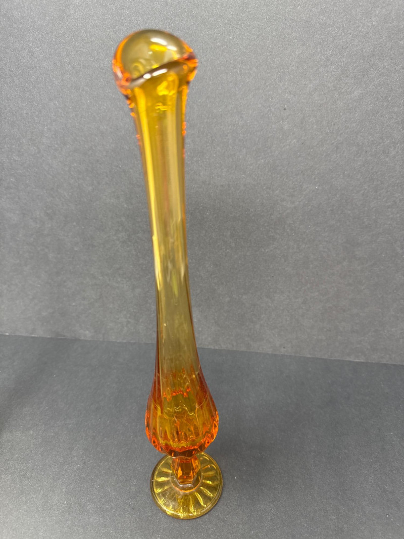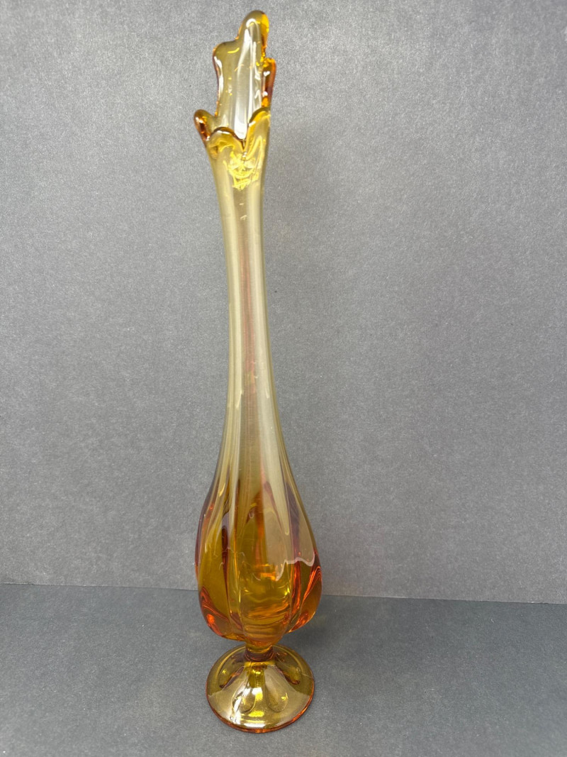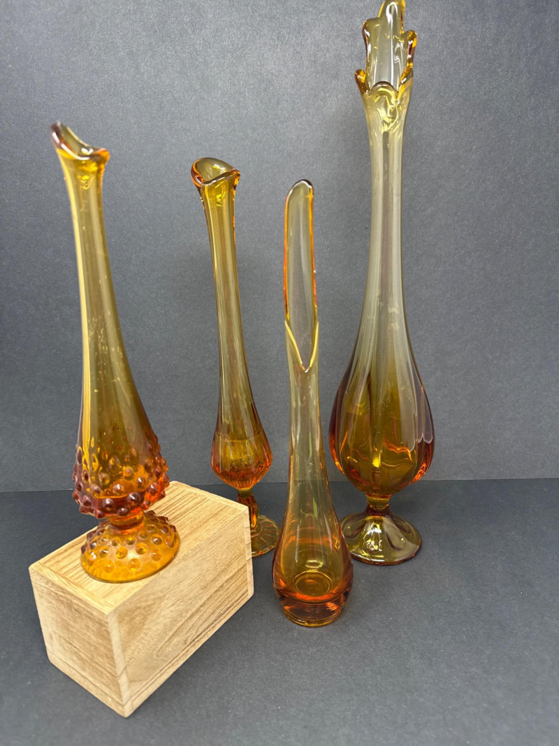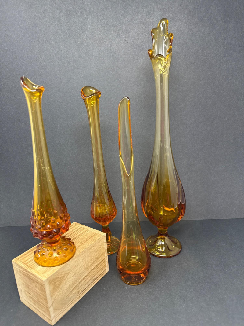 Set of 4 Vintage Amber Swung Glass Vases, 10”–17” Tall Four amber swung glass vases with heights ranging from 10″ to 17″. Each vase has a slender bud-style top and flared base. Sold as a set, display-ready. Quantity: 4 vases Heights: 17″, 14″, 12″, 10″ Material: blown amber-tone glass No visible chips or cracks