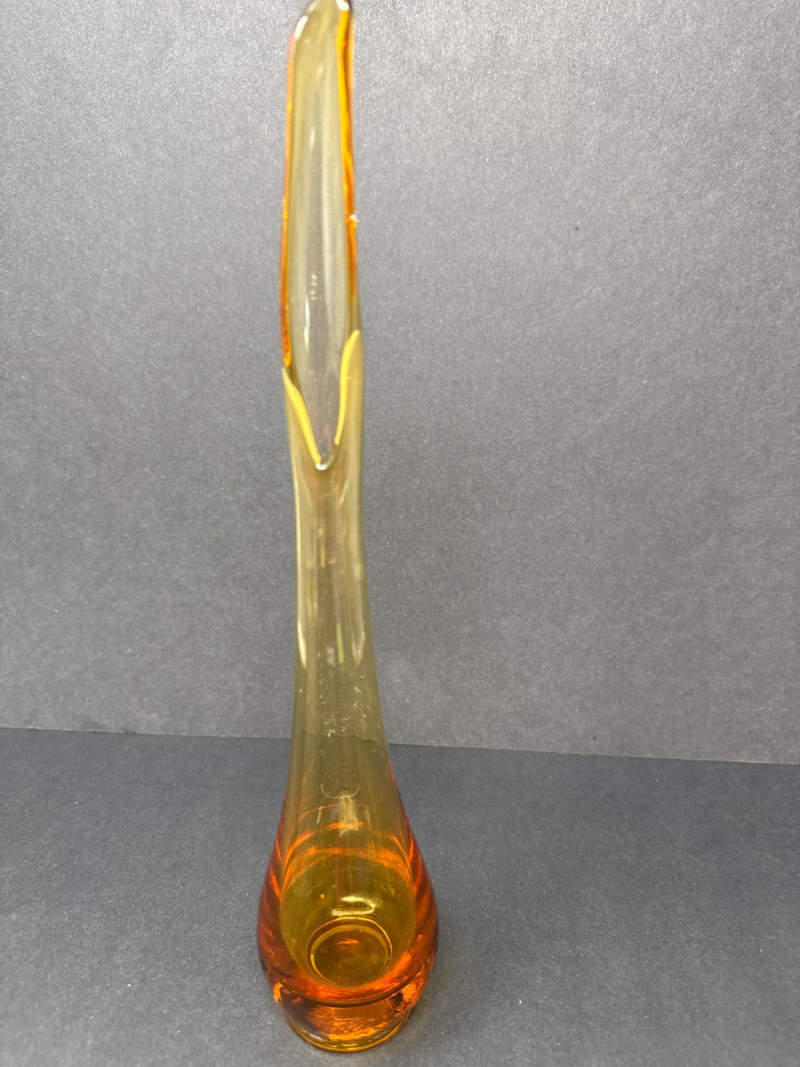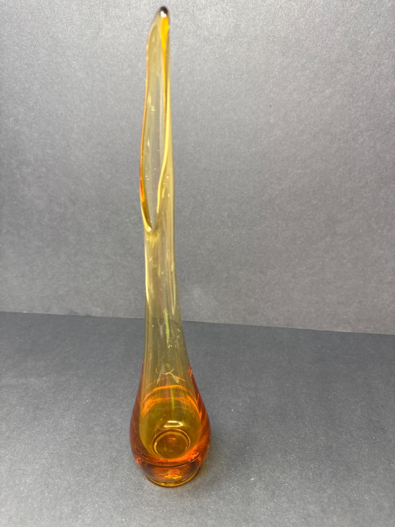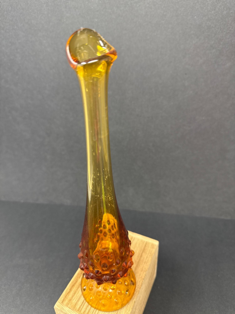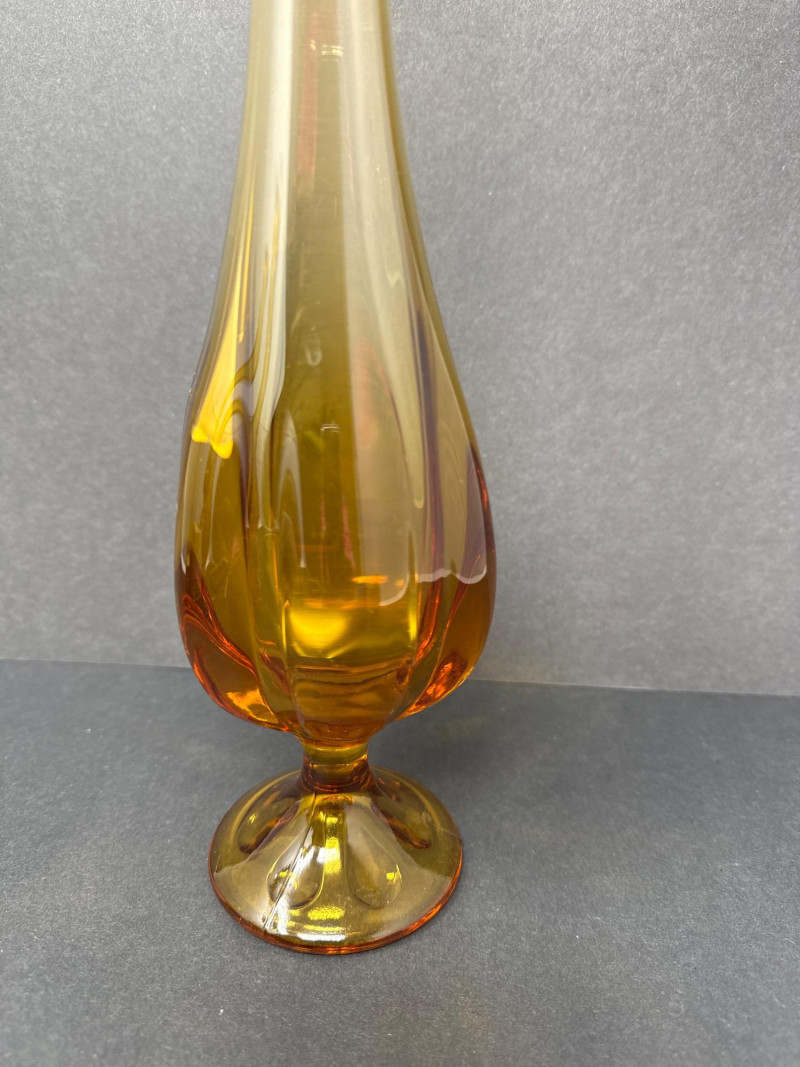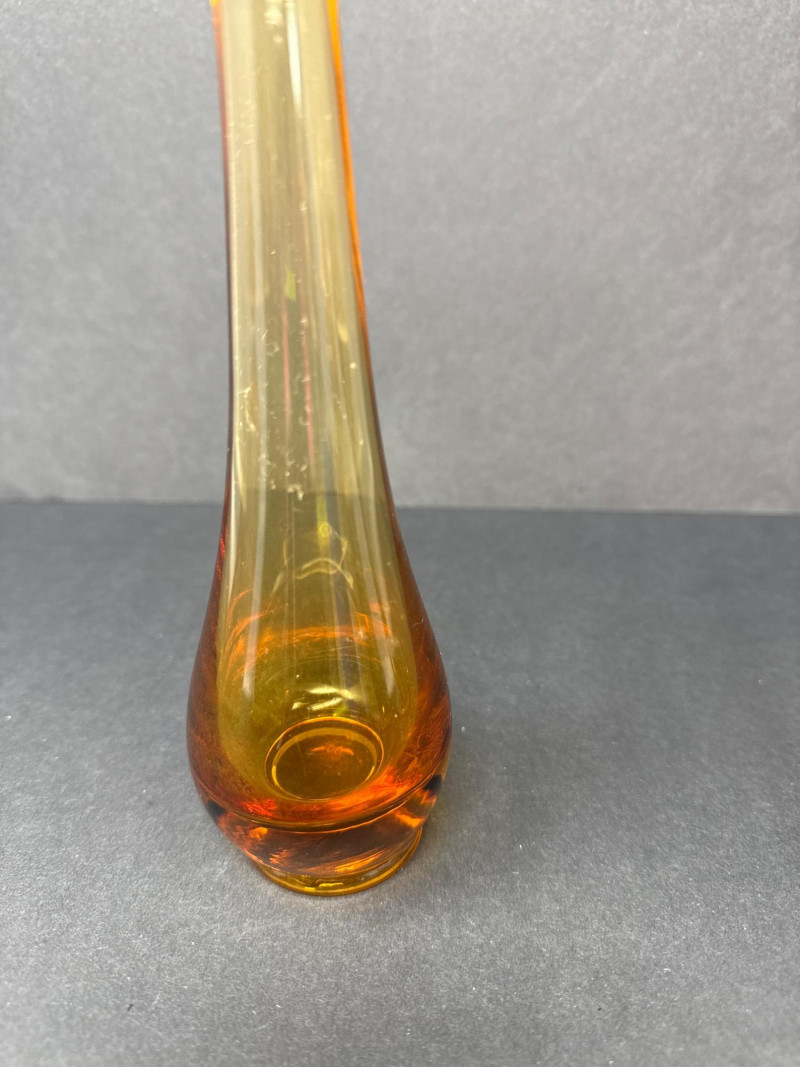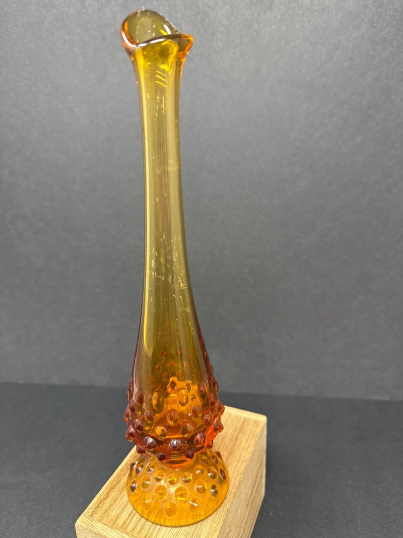 Set of 4 Vintage Amber Swung Glass Vases, 10”–17” Tall Four amber swung glass vases with heights ranging from 10″ to 17″. Each vase has a slender bud-style top and flared base. Sold as a set, display-ready. Quantity: 4 vases Heights: 17″, 14″, 12″, 10″ Material: blown amber-tone glass No visible chips or cracks