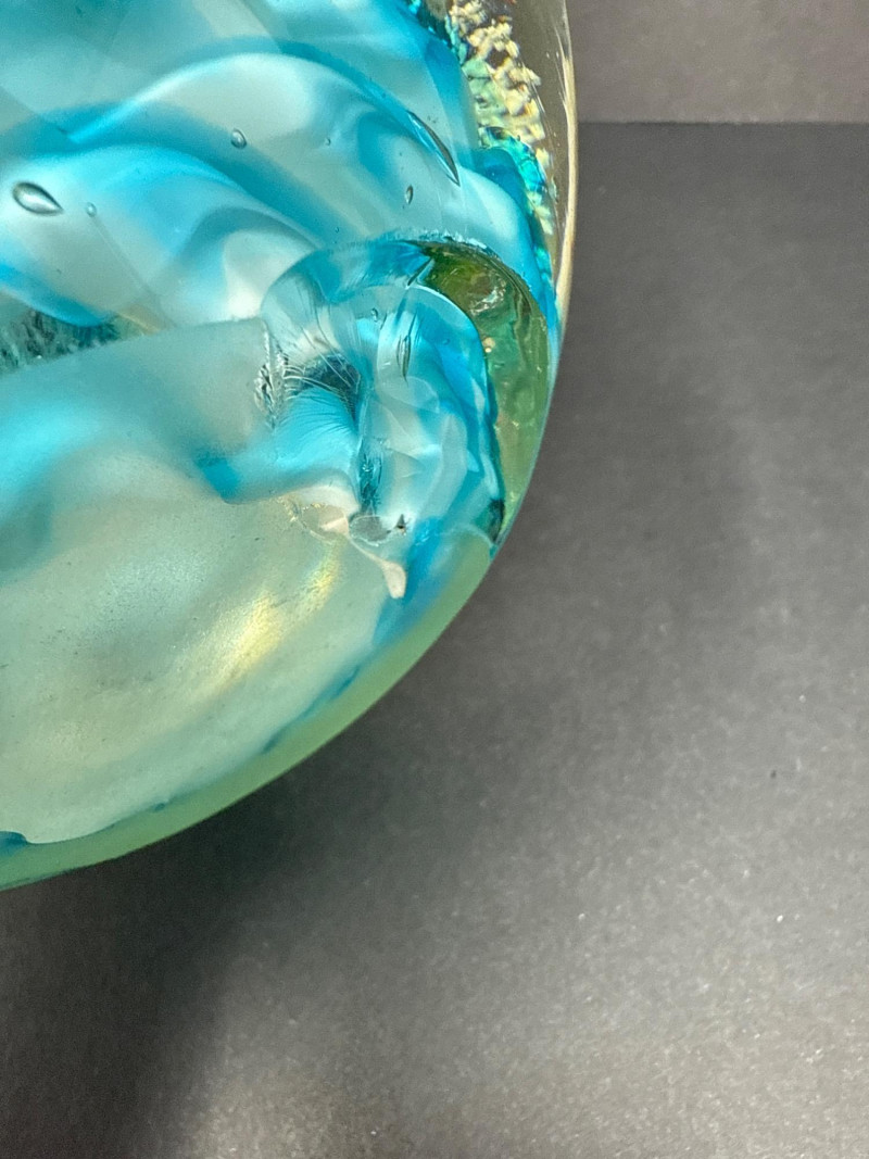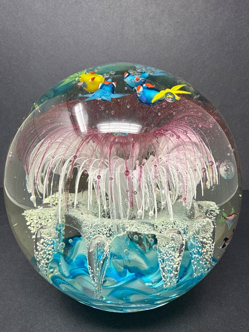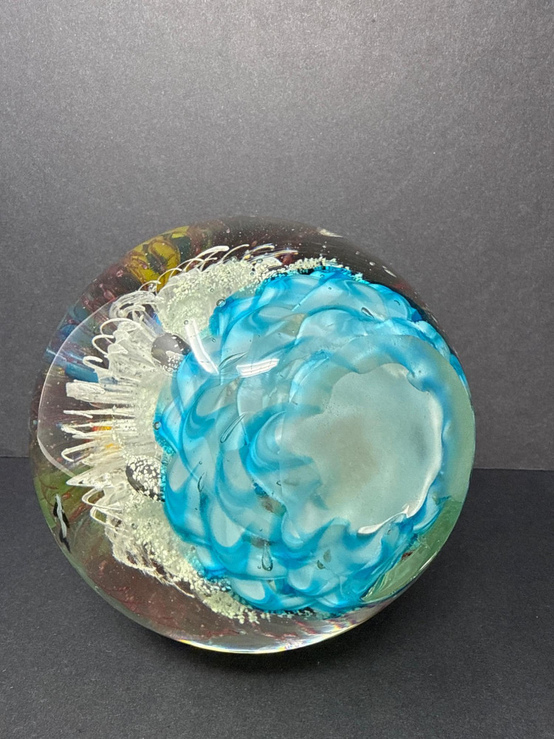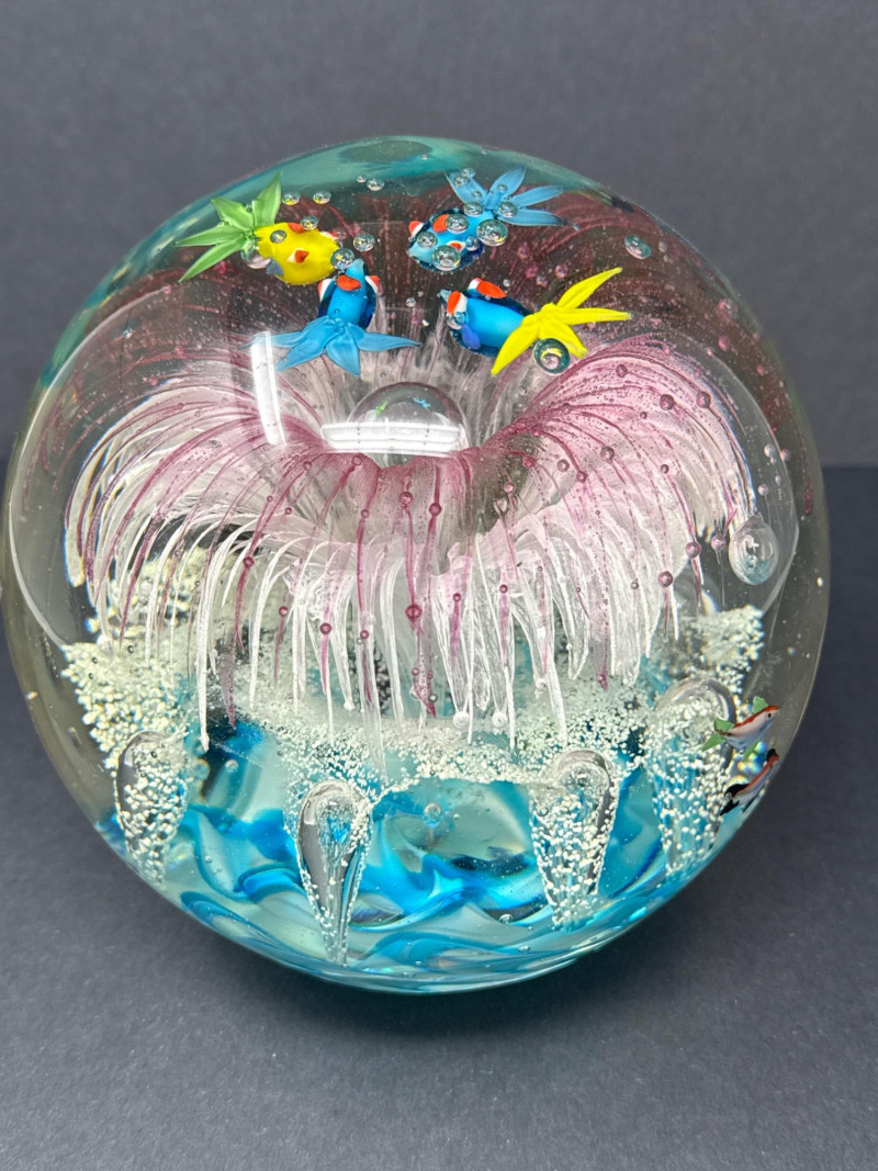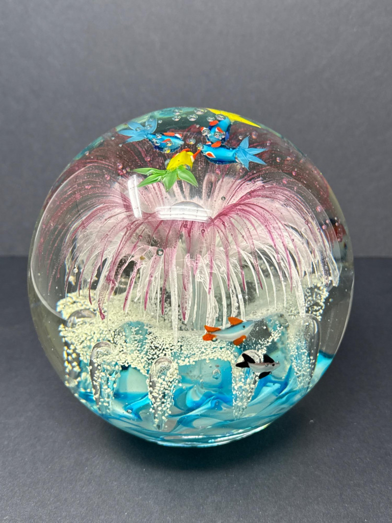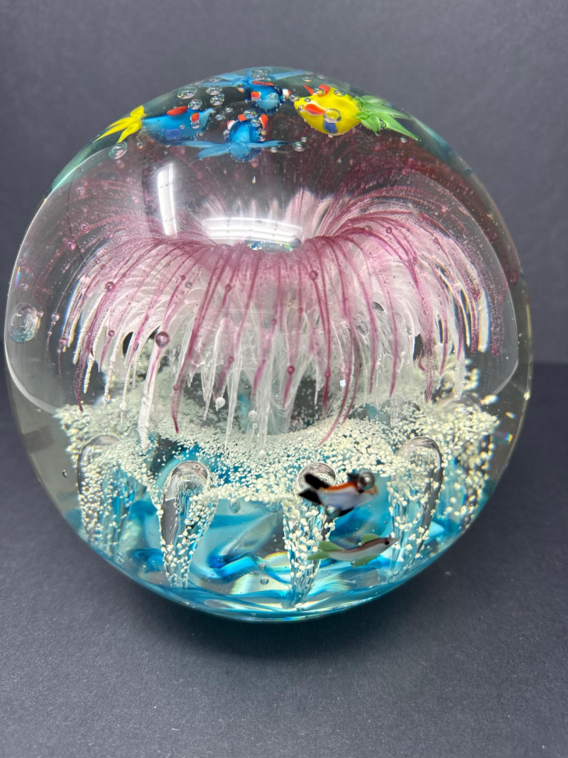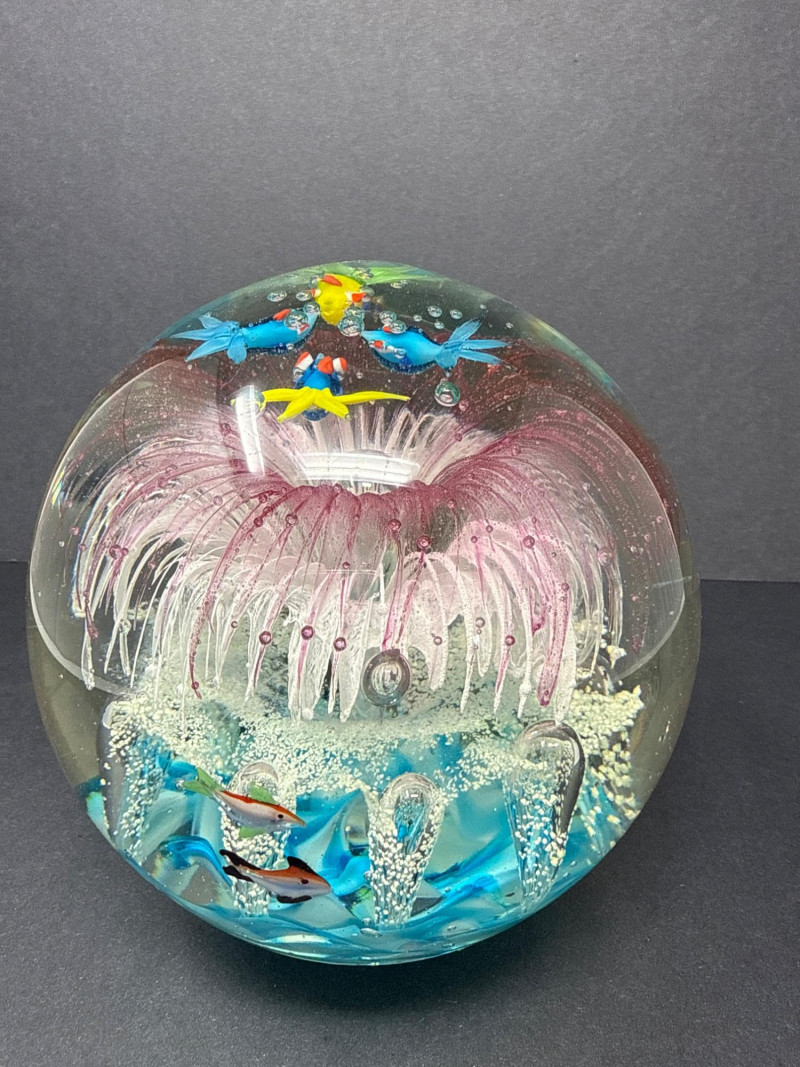 7" Glass Aquatic Paperweight with Fish & Floral Burst Diameter: 7″ Please note: there is a significant chip on the underside that isn’t visible unless you flip it over.