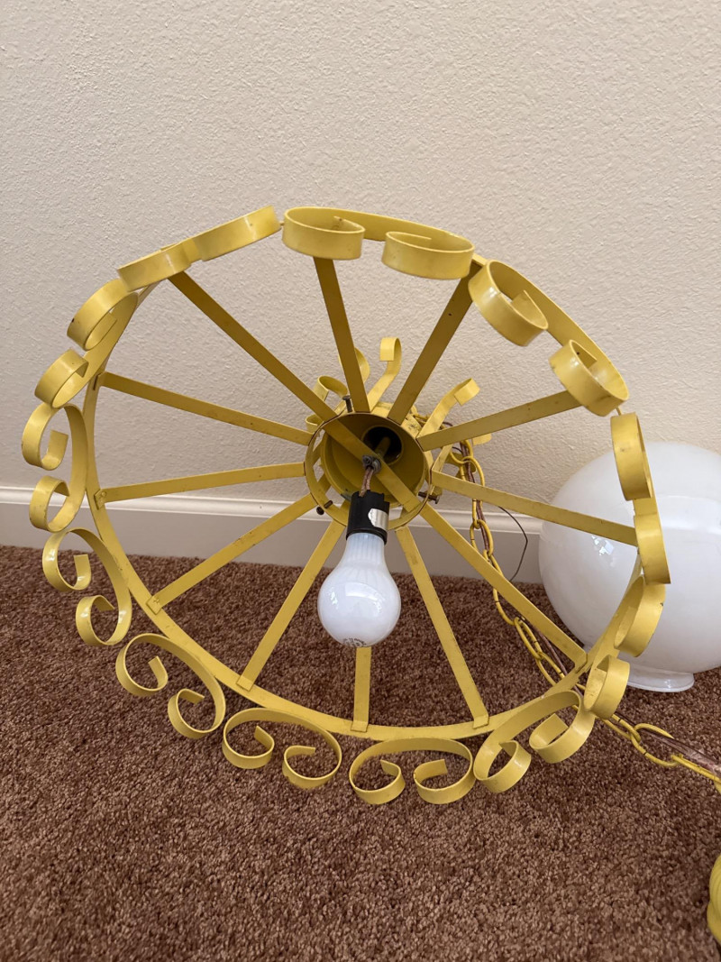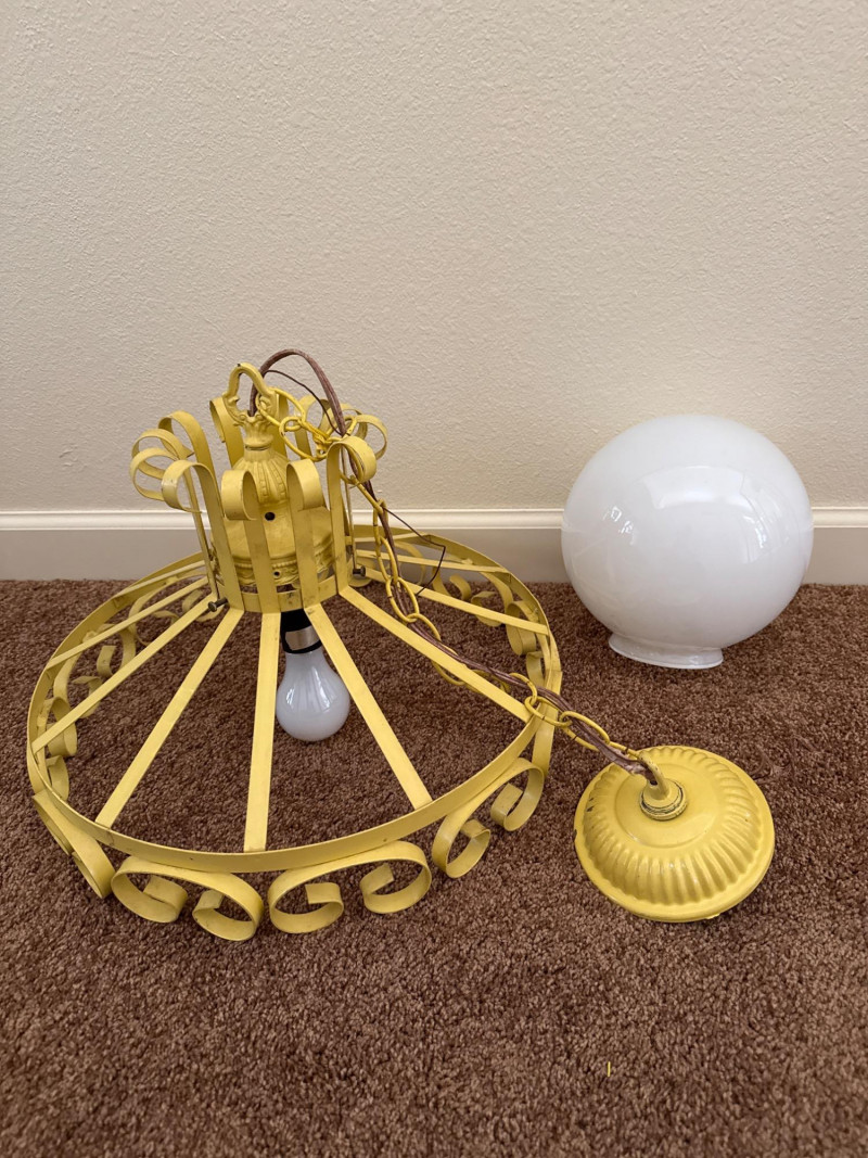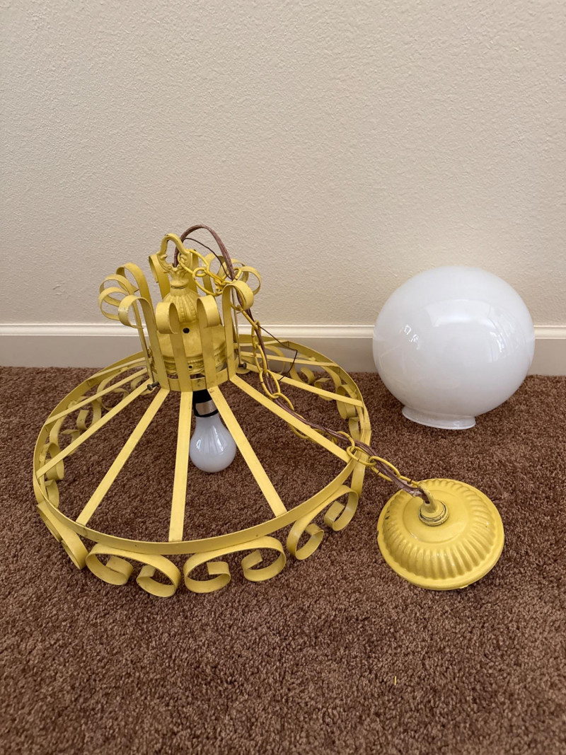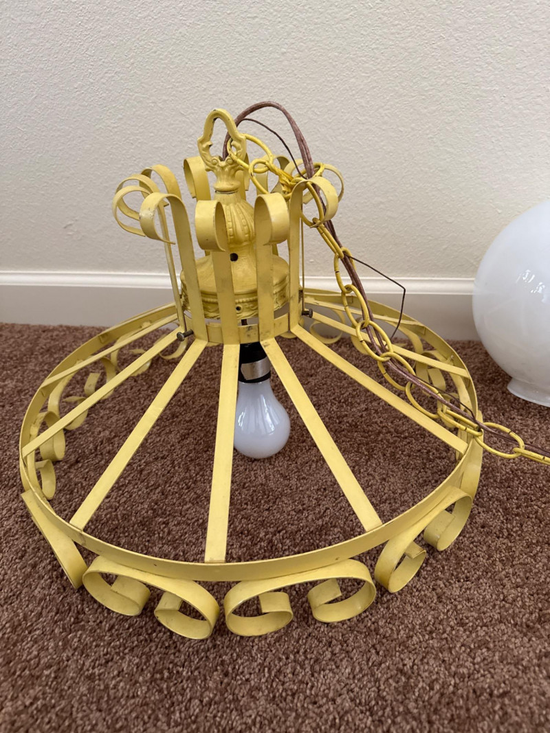 This yellow wrought iron chandelier features a scrolling flower‐like frame and includes a removable white glass globe shade. It measures 16″ in diameter and 12″ tall from frame top to bottom. The hanging canopy shows light surface rust and the frame has minor paint chips from age. Diameter: 16″; Height: 12″ Yellow painted wrought iron frame with curled scroll accents Includes white glass globe shade (removable) Canopy interior shows surface rust; frame has minor paint loss Sold as-is; wiring untested.