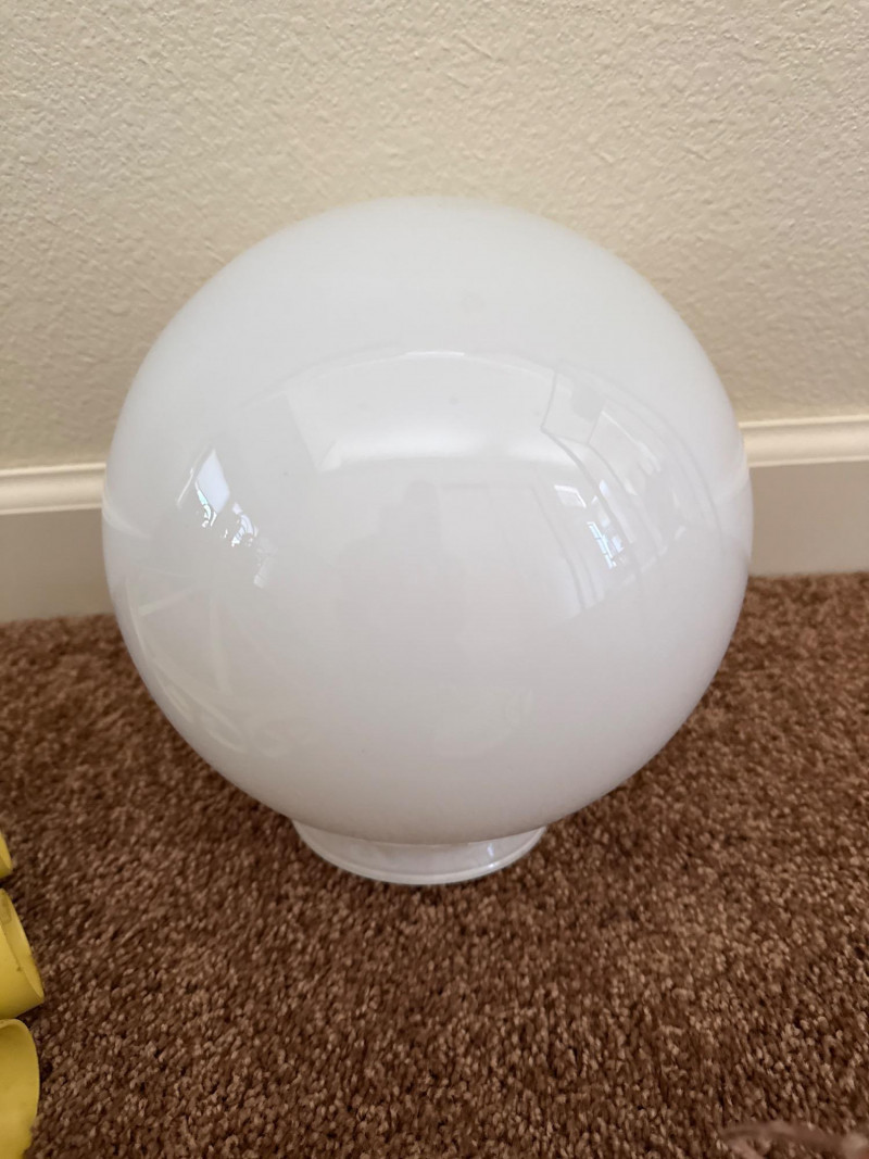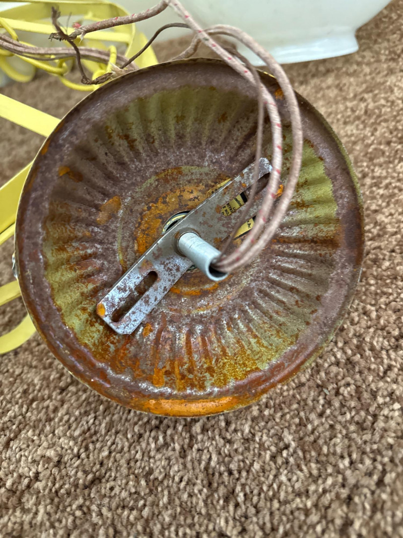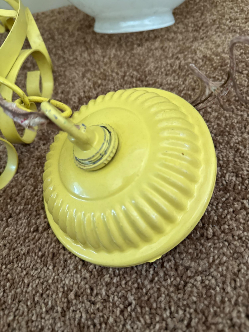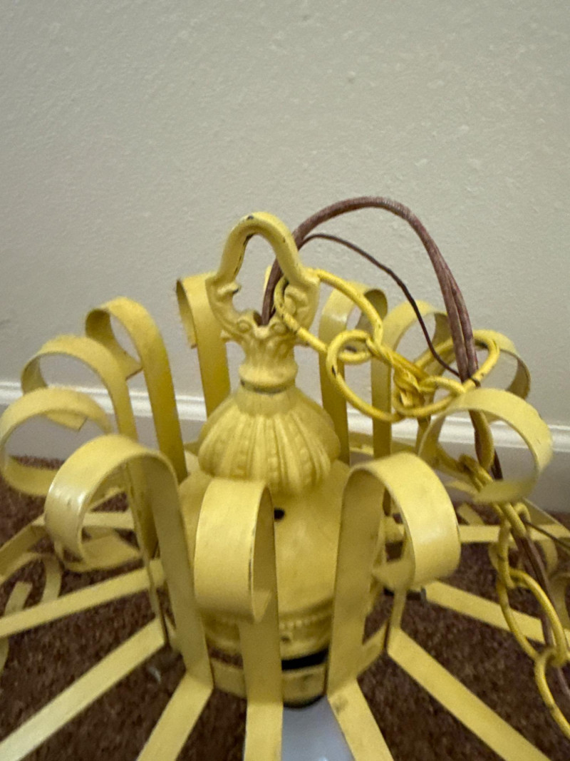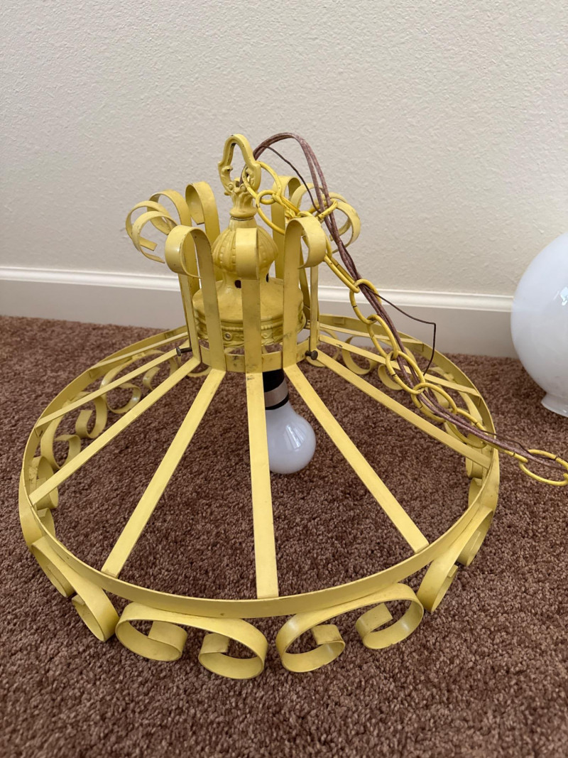 This yellow wrought iron chandelier features a scrolling flower‐like frame and includes a removable white glass globe shade. It measures 16″ in diameter and 12″ tall from frame top to bottom. The hanging canopy shows light surface rust and the frame has minor paint chips from age. Diameter: 16″; Height: 12″ Yellow painted wrought iron frame with curled scroll accents Includes white glass globe shade (removable) Canopy interior shows surface rust; frame has minor paint loss Sold as-is; wiring untested.