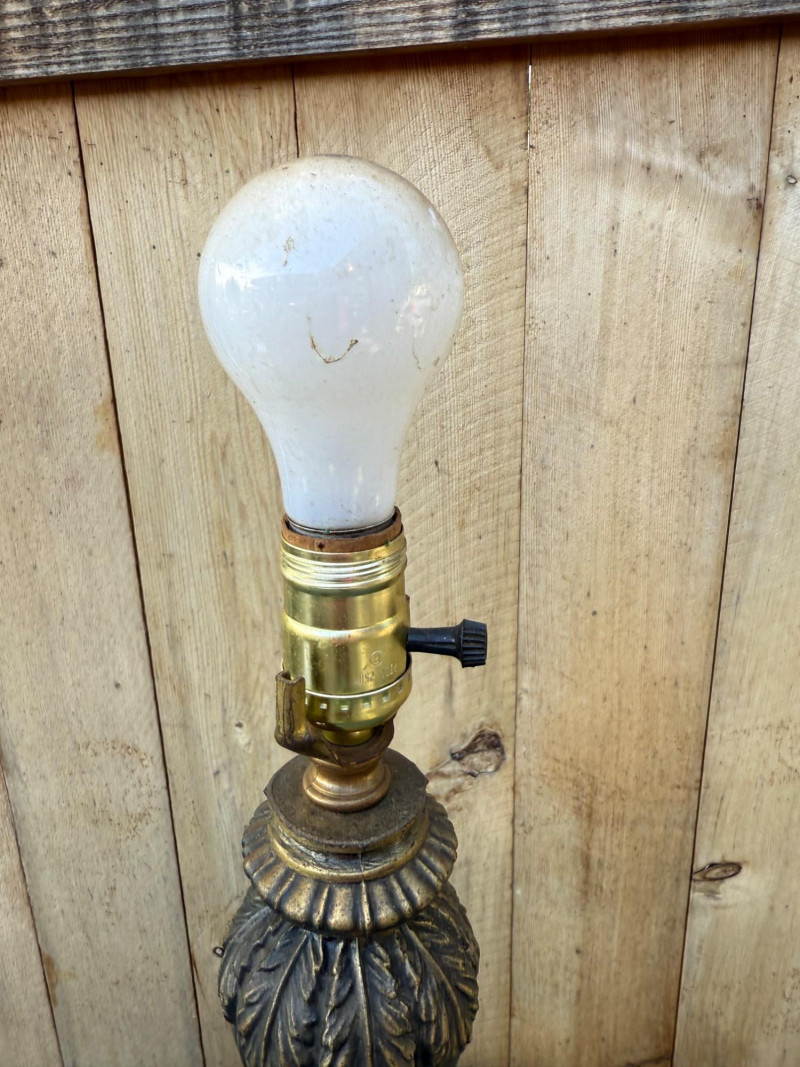 This vintage table lamp features an amber-and-brown swirl glass body mounted on an ornate metal base with decorative neck and socket. The lamp stands 21″ tall with a 9″ diameter and uses a standard bulb. Its molded swirl pattern reflects mid-century glass styling. Glass body with amber and brown swirl finish Ornate cast metal base and decorative metal fittings Measures 21″ H × 9″ W Electrical cord present (function not tested) Sold as-is