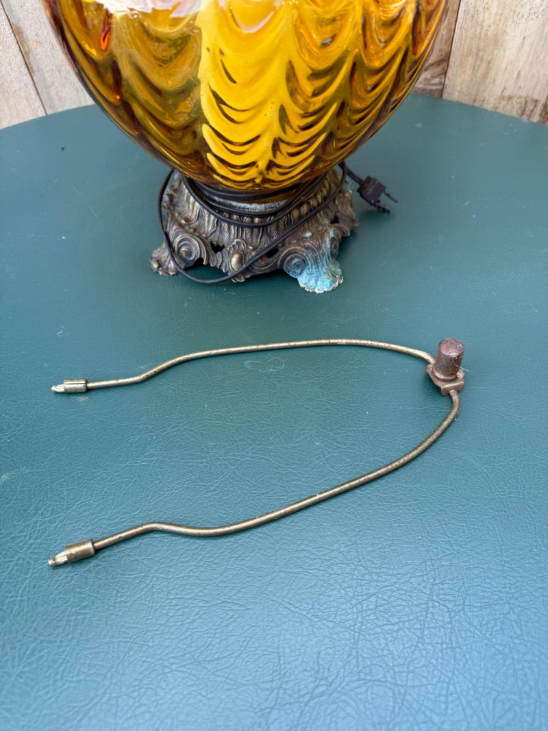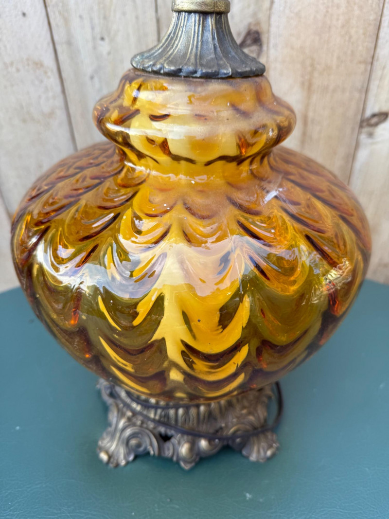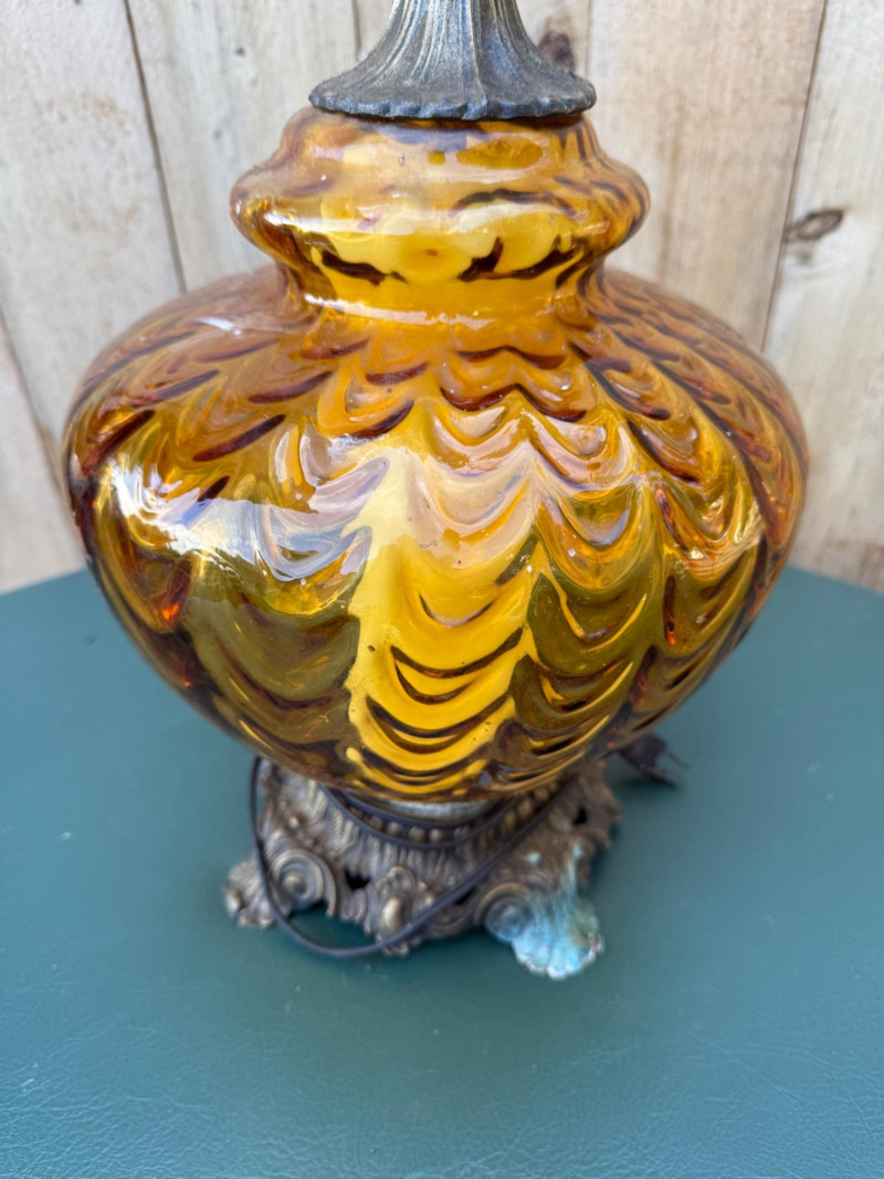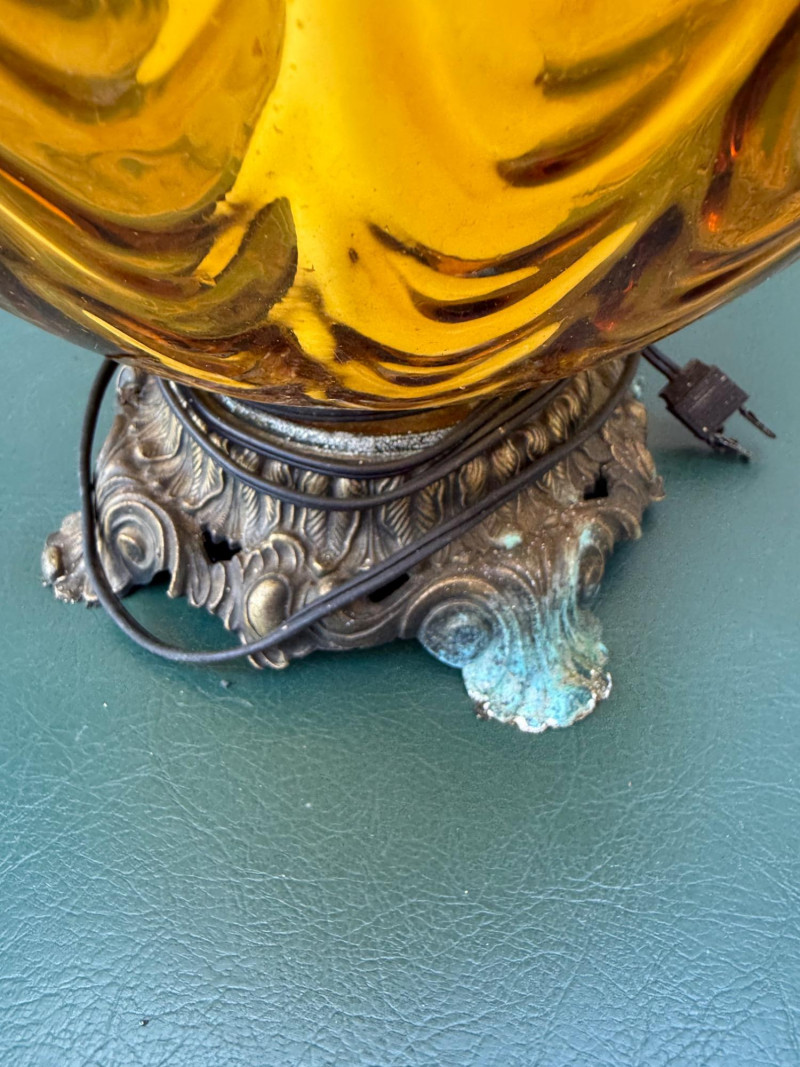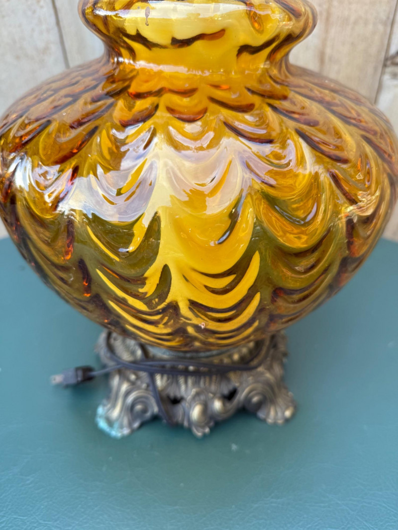 Vintage Amber Swirl Glass Lamp on Ornate Metal Base