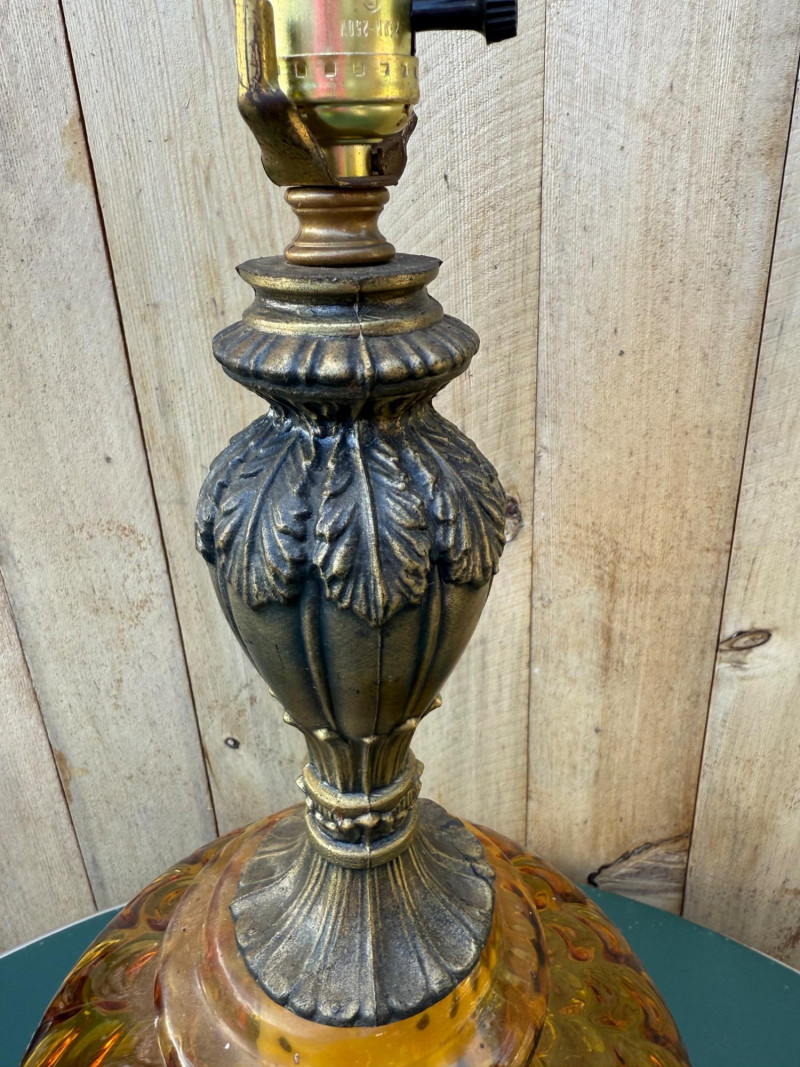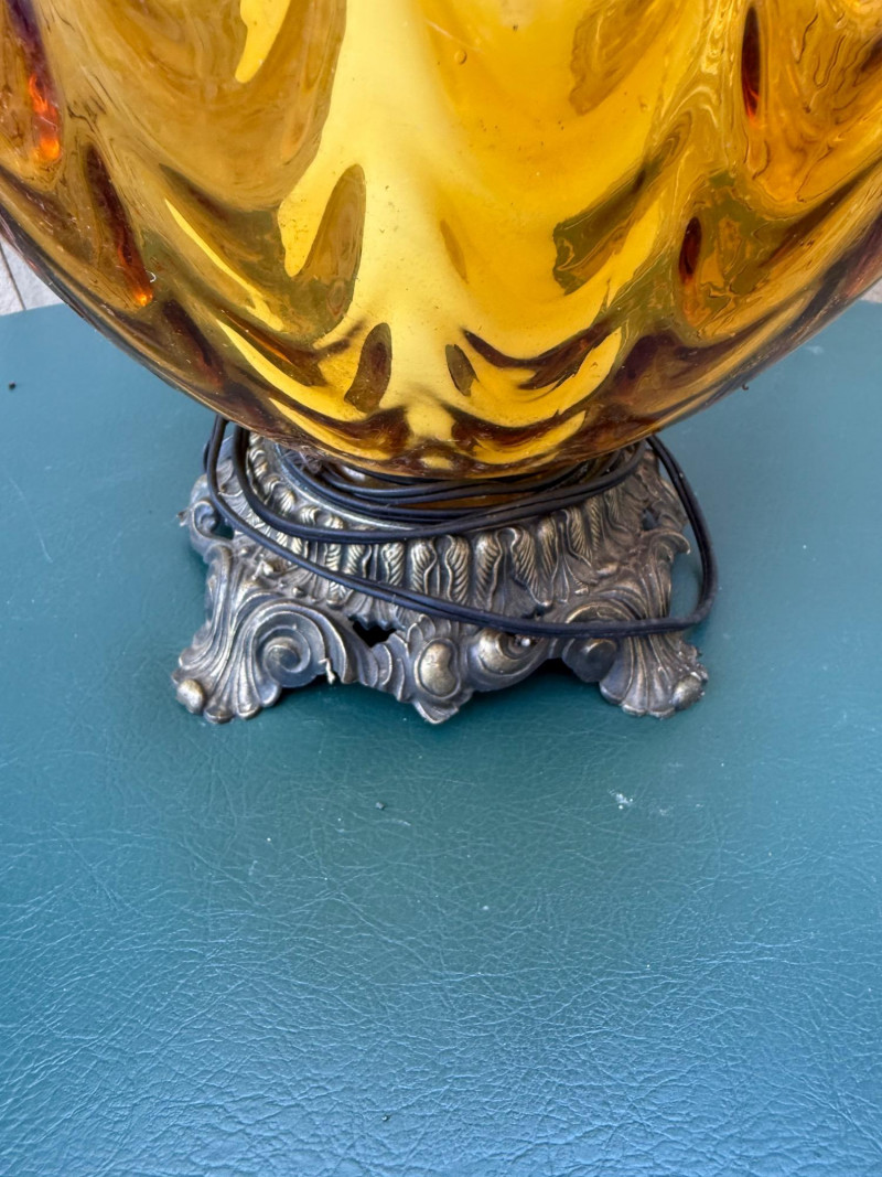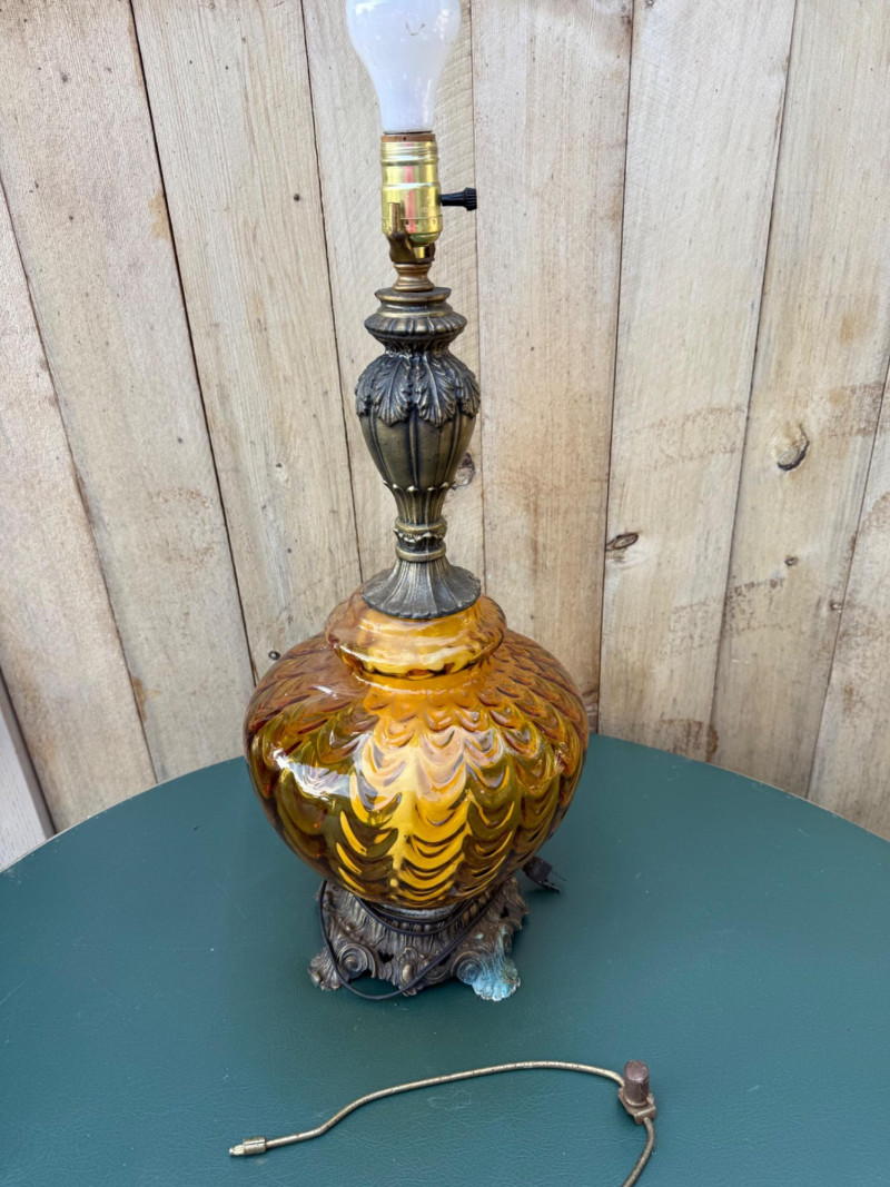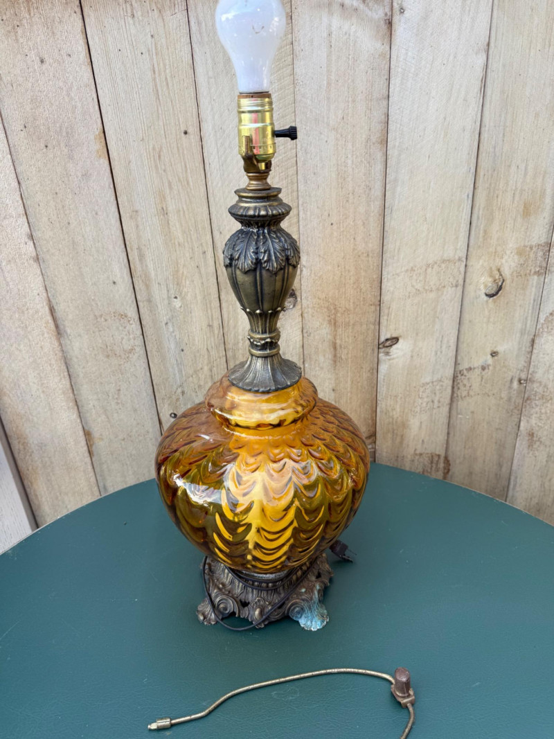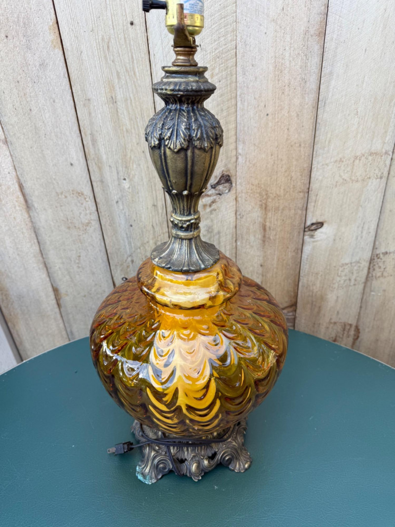 Lot # 57 - Vintage Amber Swirl Glass Lamp on Ornate Metal Base