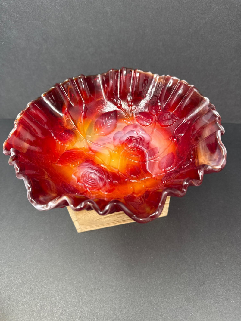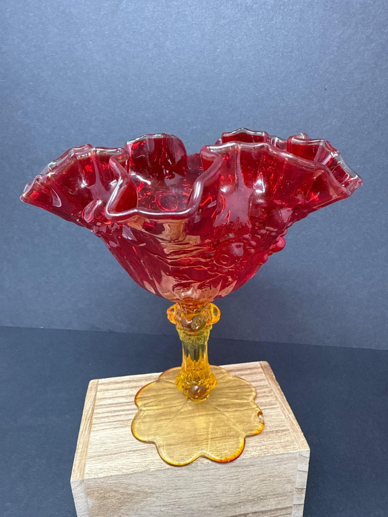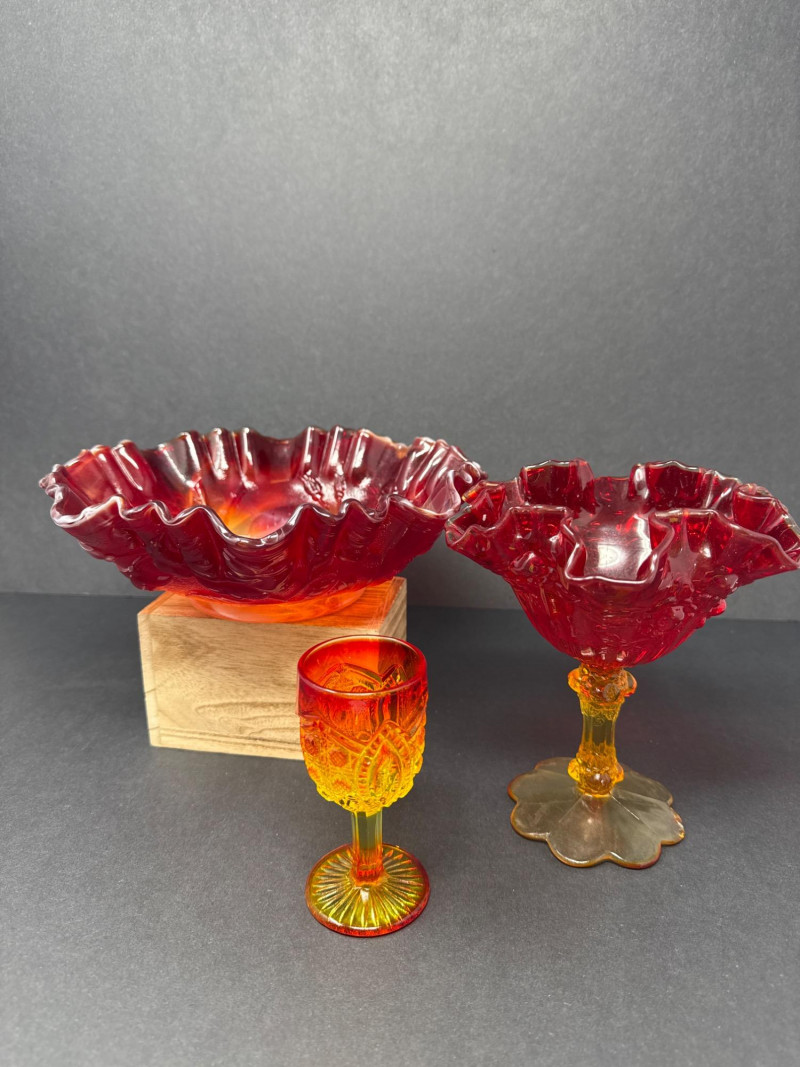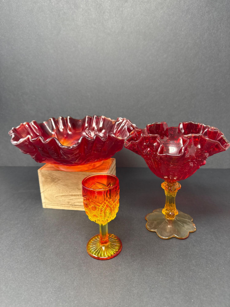 This lot includes three vintage amberina glass pieces: a Victorian Imperial Glass bowl with raised rose embossing, a Fenton ruffled pedestal compote, and an amberina cordial/sherry glass. Each item displays the classic red-to-golden amber gradient and raised patterns characteristic of antique amberina glass. Victorian Imperial Glass bowl with embossed rose motif and crimped rim Measures 9″ diameter × 3″ tall Fenton amberina glass compote with ruffled edge and pedestal base Measures 6½″ tall × 4½″ diameter Amberina cordial/sherry glass with raised diamond pattern Measures 4″ tall All pieces show the red-to-amber color fade and detailed embossed designs