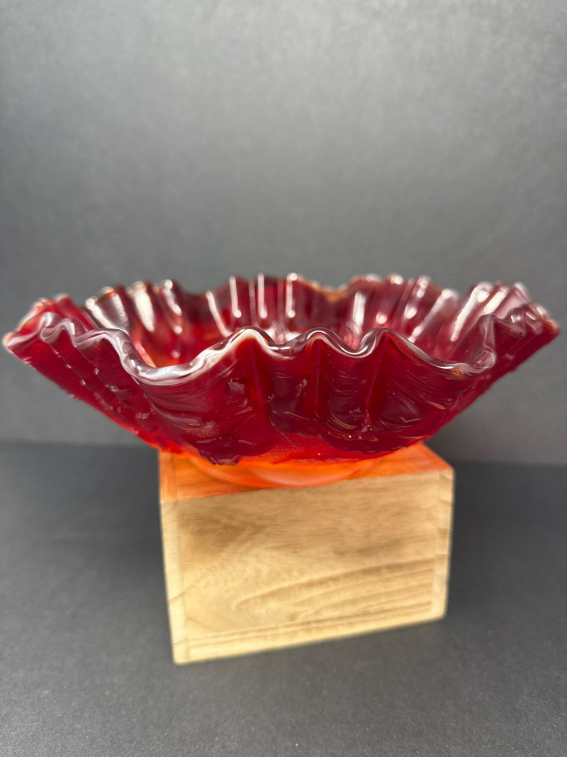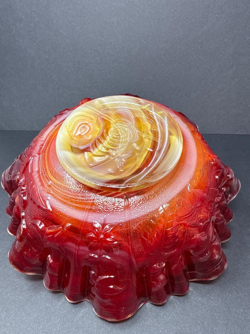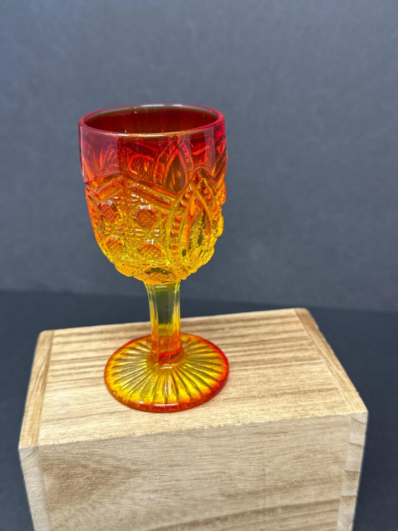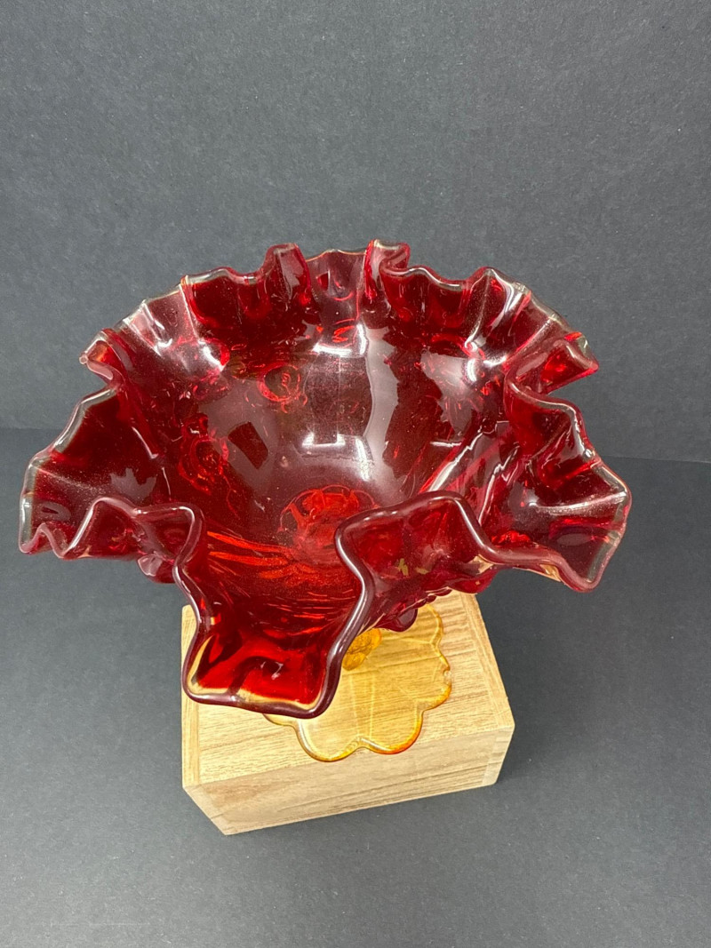 This lot includes three vintage amberina glass pieces: a Victorian Imperial Glass bowl with raised rose embossing, a Fenton ruffled pedestal compote, and an amberina cordial/sherry glass. Each item displays the classic red-to-golden amber gradient and raised patterns characteristic of antique amberina glass. Victorian Imperial Glass bowl with embossed rose motif and crimped rim Measures 9″ diameter × 3″ tall Fenton amberina glass compote with ruffled edge and pedestal base Measures 6½″ tall × 4½″ diameter Amberina cordial/sherry glass with raised diamond pattern Measures 4″ tall All pieces show the red-to-amber color fade and detailed embossed designs