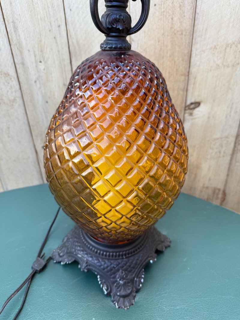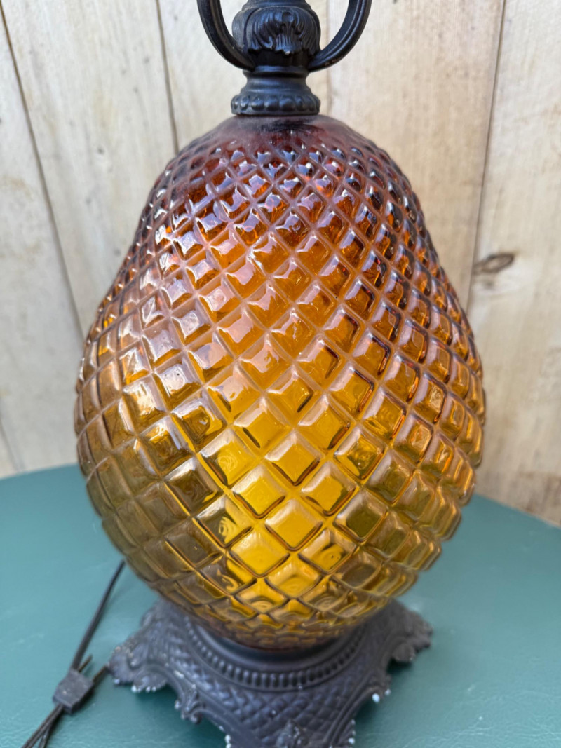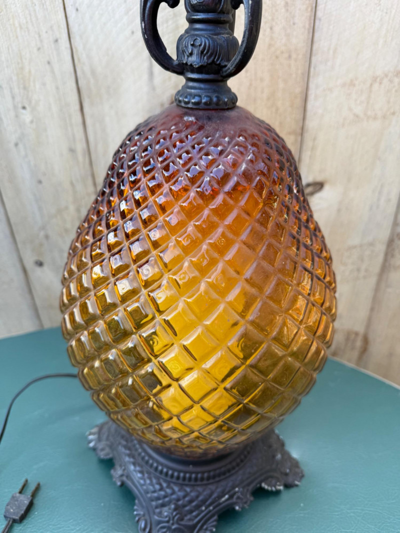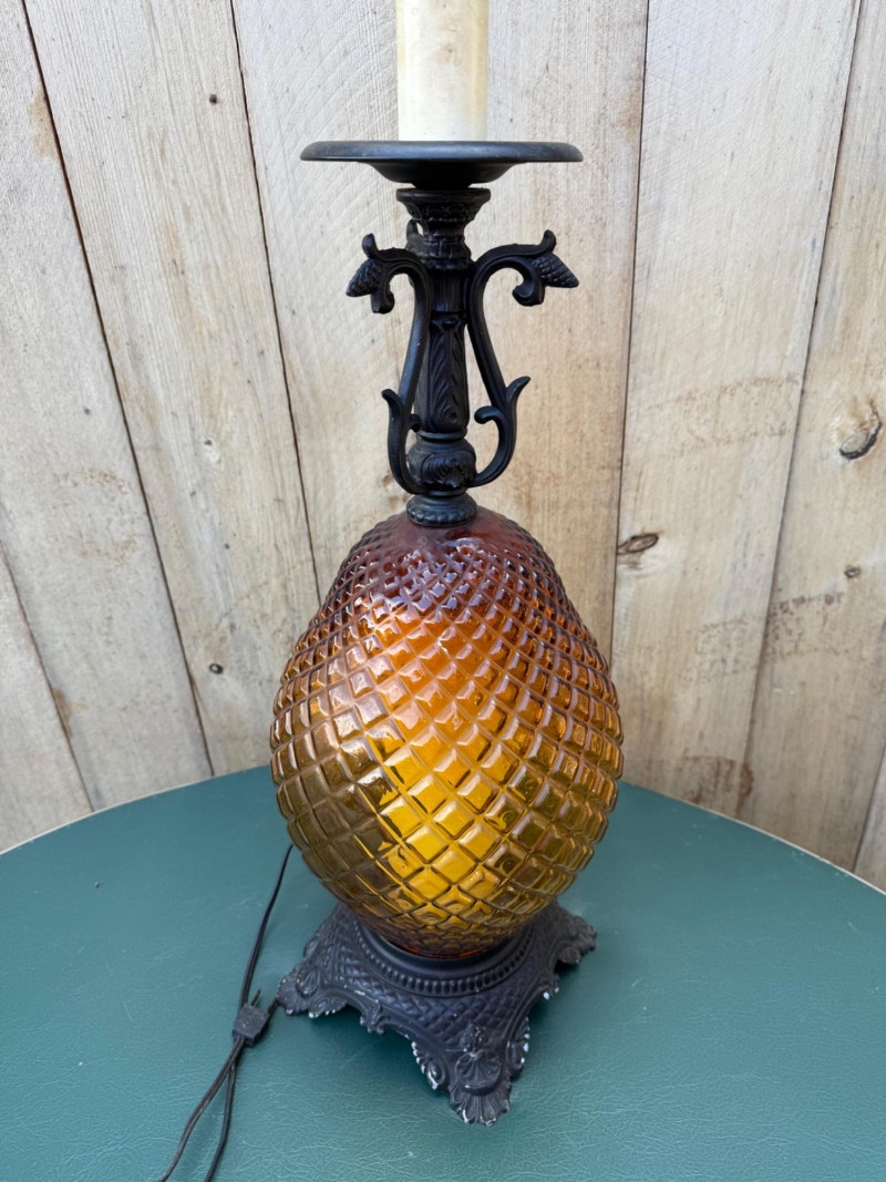 This vintage lamp features an amber-colored, diamond-patterned glass body mounted on an ornate cast metal base and topped with matching metal hardware. The lamp stands 18″ tall with a 10.5″ diameter and uses a standard bulb (with candle-style faux cover). Amber diamond-pattern glass body Ornate cast metal base and decorative top fittings Measures 18″ H × 10.5″ W Surface wear consistent with age; sold as-is