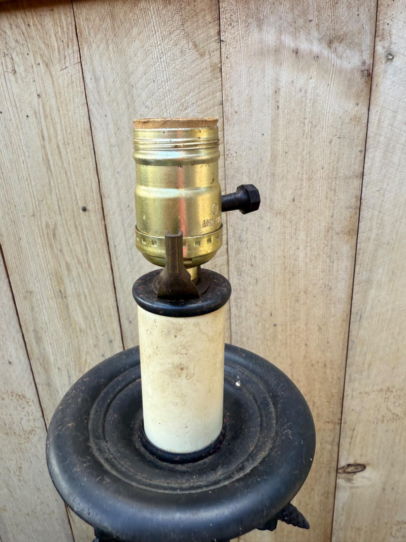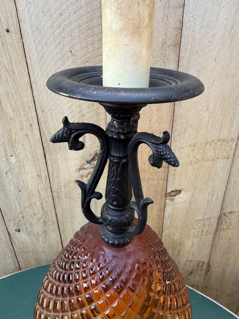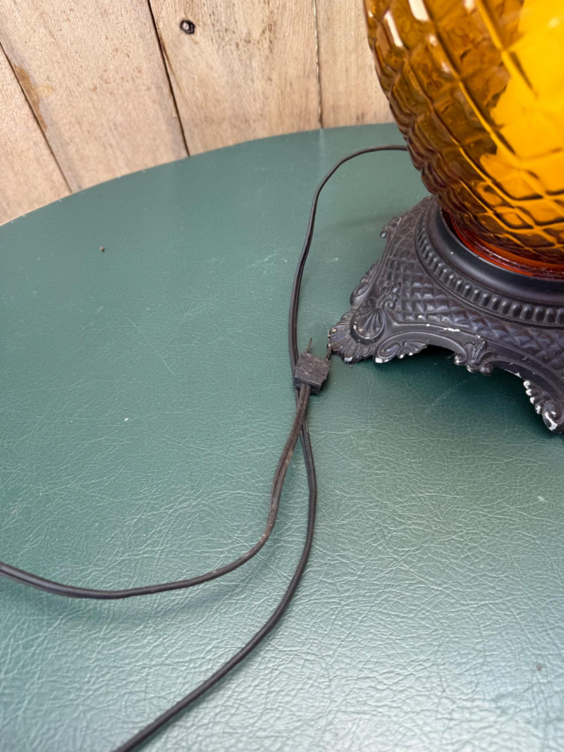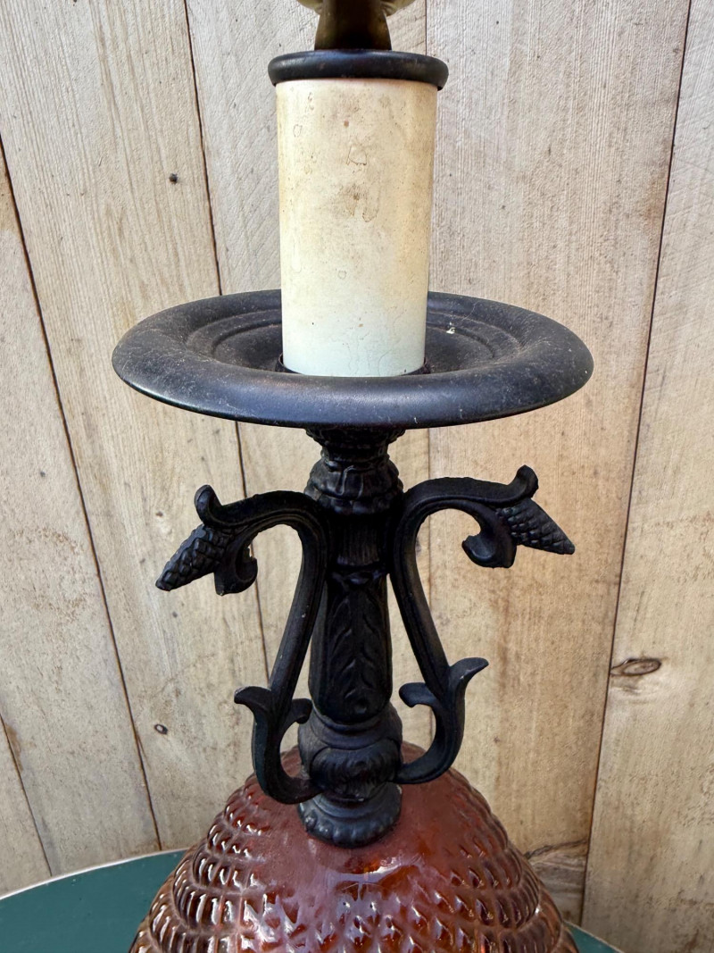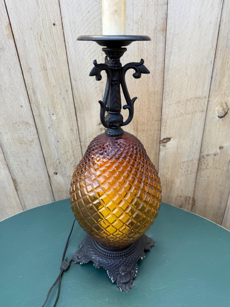 This vintage lamp features an amber-colored, diamond-patterned glass body mounted on an ornate cast metal base and topped with matching metal hardware. The lamp stands 18″ tall with a 10.5″ diameter and uses a standard bulb (with candle-style faux cover). Amber diamond-pattern glass body Ornate cast metal base and decorative top fittings Measures 18″ H × 10.5″ W Surface wear consistent with age; sold as-is