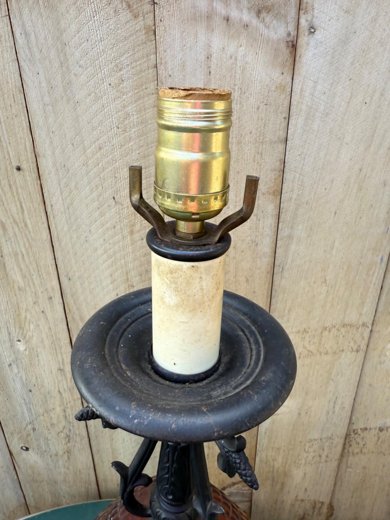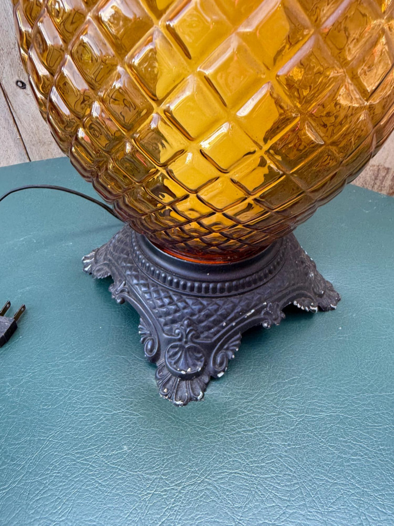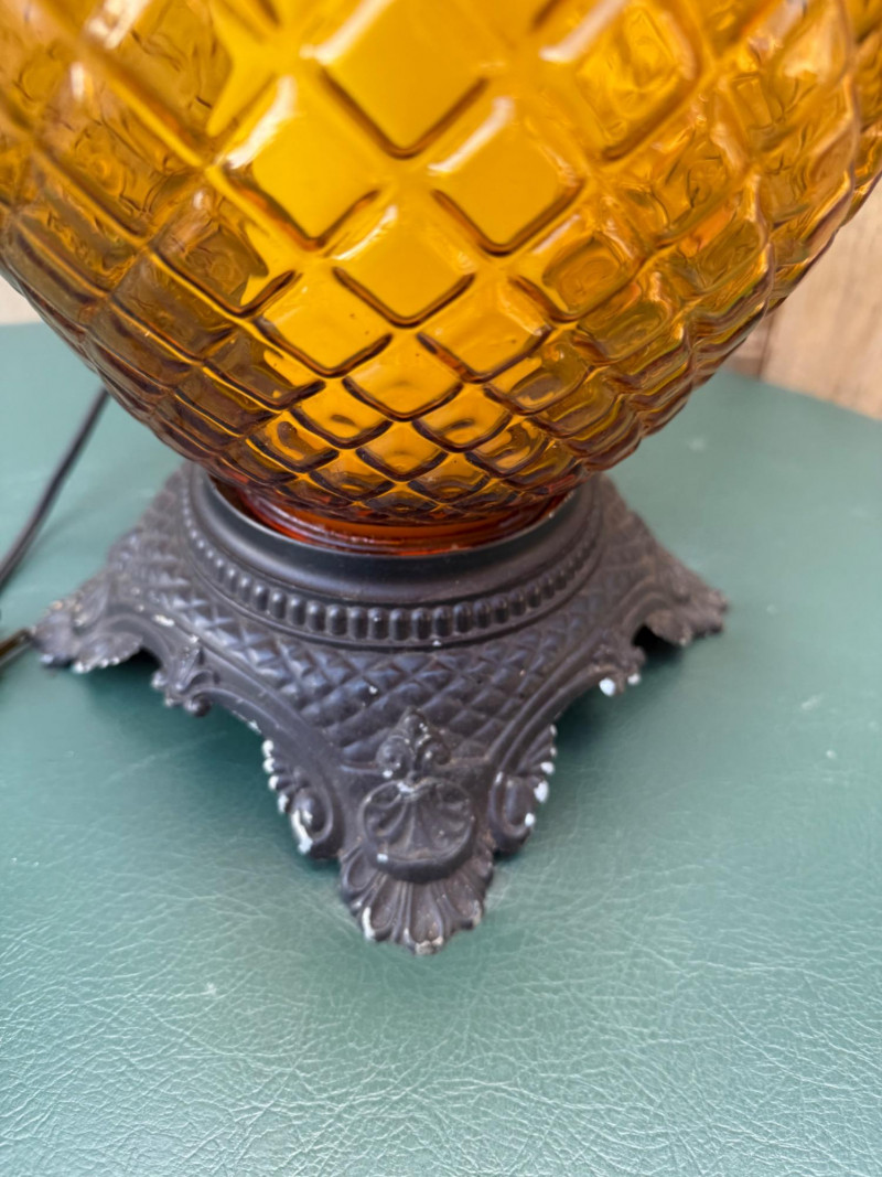 Lot # 60 - Vintage Amber Diamond-Pattern Glass Lamp on Ornate Cast Metal Base