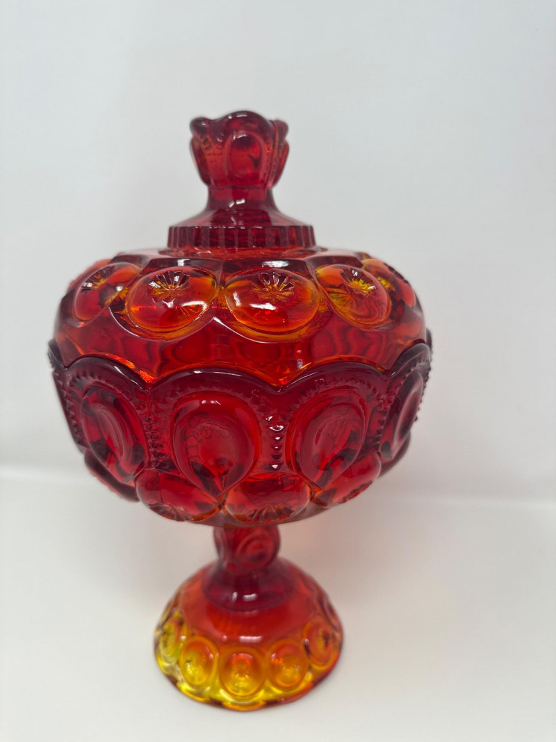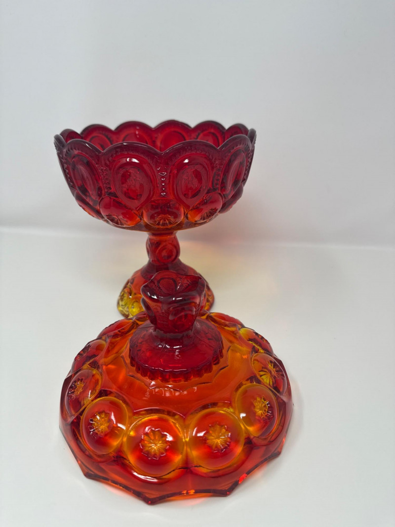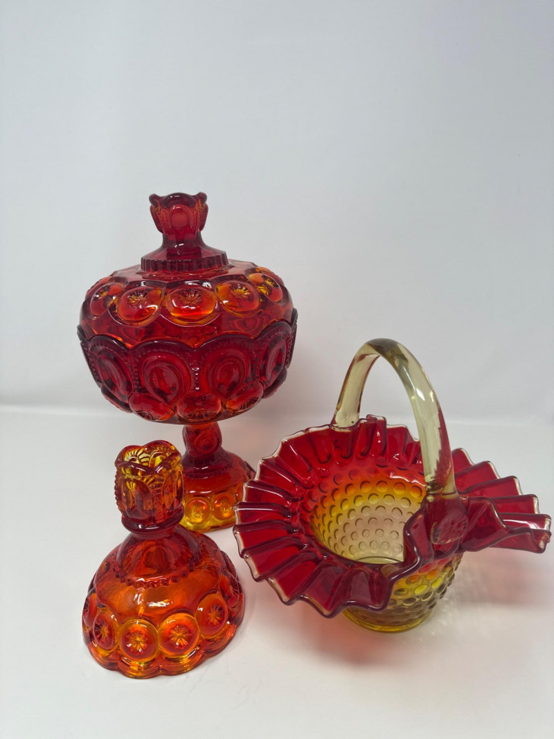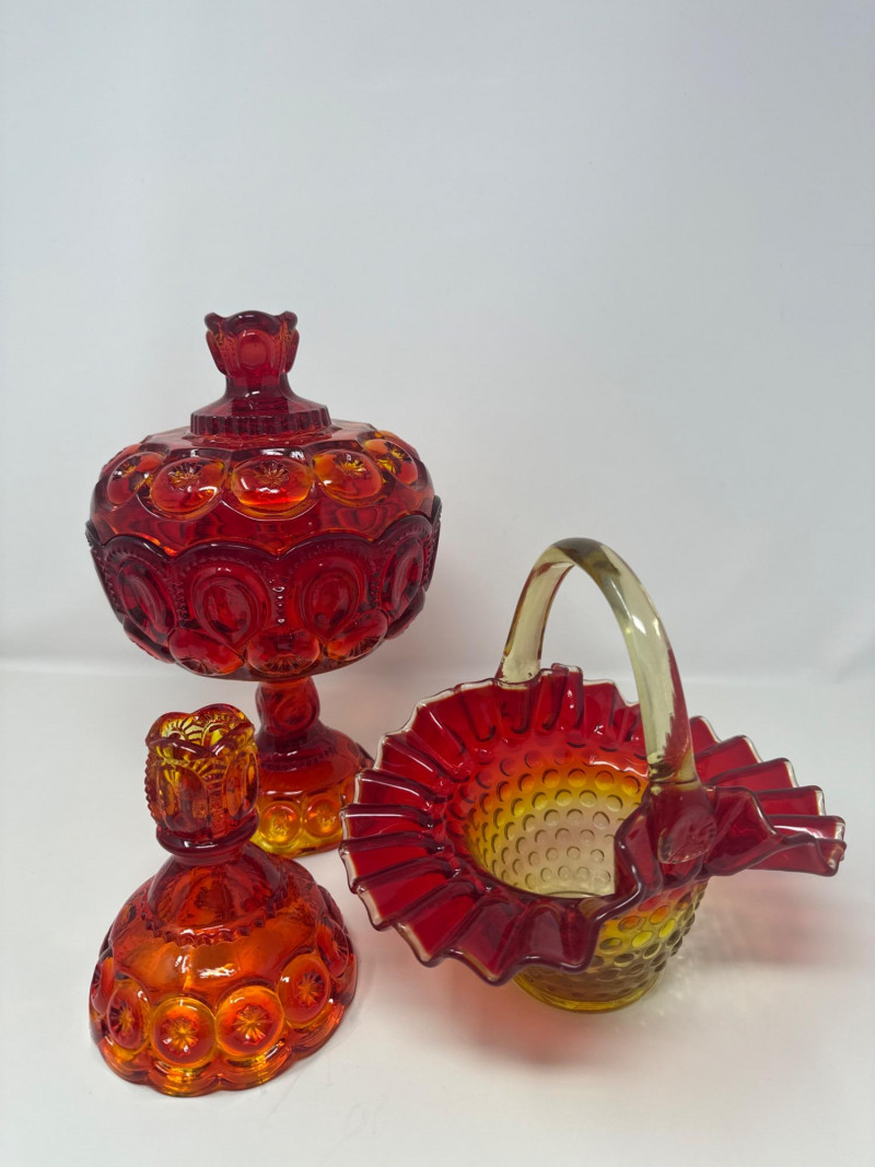 This lot includes three vintage glass pieces featuring the classic Moon & Stars and hobnail patterns: an LE Smith ruby red Moon & Stars lidded compote, a Fenton amberina hobnail basket, and an LE Smith amberina Moon & Stars candlestick. Each piece displays rich red-to-amber coloring and raised-star or hobnail motifs typical of mid-century glass. LE Smith Moon & Stars Lidded Compote Ruby red glass with raised Moon & Stars pattern Measures 10″ tall × 6″ wide Removable lid with finial top Fenton Amberina Hobnail Glass Basket Amberina glass transitioning from yellow to red, hobnail texture, ruffled edge Measures 6½″ tall × 7″ wide LE Smith Amberina Moon & Stars Candlestick Amberina glass with raised Moon & Stars motif, flared base Measures 4½″ tall × 3½″ wide