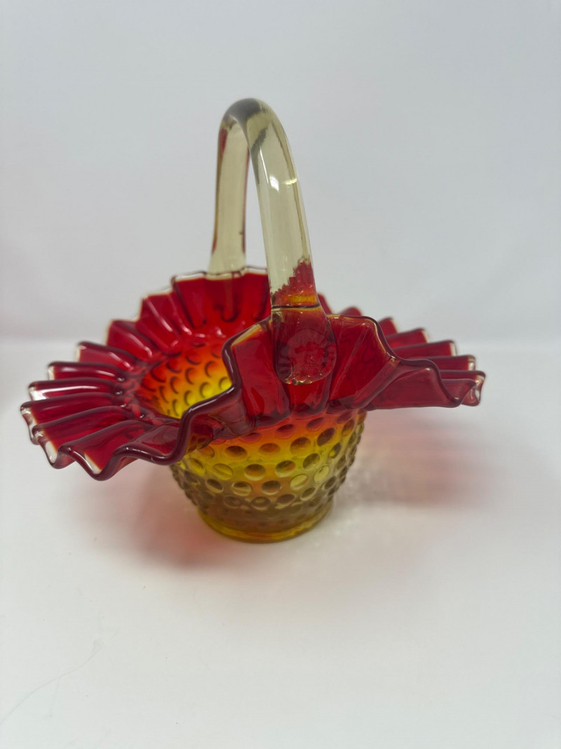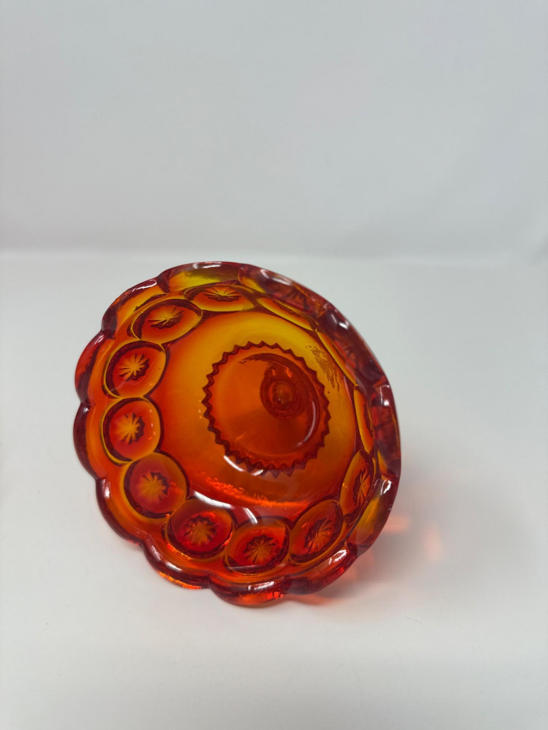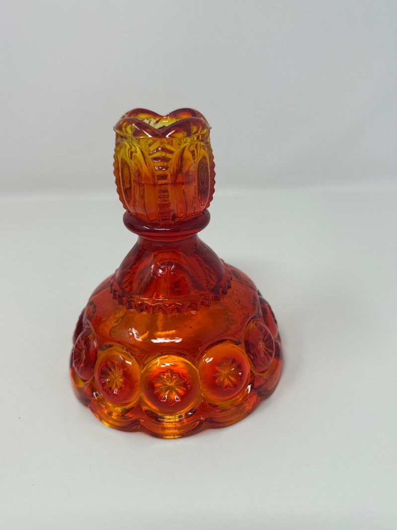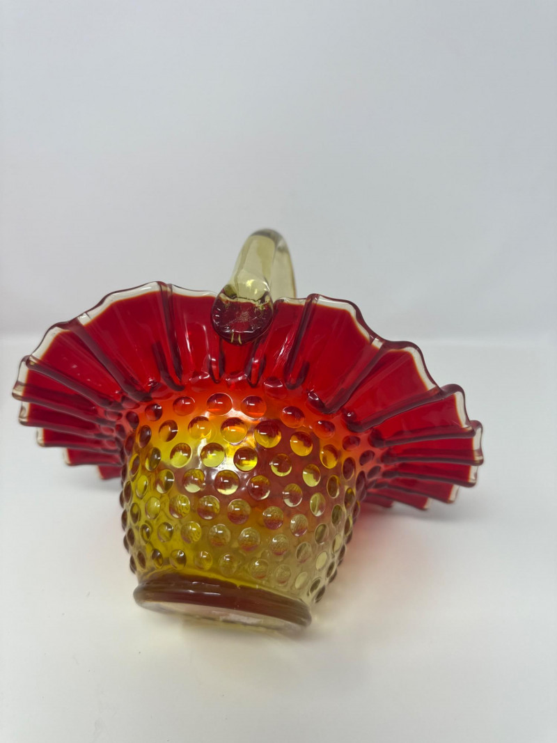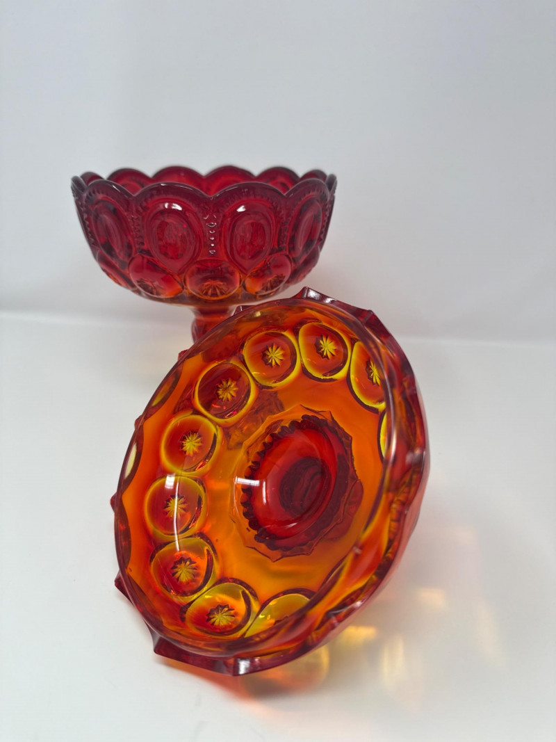 This lot includes three vintage glass pieces featuring the classic Moon & Stars and hobnail patterns: an LE Smith ruby red Moon & Stars lidded compote, a Fenton amberina hobnail basket, and an LE Smith amberina Moon & Stars candlestick. Each piece displays rich red-to-amber coloring and raised-star or hobnail motifs typical of mid-century glass. LE Smith Moon & Stars Lidded Compote Ruby red glass with raised Moon & Stars pattern Measures 10″ tall × 6″ wide Removable lid with finial top Fenton Amberina Hobnail Glass Basket Amberina glass transitioning from yellow to red, hobnail texture, ruffled edge Measures 6½″ tall × 7″ wide LE Smith Amberina Moon & Stars Candlestick Amberina glass with raised Moon & Stars motif, flared base Measures 4½″ tall × 3½″ wide