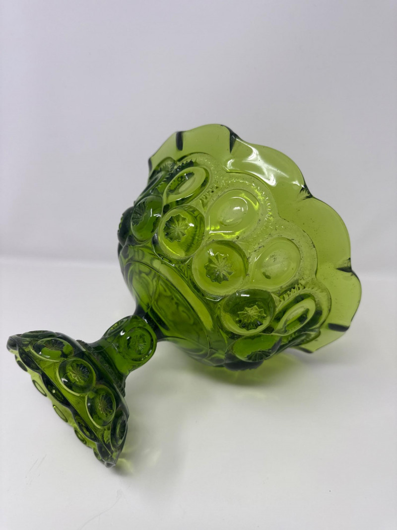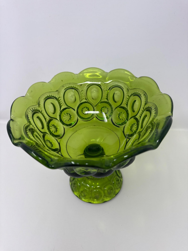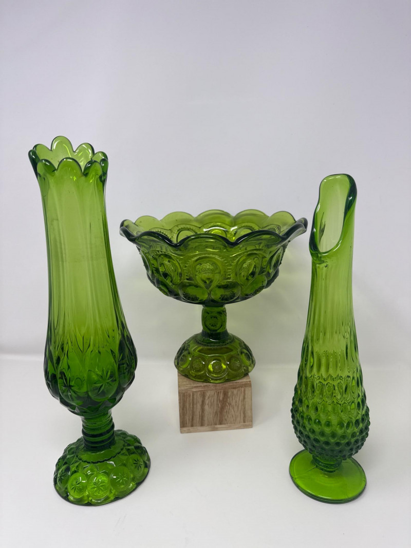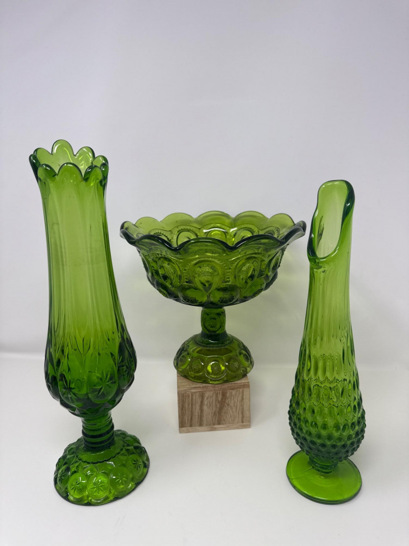 3-Pc MCM Green Moon & Stars Glass: Kanawha Vases & LE Smith Compote This lot includes two vintage Kanawha-style swung vases and one LE Smith Moon & Stars pedestal compote, all in emerald green glass. The Kanawha vases feature raised Moon & Stars and hobnail patterns. The LE Smith compote displays the classic Moon & Stars motif on a scalloped pedestal bowl. Kanawha-Style Moon & Stars Swung Vase Measures 12″ tall Raised Moon & Stars pattern with swung, flared rim Kanawha-Style Hobnail Swung Vase Measures 10½″ tall Raised hobnail texture blending into smooth neck, swung rim LE Smith Moon & Stars Pedestal Compote Measures 6¾″ tall × 8″ wide Raised Moon & Stars design on a scalloped bowl atop a fluted pedestal