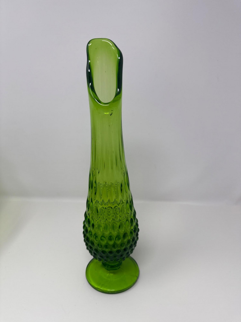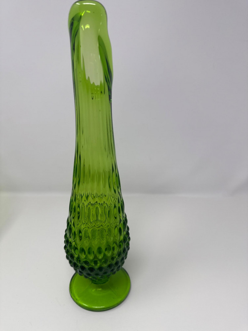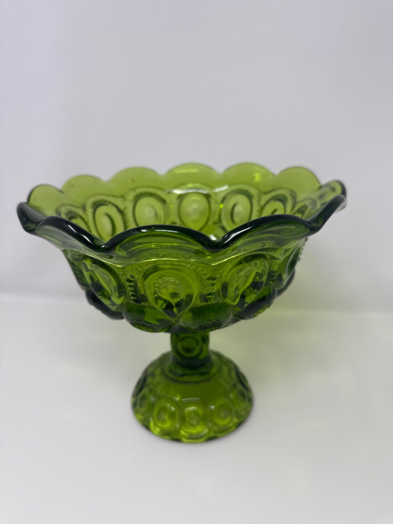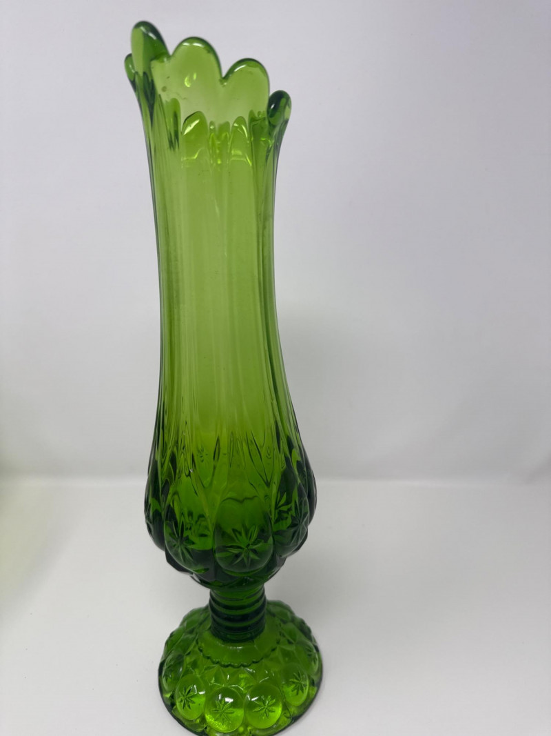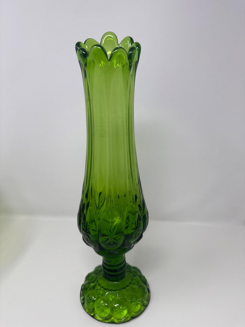 3-Pc MCM Green Moon & Stars Glass: Kanawha Vases & LE Smith Compote This lot includes two vintage Kanawha-style swung vases and one LE Smith Moon & Stars pedestal compote, all in emerald green glass. The Kanawha vases feature raised Moon & Stars and hobnail patterns. The LE Smith compote displays the classic Moon & Stars motif on a scalloped pedestal bowl. Kanawha-Style Moon & Stars Swung Vase Measures 12″ tall Raised Moon & Stars pattern with swung, flared rim Kanawha-Style Hobnail Swung Vase Measures 10½″ tall Raised hobnail texture blending into smooth neck, swung rim LE Smith Moon & Stars Pedestal Compote Measures 6¾″ tall × 8″ wide Raised Moon & Stars design on a scalloped bowl atop a fluted pedestal