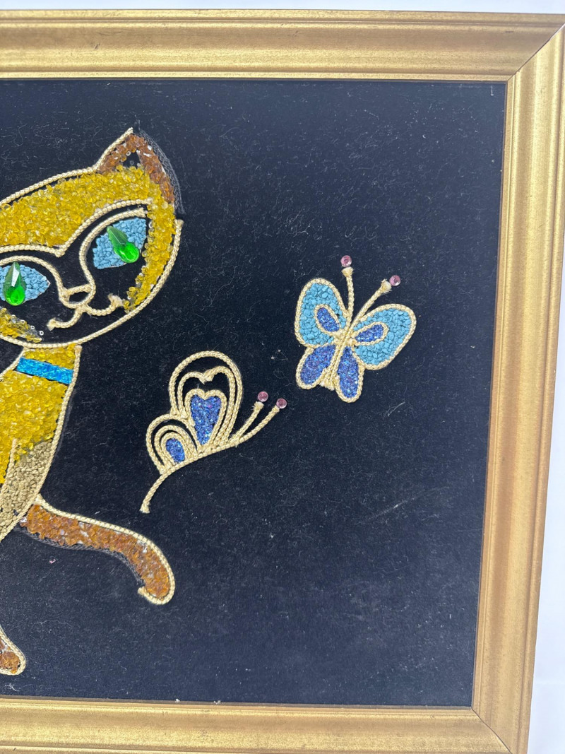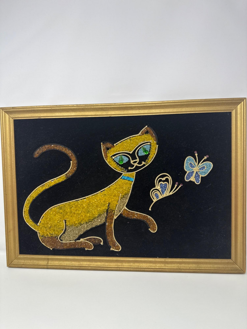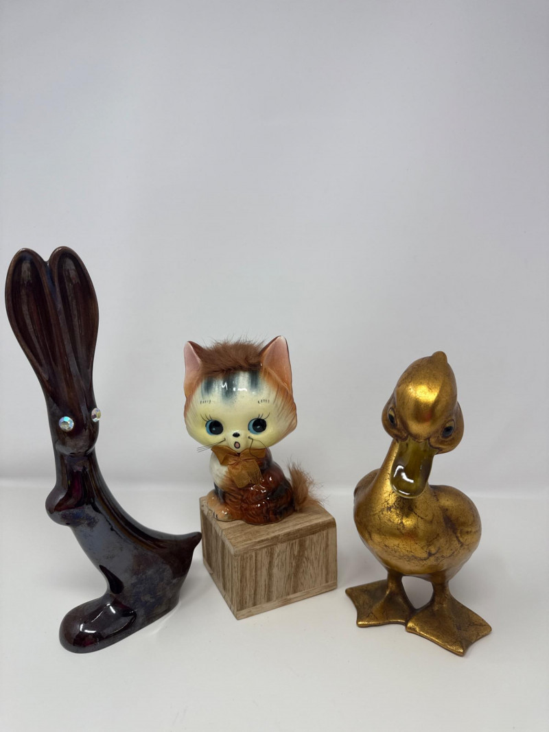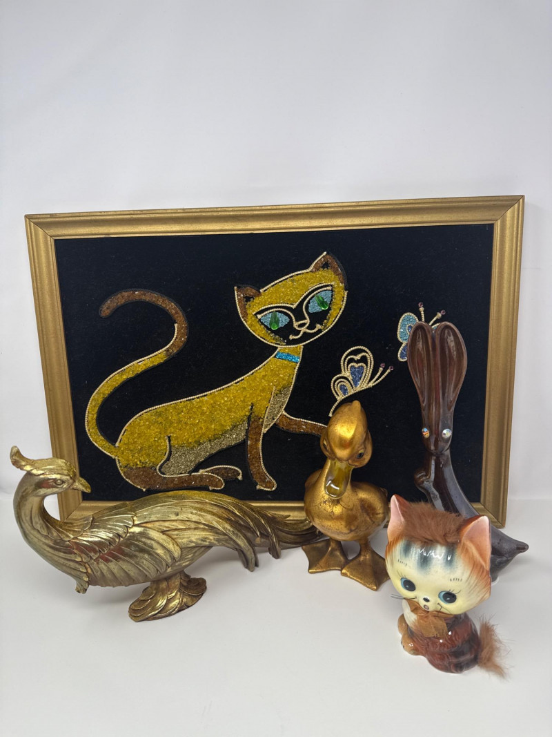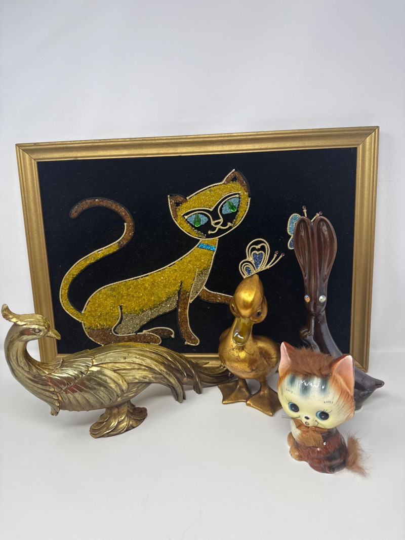 This lot includes five vintage decorative items: a framed cat artwork, a ceramic cat figurine, a bunny figurine, a peacock statue, and a gold-colored duck figurine. Each piece shows minor wear consistent with age. Sold as-is. Framed Cat: 19½″ W × 14″ H; velvet-backed frame, yellow gold glitter details Ceramic Cat Figurine: 5″ tall; hand-painted with faux fur accents Bunny Figurine: 10″ tall; carved wood with painted details Peacock Figurine: no dimensions taken; raised feathers and patina from age Duck Figurine: no dimensions taken; gold-colored finish with slight surface scratches