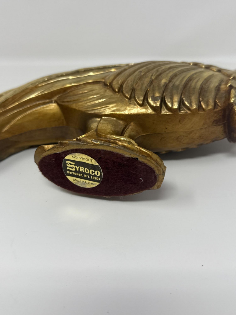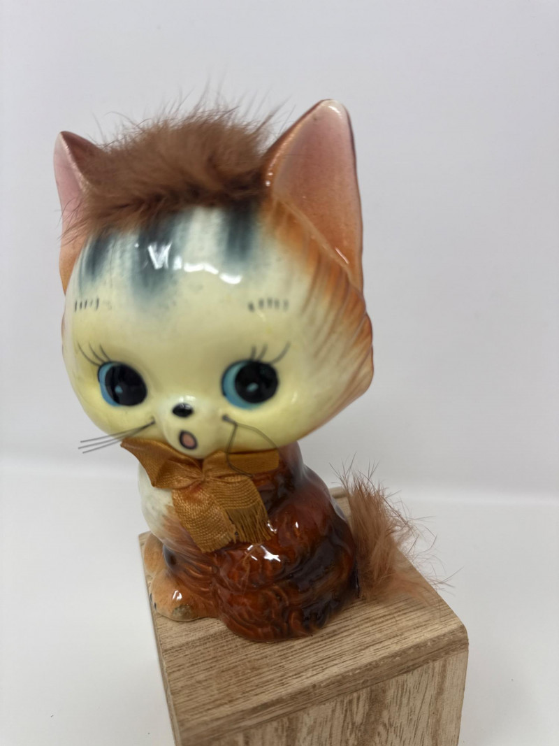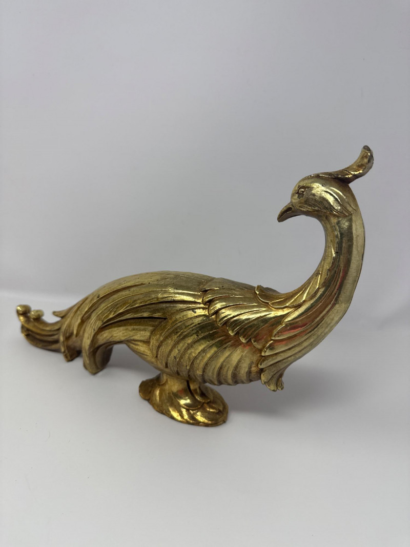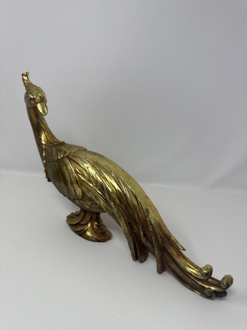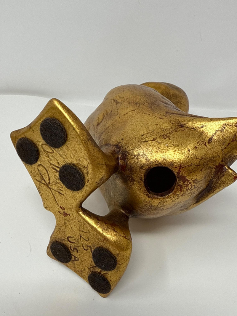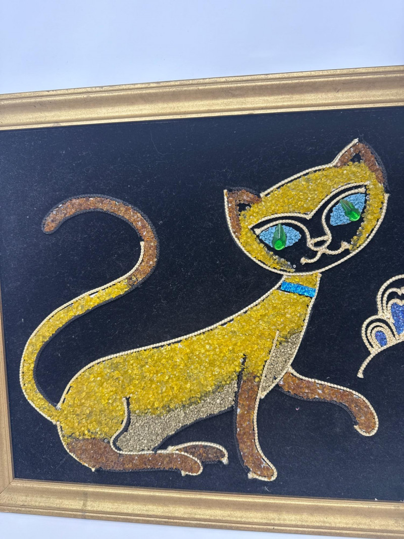 This lot includes five vintage decorative items: a framed cat artwork, a ceramic cat figurine, a bunny figurine, a peacock statue, and a gold-colored duck figurine. Each piece shows minor wear consistent with age. Sold as-is. Framed Cat: 19½″ W × 14″ H; velvet-backed frame, yellow gold glitter details Ceramic Cat Figurine: 5″ tall; hand-painted with faux fur accents Bunny Figurine: 10″ tall; carved wood with painted details Peacock Figurine: no dimensions taken; raised feathers and patina from age Duck Figurine: no dimensions taken; gold-colored finish with slight surface scratches