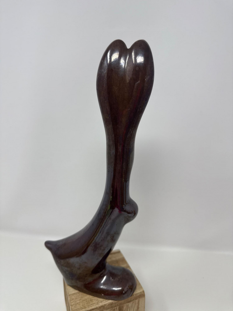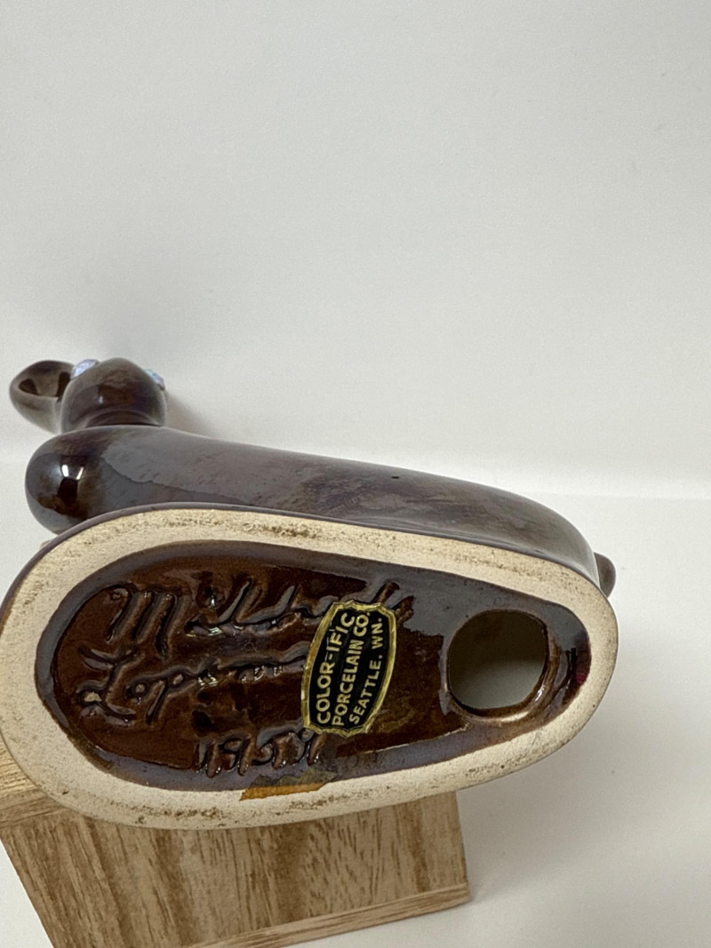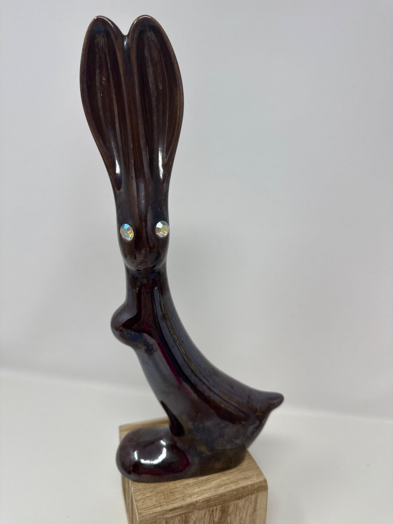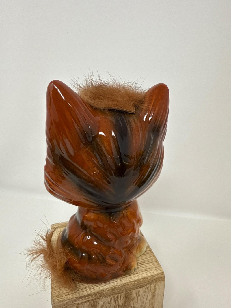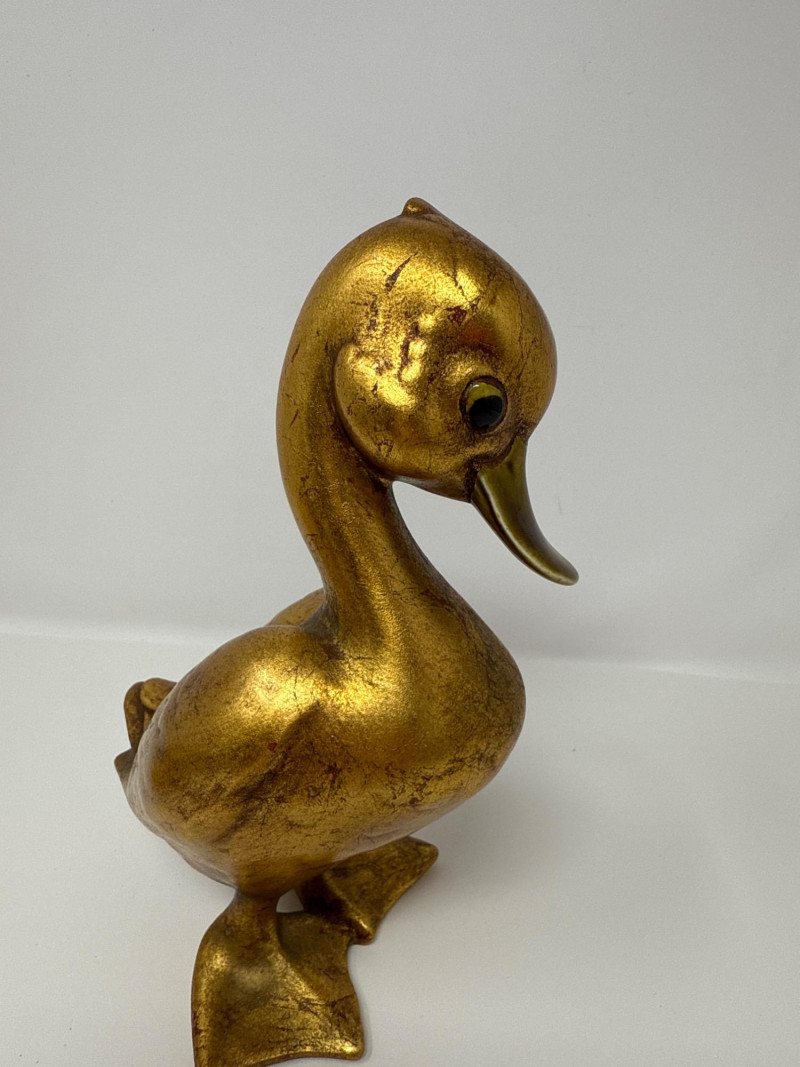 This lot includes five vintage decorative items: a framed cat artwork, a ceramic cat figurine, a bunny figurine, a peacock statue, and a gold-colored duck figurine. Each piece shows minor wear consistent with age. Sold as-is. Framed Cat: 19½″ W × 14″ H; velvet-backed frame, yellow gold glitter details Ceramic Cat Figurine: 5″ tall; hand-painted with faux fur accents Bunny Figurine: 10″ tall; carved wood with painted details Peacock Figurine: no dimensions taken; raised feathers and patina from age Duck Figurine: no dimensions taken; gold-colored finish with slight surface scratches