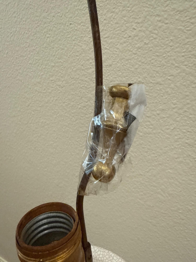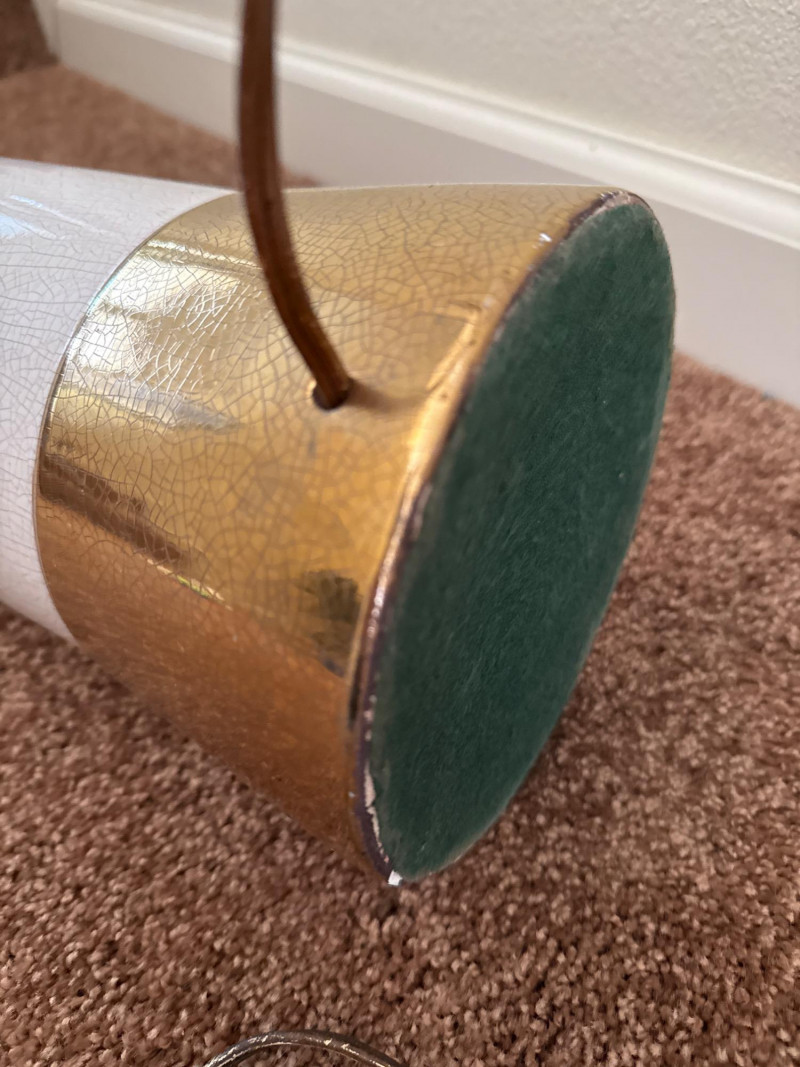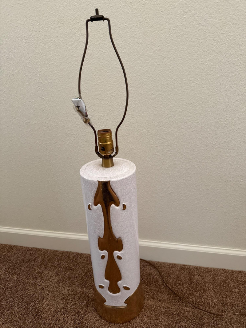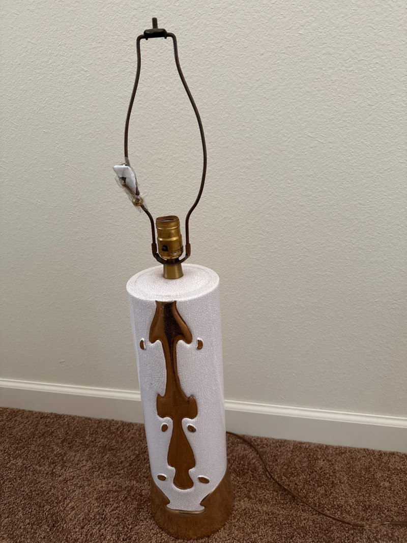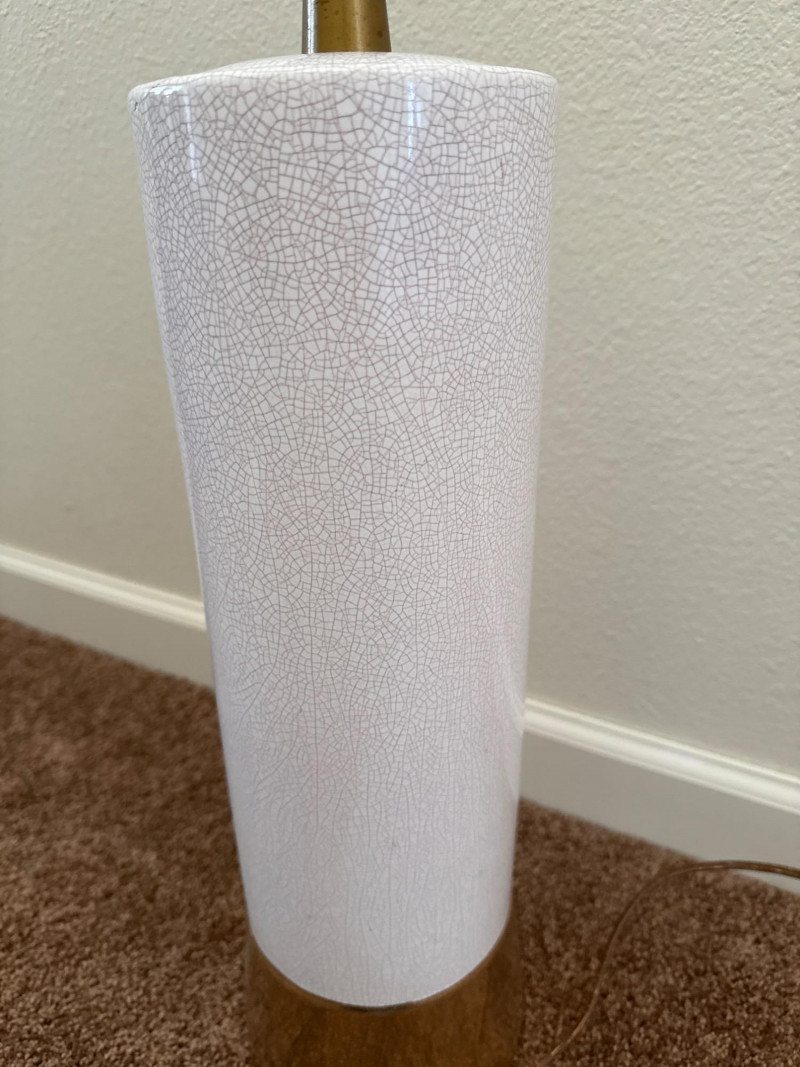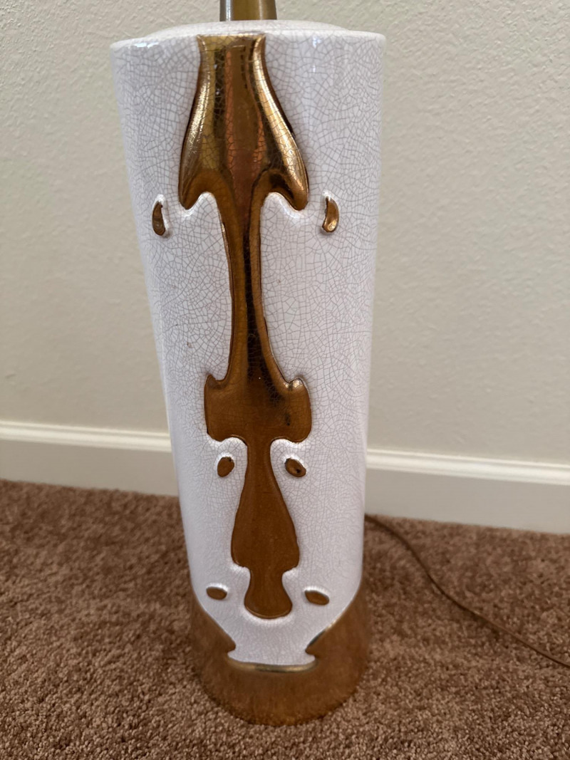 Mid-Century Modern White Crackle Glaze Ceramic Lamp w/ Gold Detail This mid-century ceramic lamp features a tall white crackle-glaze body accented by a gold-painted base and hardware. At 18″ tall (without shade) and 5″ wide at the base. White crackle-glaze ceramic body with fine crazing pattern Gold-painted base and brass-colored socket hardware Measures 18″ H × 5″ W at the widest point of the base