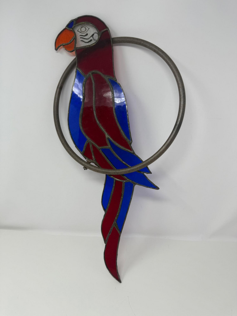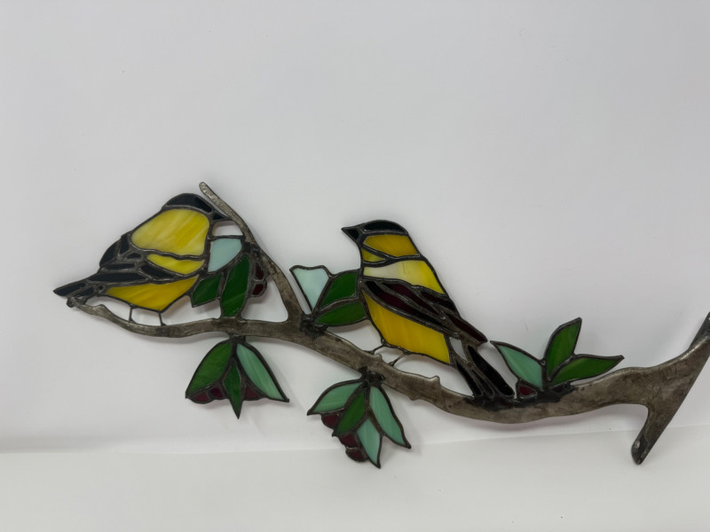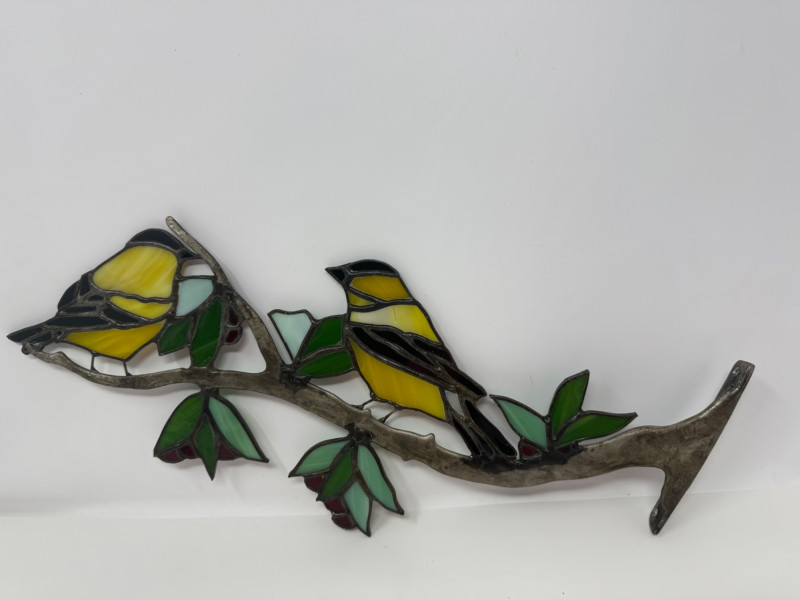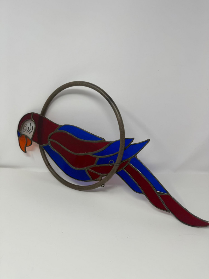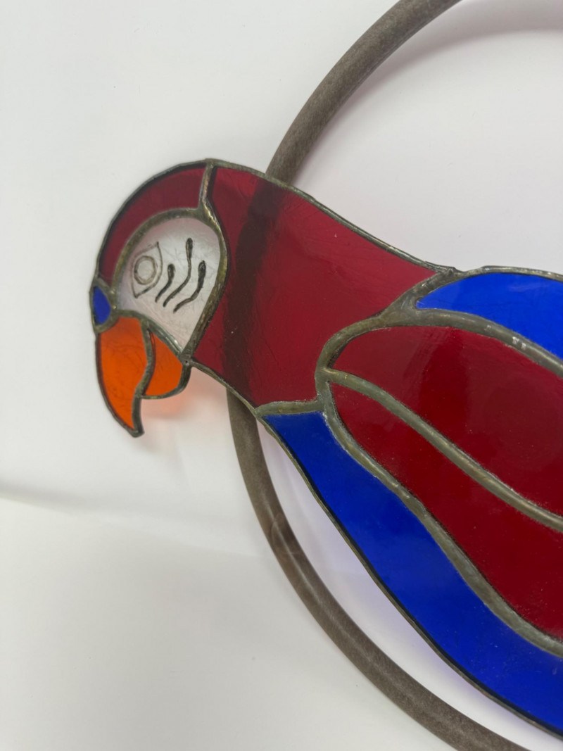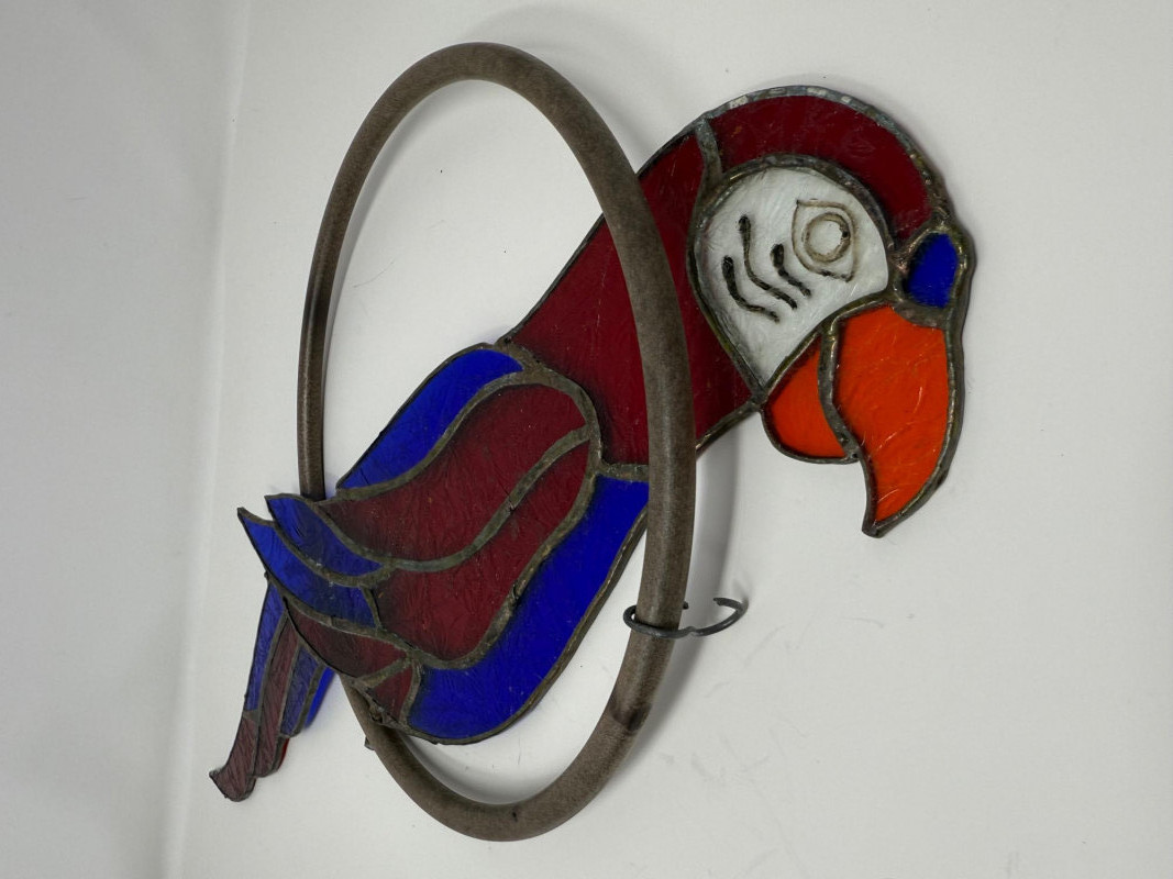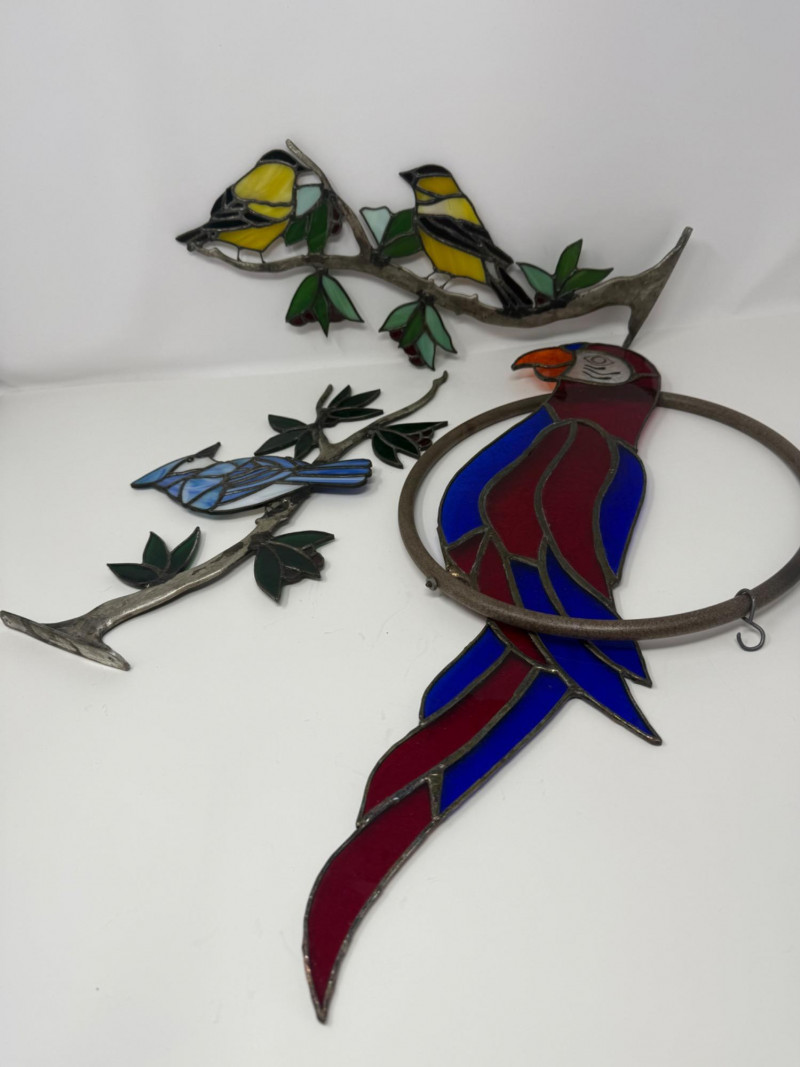 This lot includes three vintage acrylic “stained glass” bird wall hangings: a sculptural parrot in a circular frame, a bluebird perched on a branch, and a pair of yellow songbirds on a separate branch. Each piece is crafted from colored acrylic panels soldered into metal outlines, designed to catch and diffuse light. Measures approximately 19″ long (beak to tail tip) × 7″ tall (top of metal ring to bottom tail)