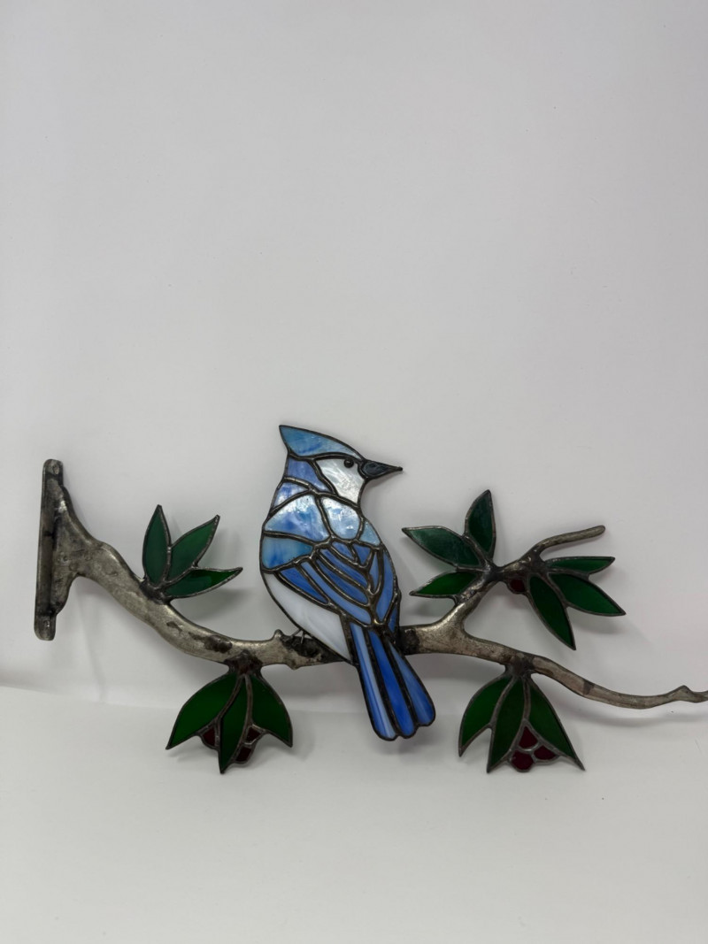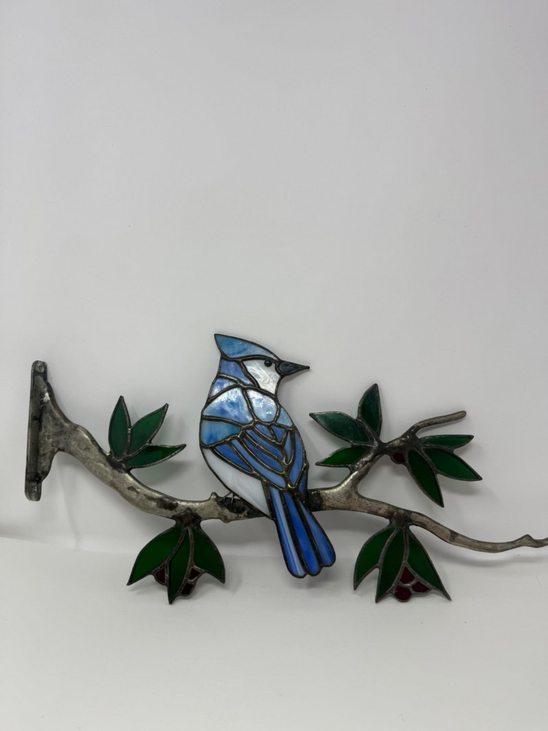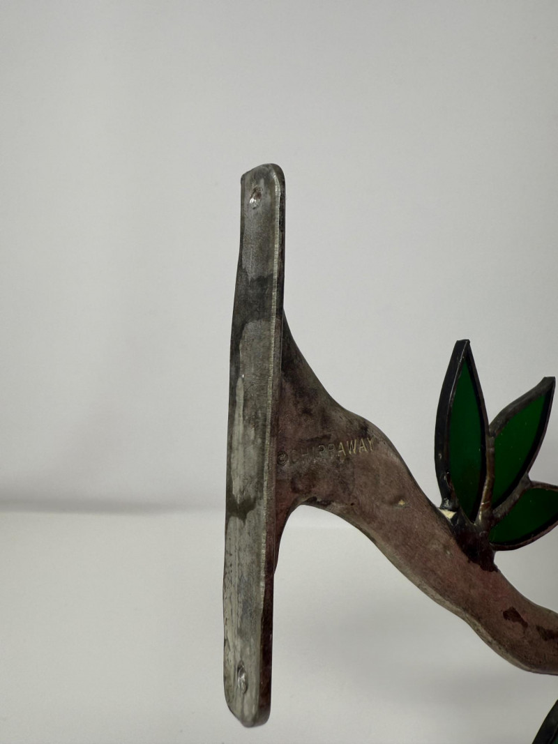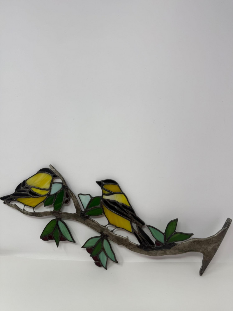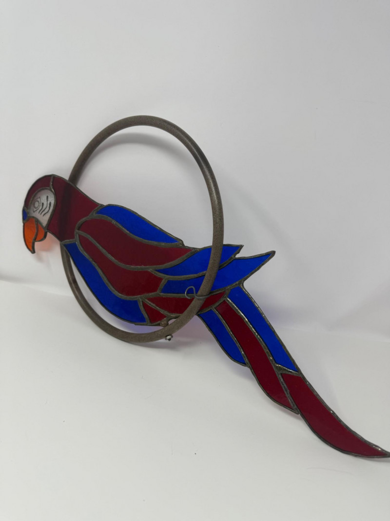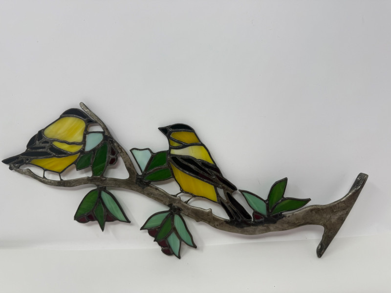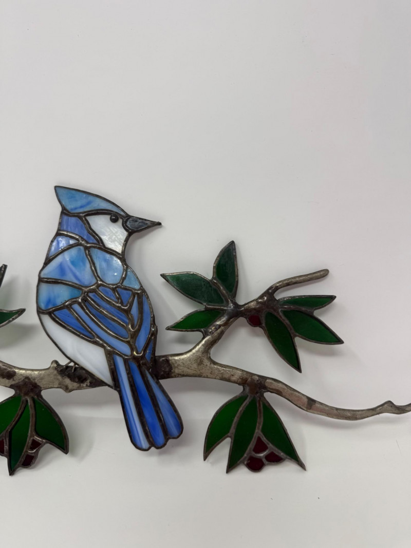 This lot includes three vintage acrylic “stained glass” bird wall hangings: a sculptural parrot in a circular frame, a bluebird perched on a branch, and a pair of yellow songbirds on a separate branch. Each piece is crafted from colored acrylic panels soldered into metal outlines, designed to catch and diffuse light. Measures approximately 19″ long (beak to tail tip) × 7″ tall (top of metal ring to bottom tail)