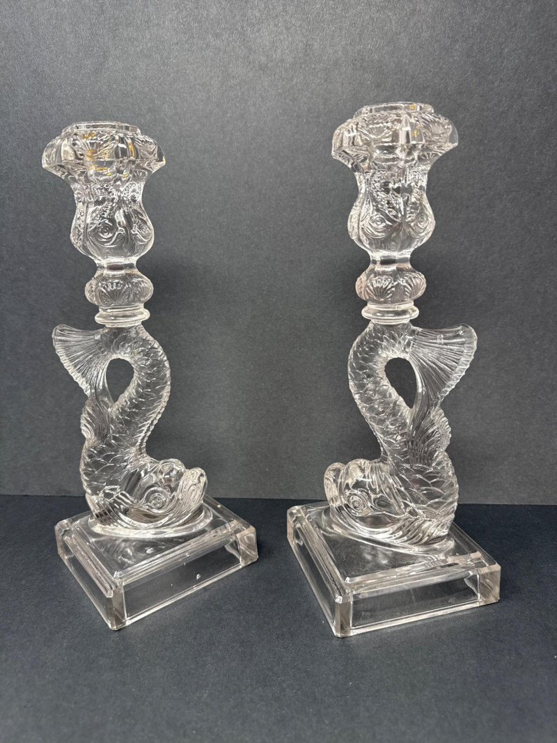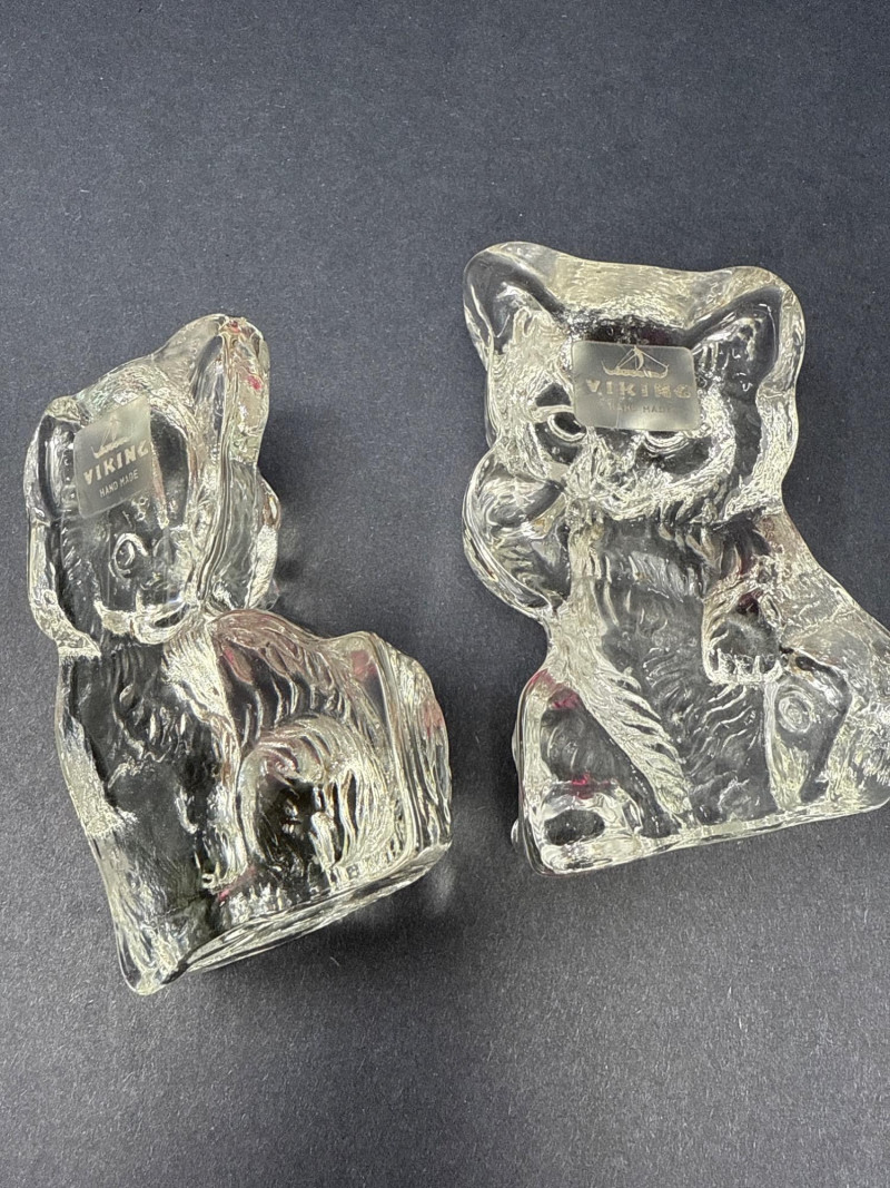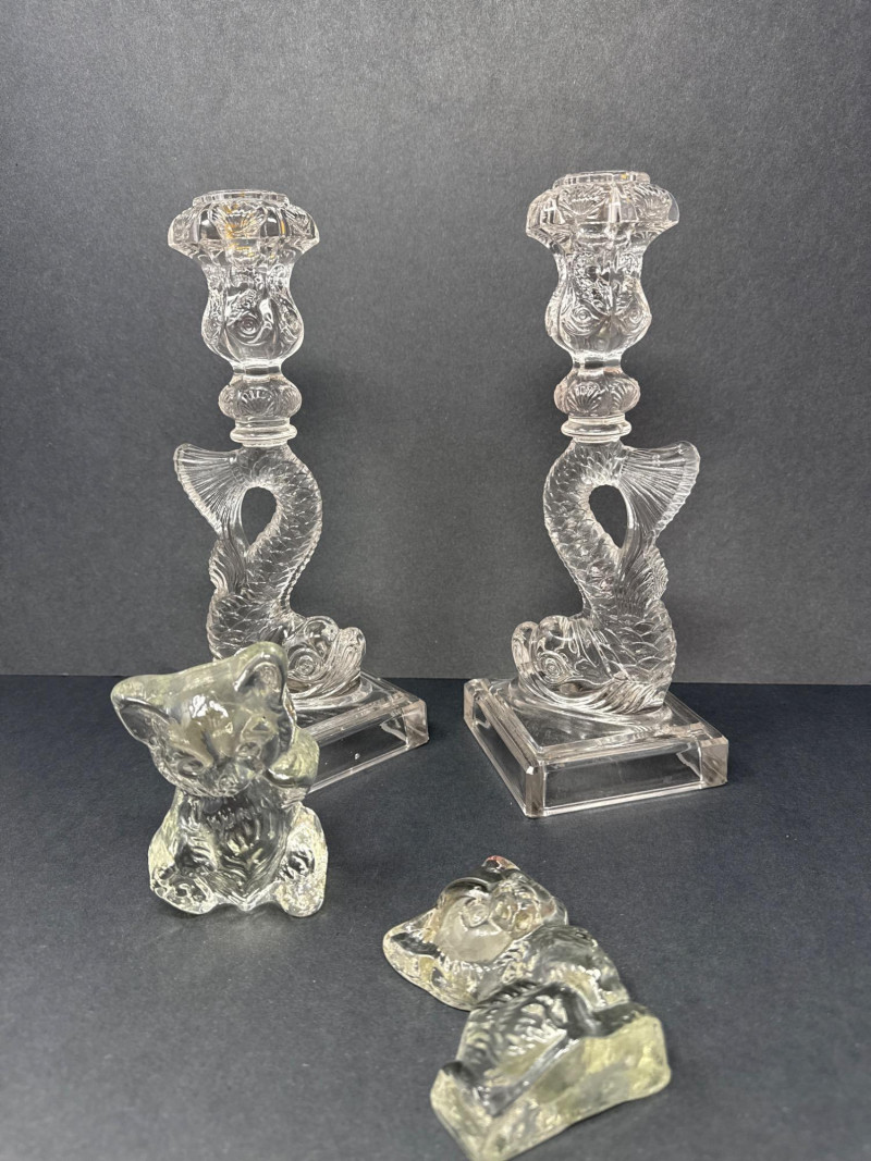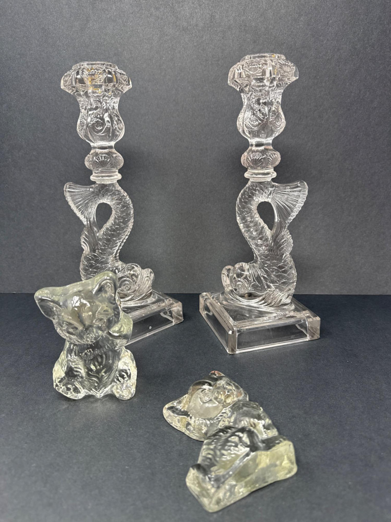 Pair Vintage MMA Clear Glass Fish Candlesticks & Viking Glass Bears This lot includes a pair of vintage MMA clear glass fish candlesticks and two Viking glass bear figurines. The fish candlesticks feature sculpted, upturned fish tails forming the candle cups, while the bears are molded in clear glass with detailed facial features. MMA Fish Candlesticks measures 10½″ tall; square base measures 4″ × 4″ Viking Glass Bears measures 4½″ tall × 2½″ wide