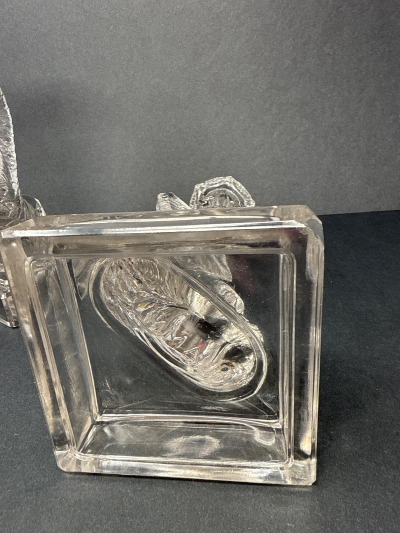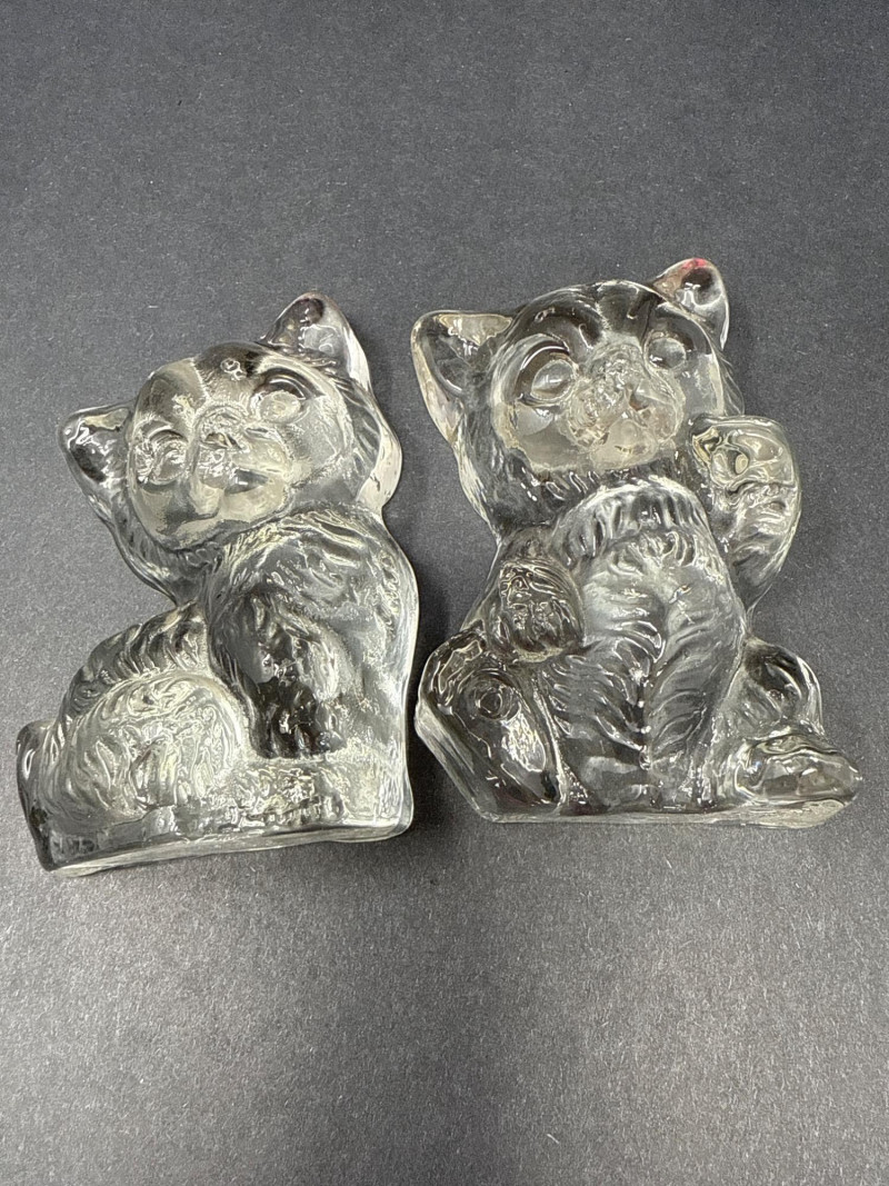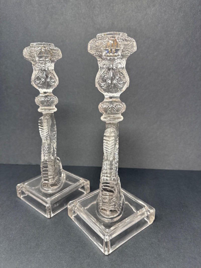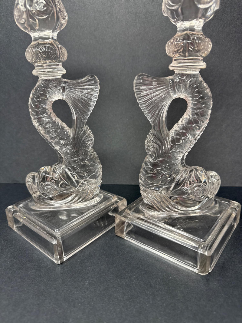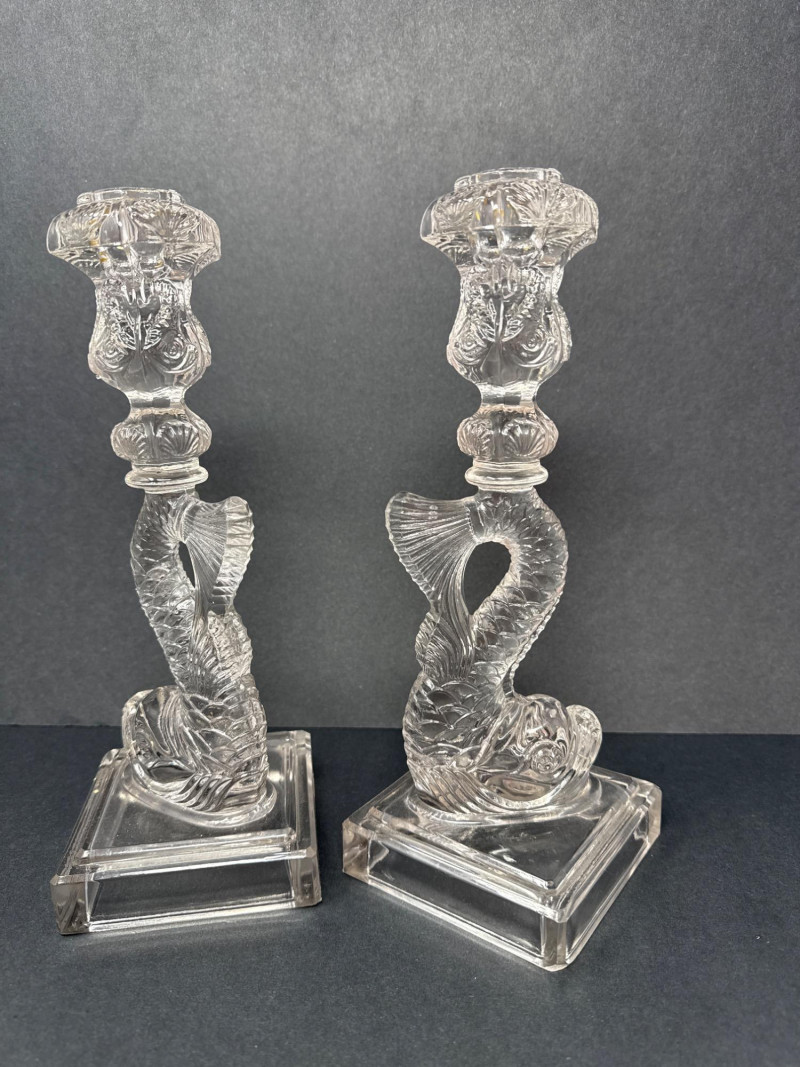 Pair Vintage MMA Clear Glass Fish Candlesticks & Viking Glass Bears This lot includes a pair of vintage MMA clear glass fish candlesticks and two Viking glass bear figurines. The fish candlesticks feature sculpted, upturned fish tails forming the candle cups, while the bears are molded in clear glass with detailed facial features. MMA Fish Candlesticks measures 10½″ tall; square base measures 4″ × 4″ Viking Glass Bears measures 4½″ tall × 2½″ wide
