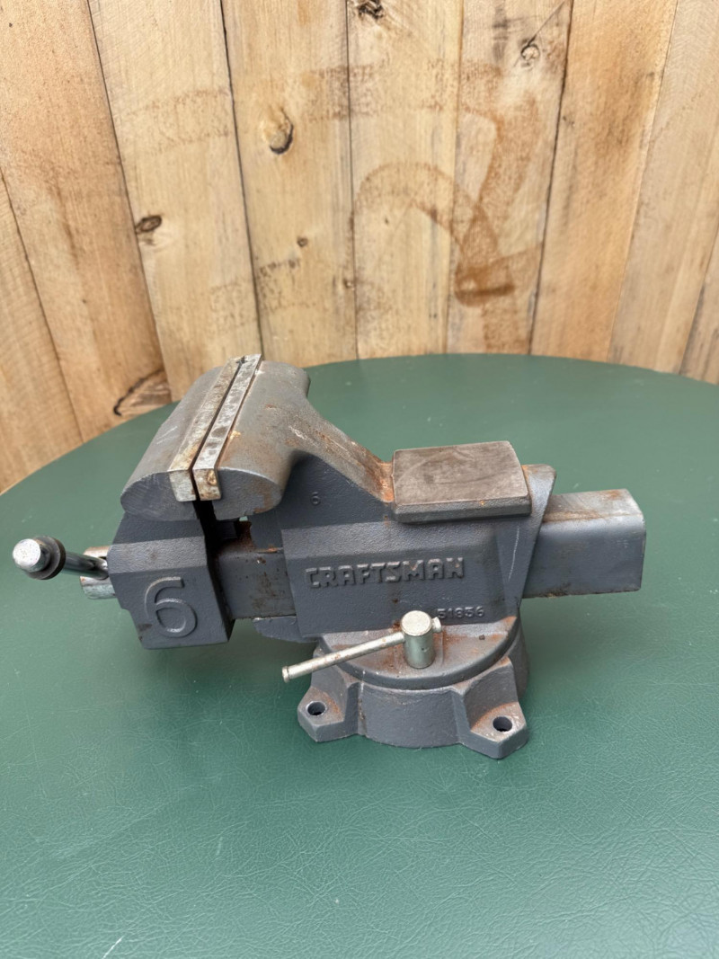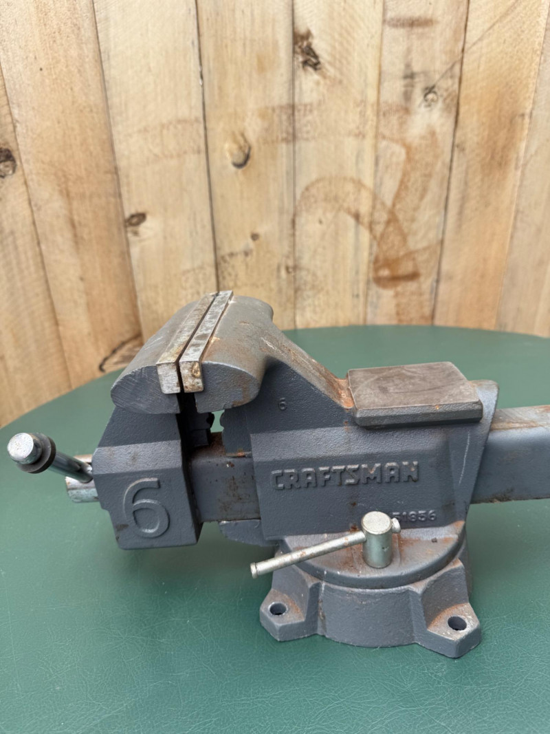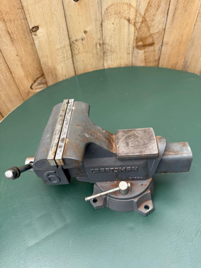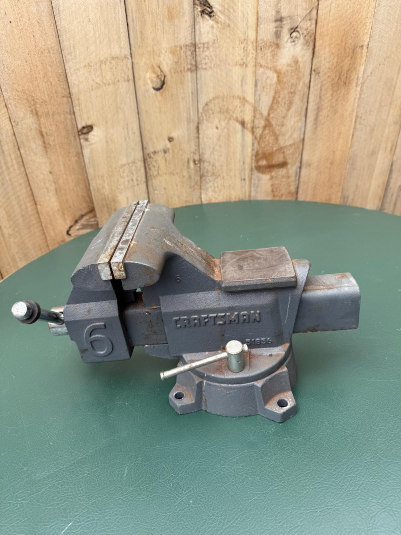 Vintage Craftsman 6" Swivel-Base Cast Iron Bench Vise This vintage bench vise from Craftsman features 6″ cast-iron jaws and a 360° swivel base, making it a durable addition to any workshop. The solid cast-iron construction provides stable clamping for woodworking, metalworking, and general repair tasks.