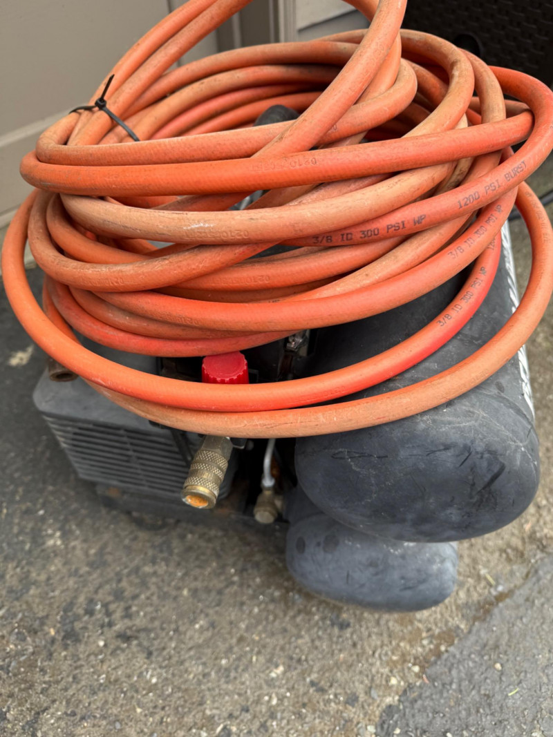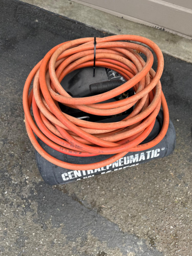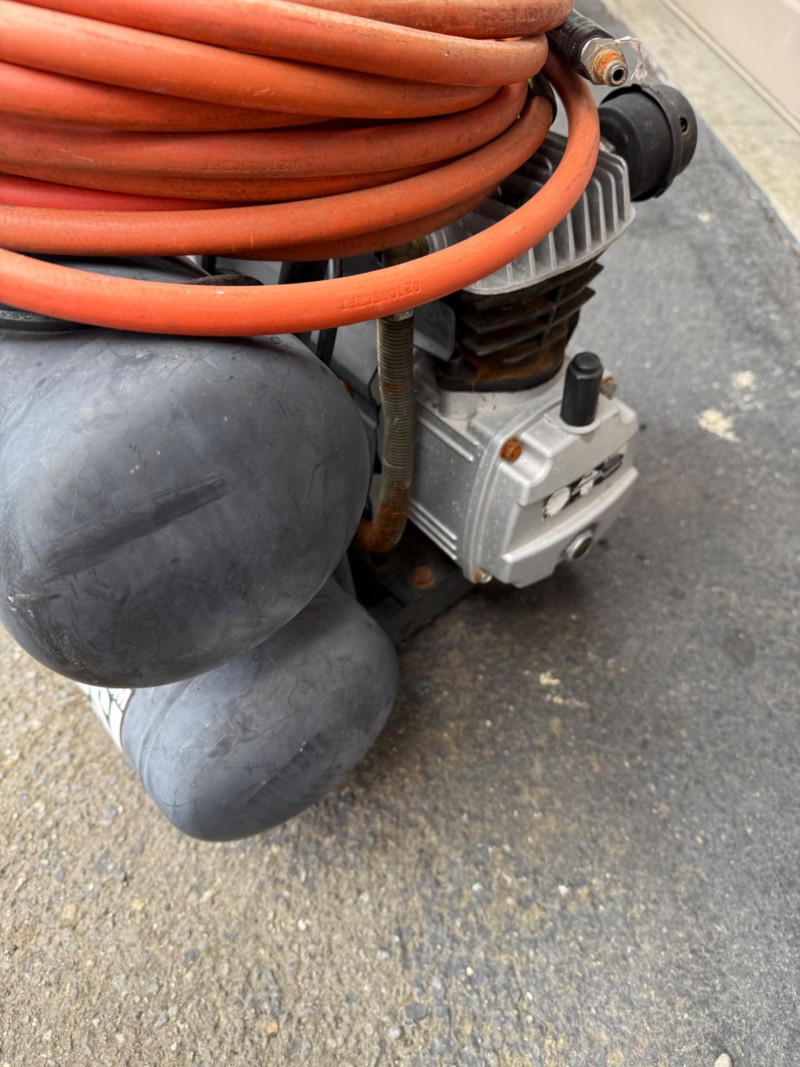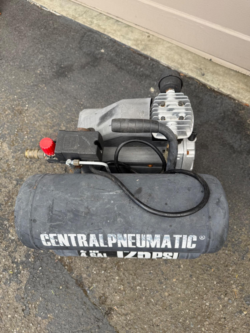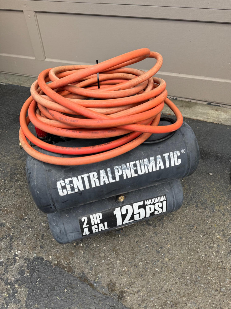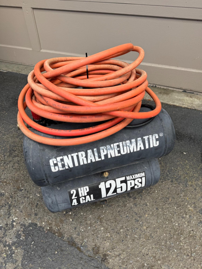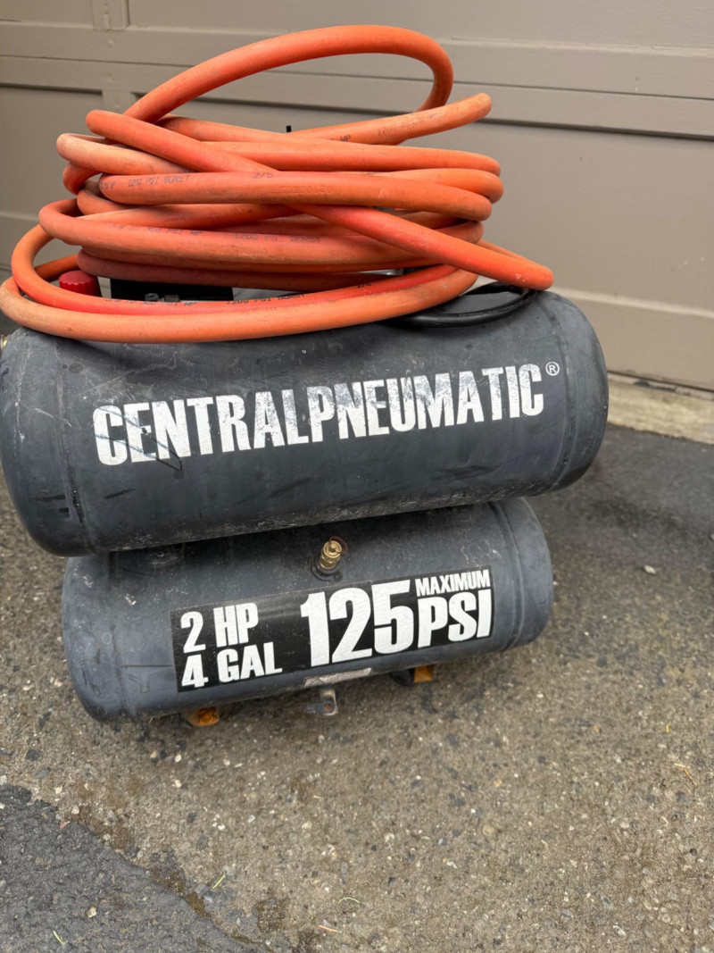 Central Pneumatic 2HP 4-Gal 125PSI Portable Air Compressor This auction is for a Central Pneumatic portable air compressor. It features a 2 horsepower motor and a 4-gallon tank, capable of reaching a maximum pressure of 125 PSI. An orange air hose is included with the compressor, as shown in the image.