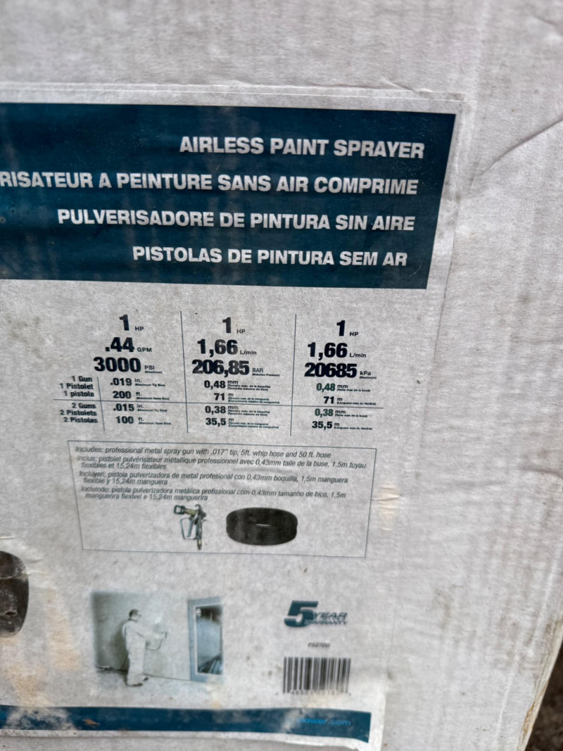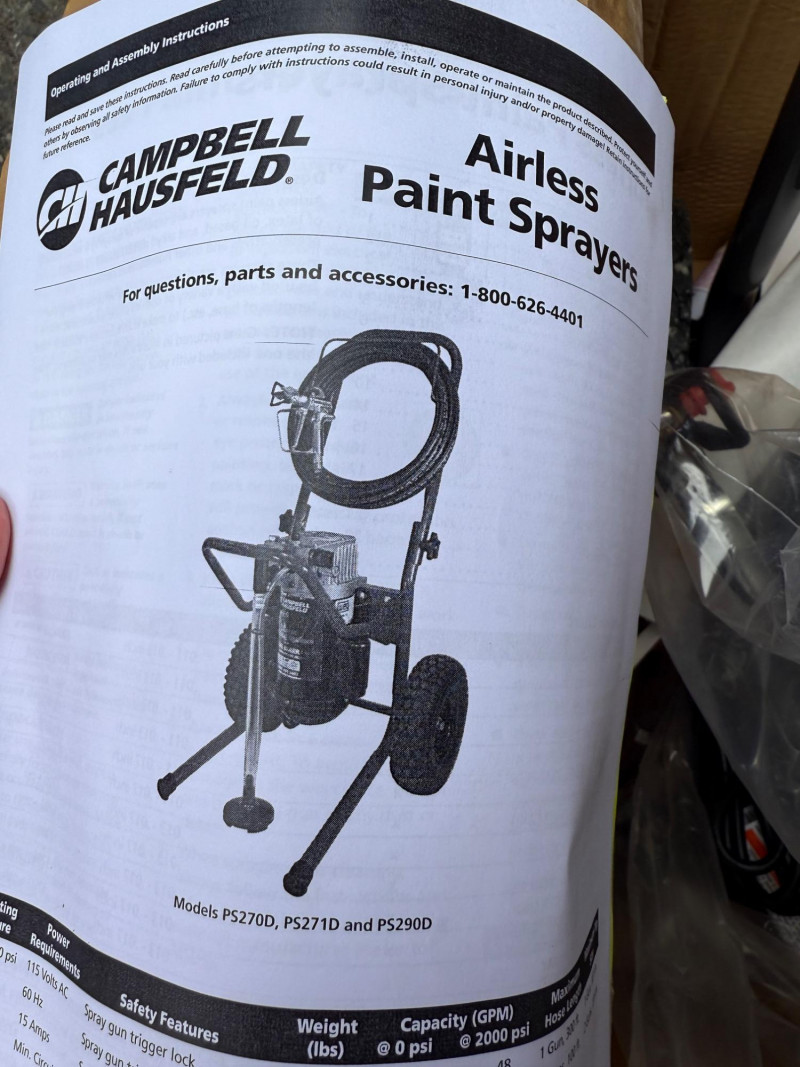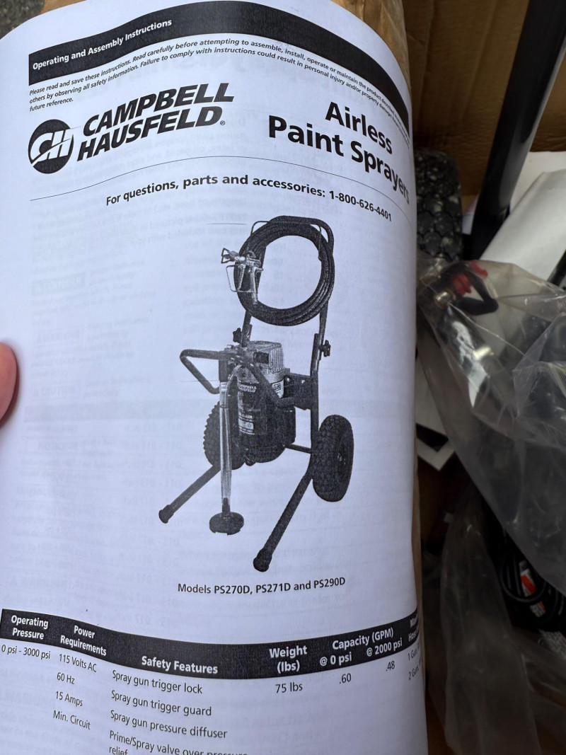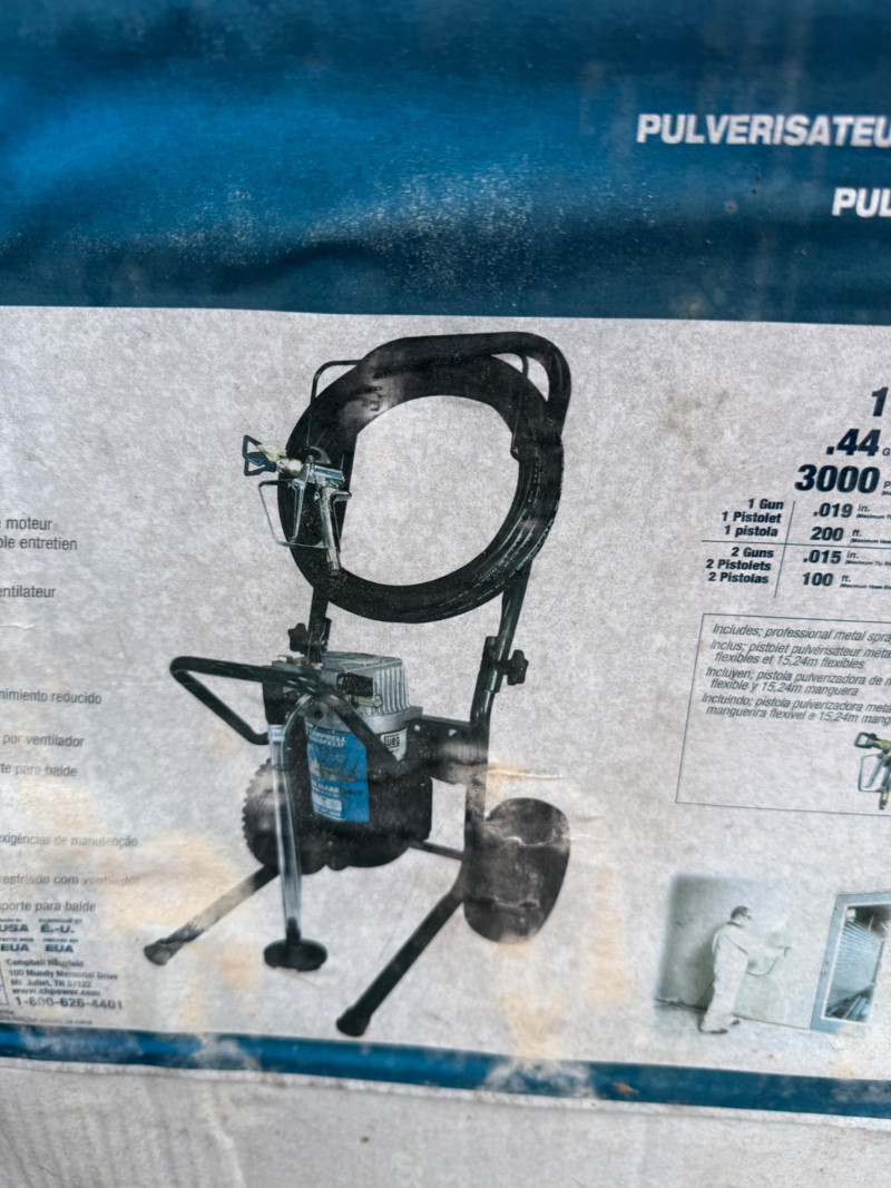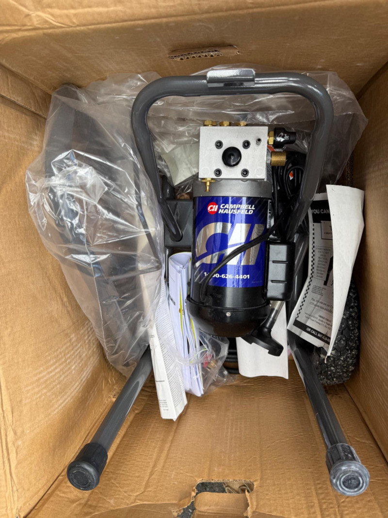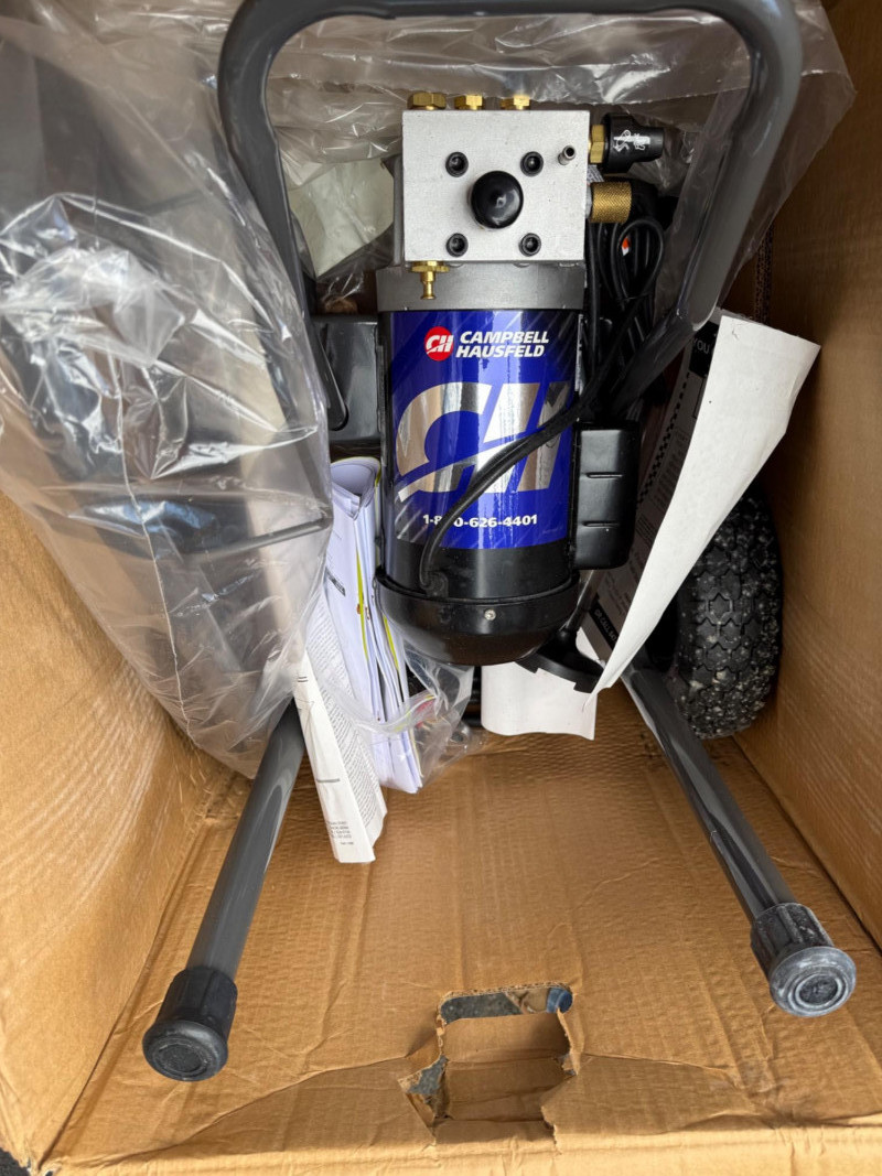 Campbell Hausfeld Airless Paint Sprayer w/ Wheeled Cart The unit comes with a wheeled cart for easy portability and handling during painting projects. Included in the package are the sprayer unit, various accessories, and operation manuals. It is in new condition.