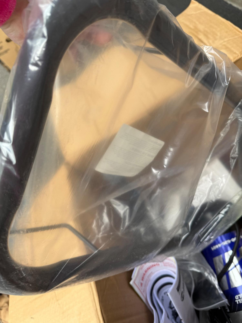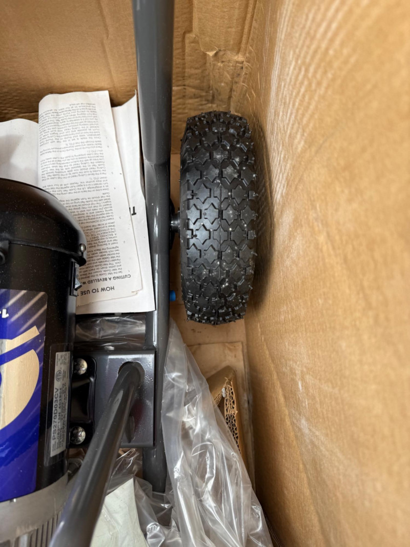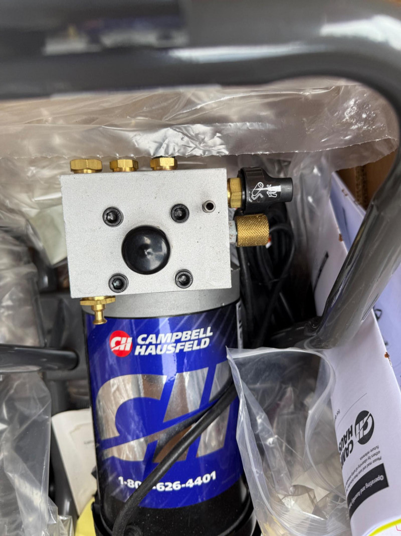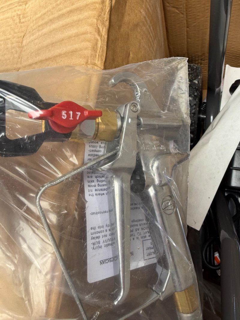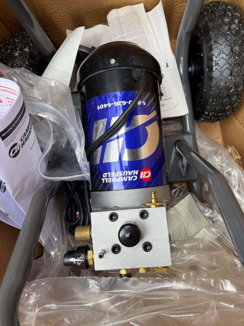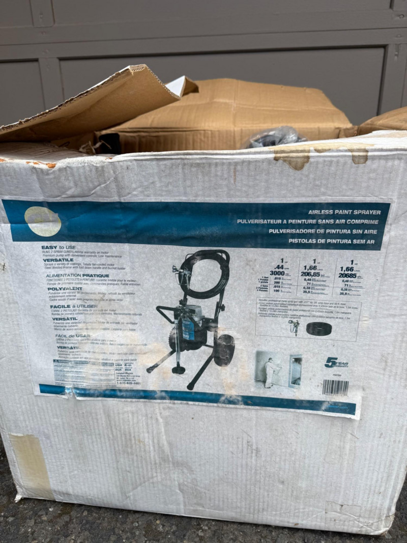 Campbell Hausfeld Airless Paint Sprayer w/ Wheeled Cart The unit comes with a wheeled cart for easy portability and handling during painting projects. Included in the package are the sprayer unit, various accessories, and operation manuals. It is in new condition.