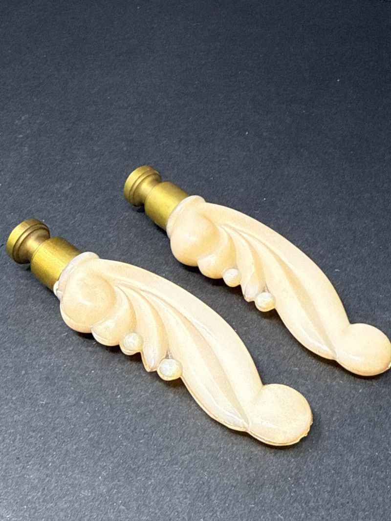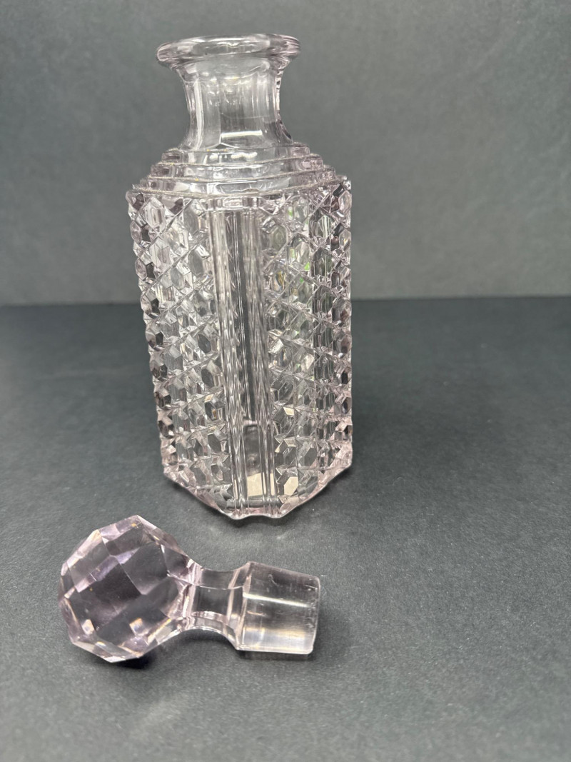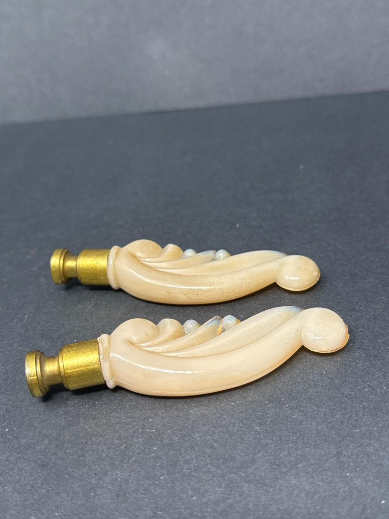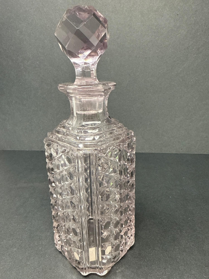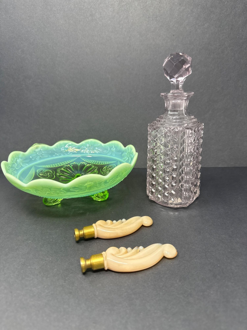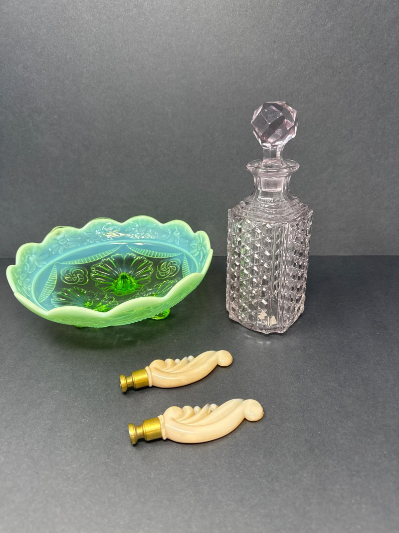 Vintage Northwood Green Opalescent Bowl, Decanter, & Lamp Finials Set This auction offers a collection of vintage and antique glass items. It includes a vintage Northwood green opalescent candy bowl with a scalloped edge and floral/Celtic knot design, which is noted to glow. Also featured is an antique Victorian era hobnail cut glass decanter with stopper, and two antique Alacite Aladdin "Plume" glass lamp finials from 1949. These pieces can serve as decorative accents or additions to a glass collection. The varied styles offer a range of historical and aesthetic appeal.