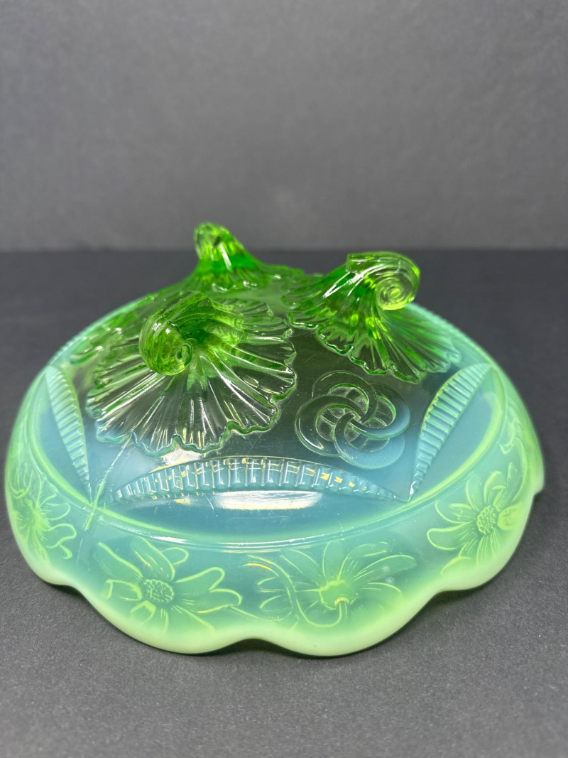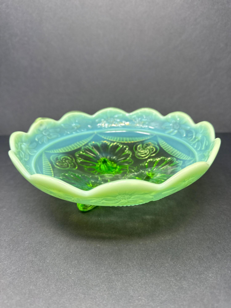 Lot # 95 - Vintage Northwood Green Opalescent Bowl, Decanter, & Lamp Finials Set