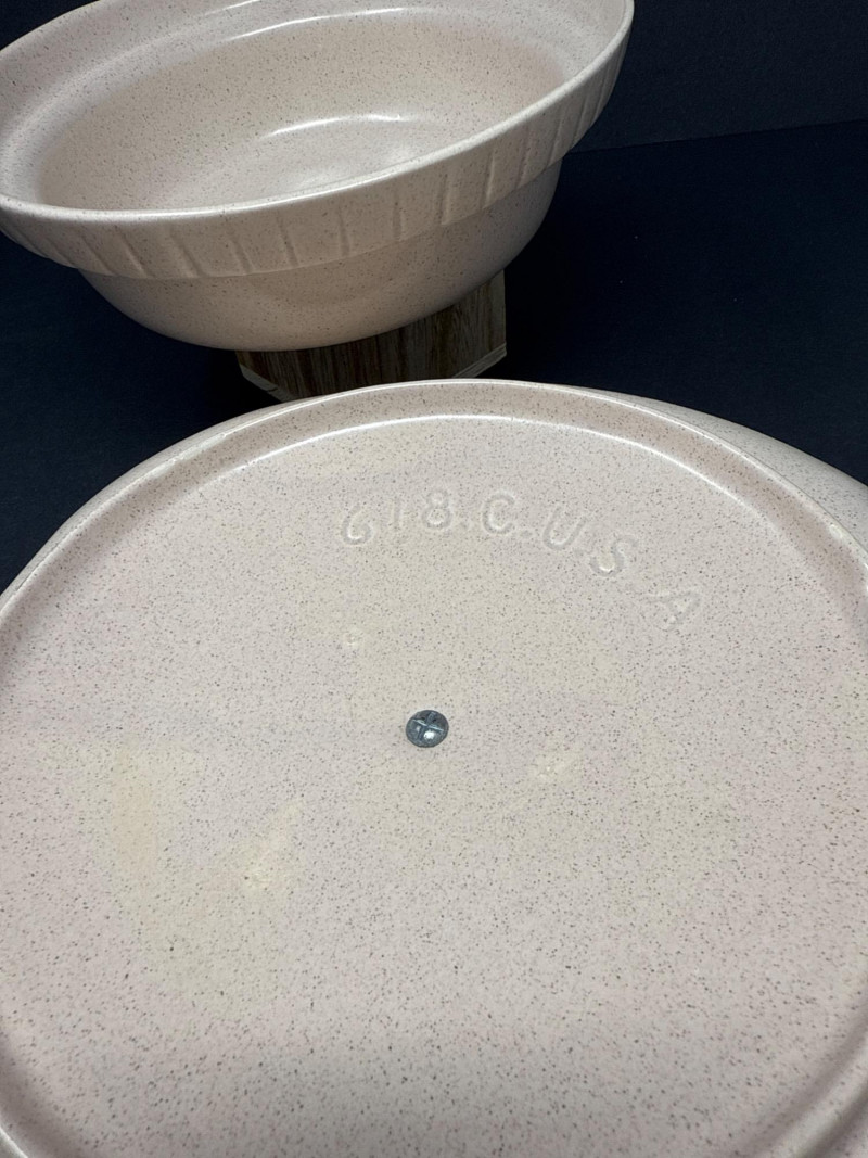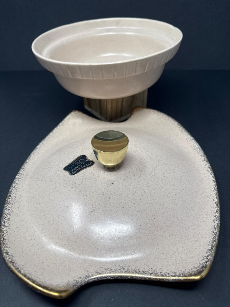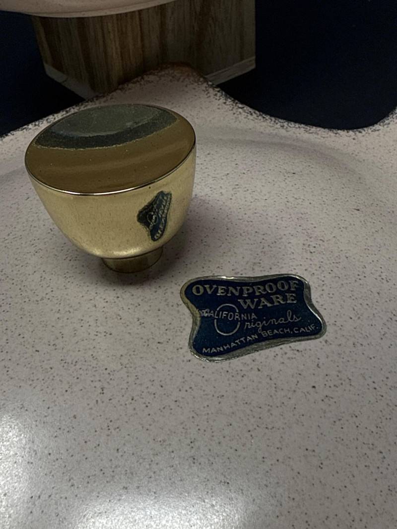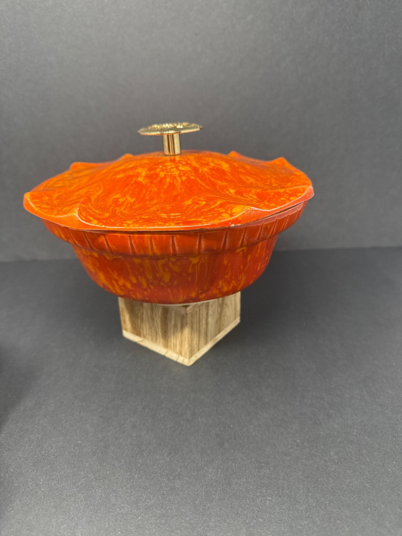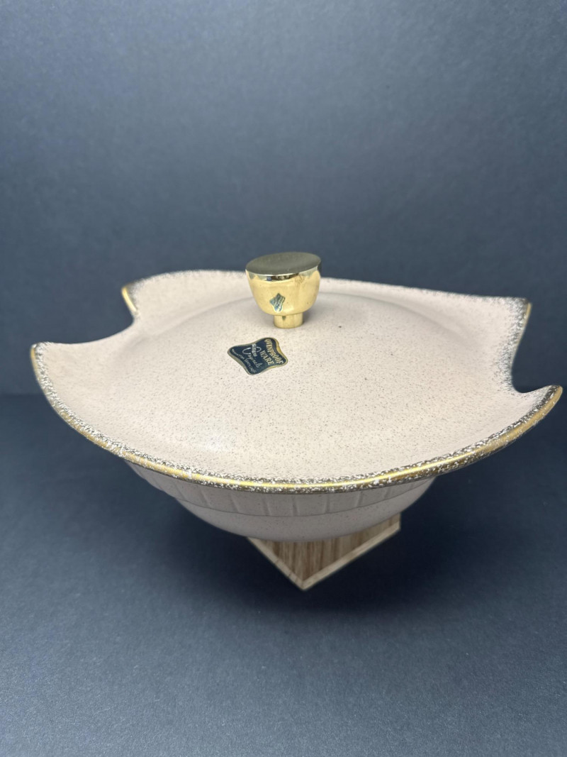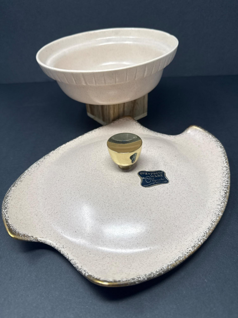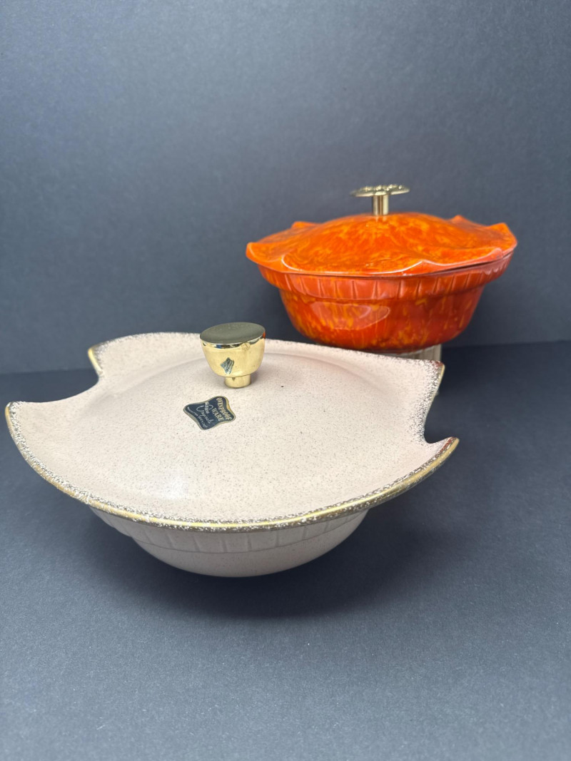 1950s California Pottery Orange Lidded Casserole & MCM Speckled Dish The first is a 1950s California Pottery lidded casserole dish in orange. The second is a Mid-Century Modern (MCM) speckled serving dish, possibly from Quenwood Ware, as suggested by an accompanying tag. Both pieces offer unique textures and colors. The orange casserole dish is suitable for baking and serving, while the speckled dish can be used for appetizers or as a decorative item. They represent different eras of ceramic design.