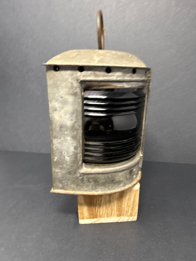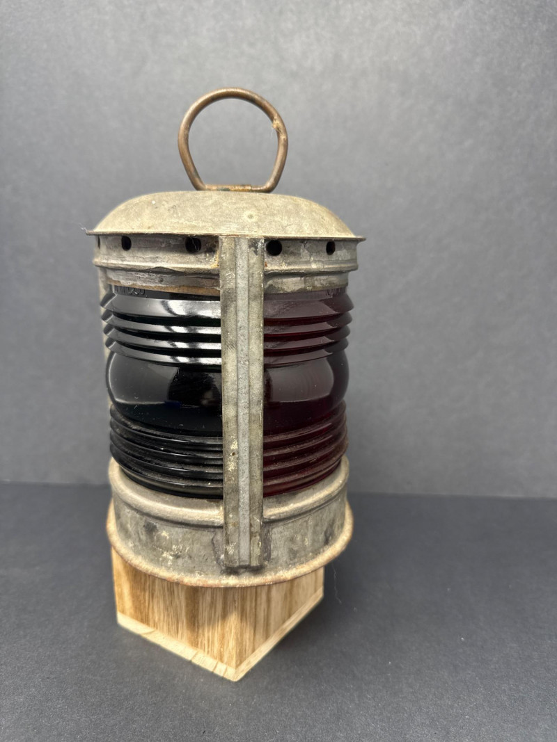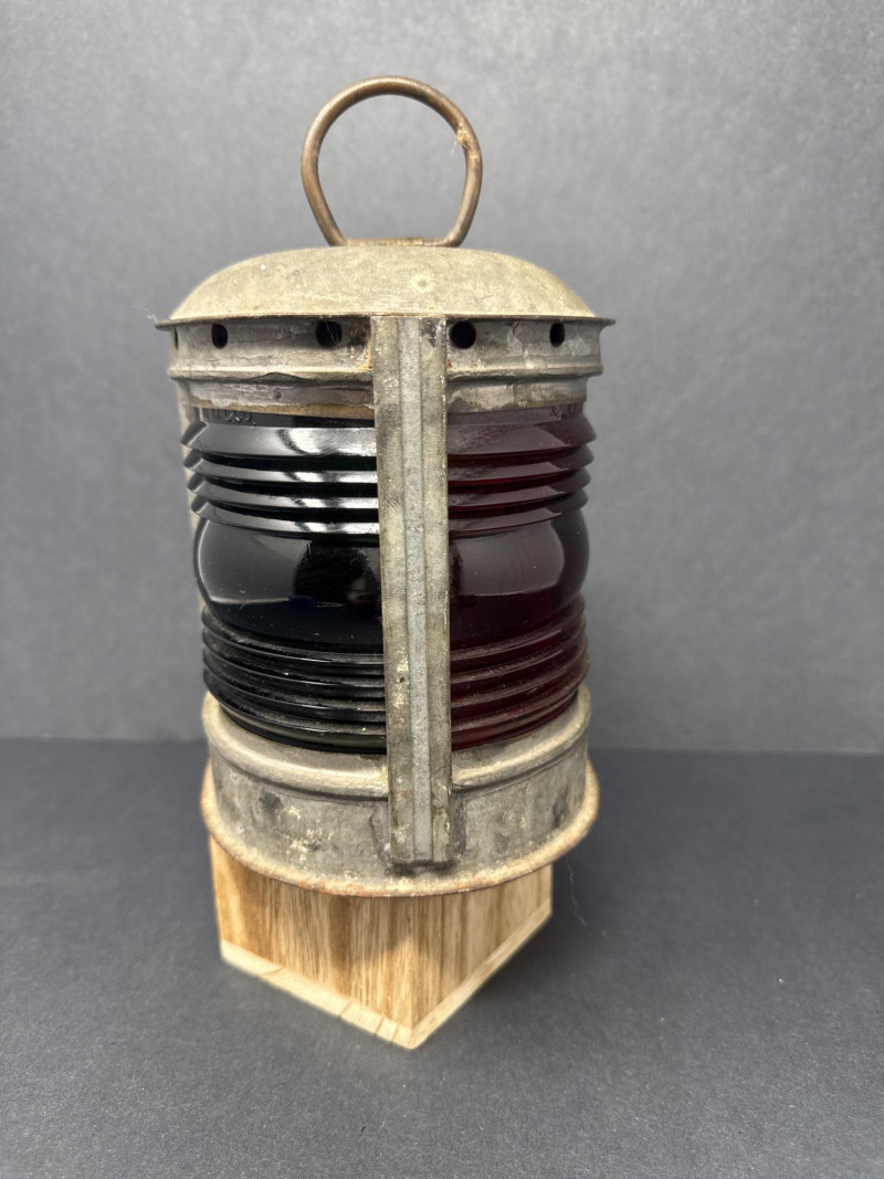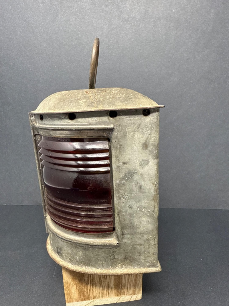 Antique Wilcox Crittenden Hurricane Tested Marine Light This nautical lantern features a rustic metal casing with a red lens, indicative of a starboard, port, or bow light used on maritime vessels. It includes a metal ring for hanging. This piece is suitable for collectors of nautical memorabilia, maritime decor, or as a unique accent in a home or office. Its vintage appearance adds character.