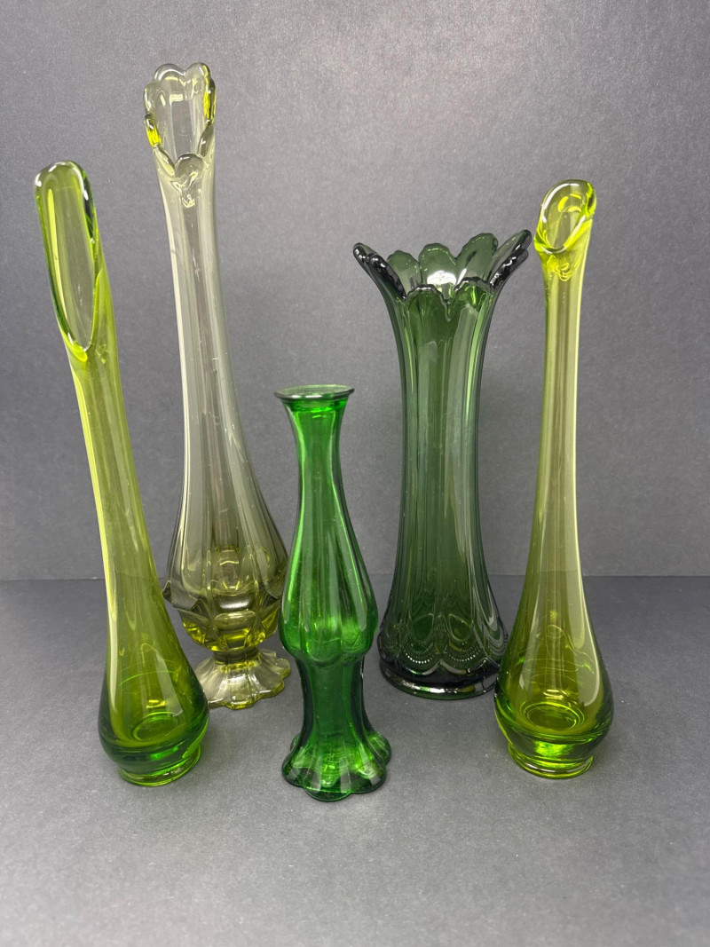 Lot of 5 Vintage Green Glass Vases: Swung, Bud, & Mid-Century Styles (Avon, Fenton, Murano-Style) The collection includes a tall Viking-style swung glass vase, a Murano-style green swung vase, and an Avon Emerald Green decorative bud vase. Also featured is a Mid-Century Modern (MCM) Fenton Valencia petal footed vase. These vases range in height from approximately 8 inches to 14.5 inches. They are suitable for displaying single flowers or small bouquets, or as decorative accents in a home or office.