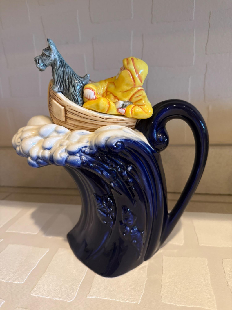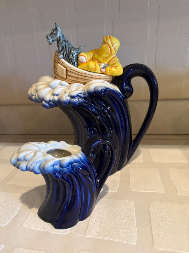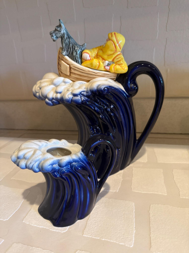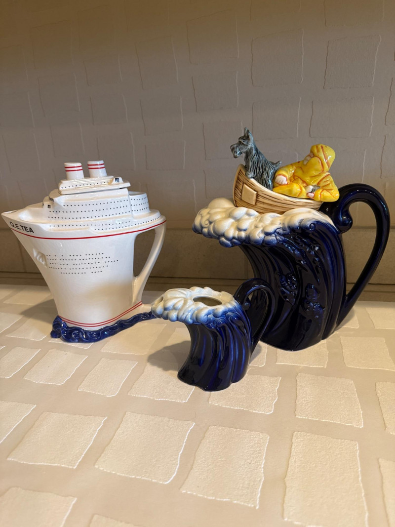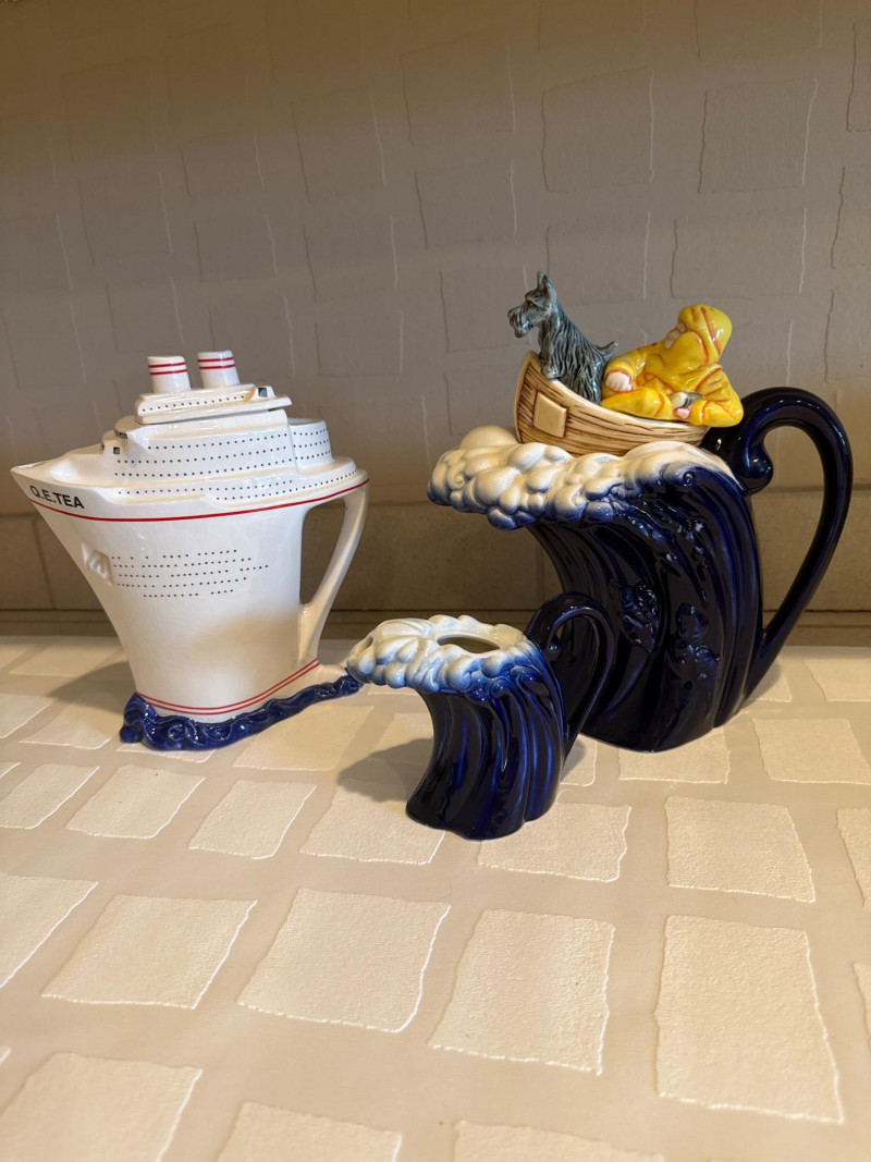 Limited Edition Paul Cardew Teapots: Royal & Nautical Designs The collection includes a "Queen Elizabeth II" cruise ship teapot, and a "Cardew Collectors Club Limited Edition Fisherman With Dog on a Wave" teapot, which also includes a companion wave-shaped creamer. The creamer appears to be missing its lid. These highly detailed teapots are suitable for collectors of novelty teapots, maritime enthusiasts, or as decorative display pieces.