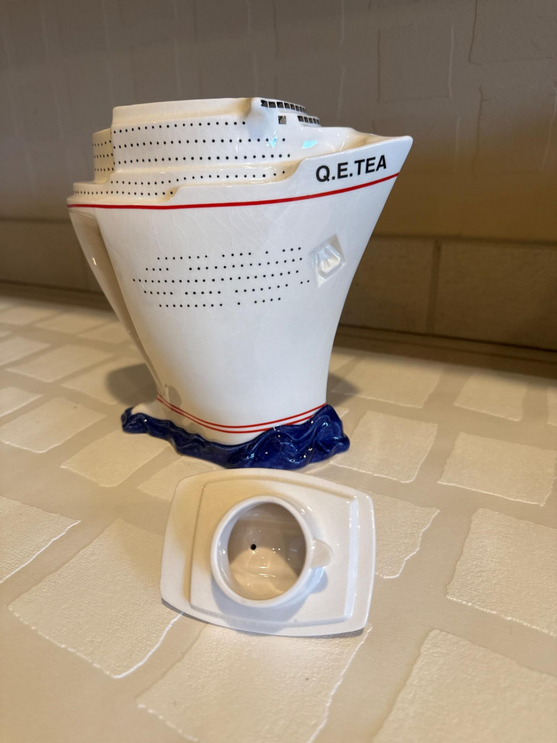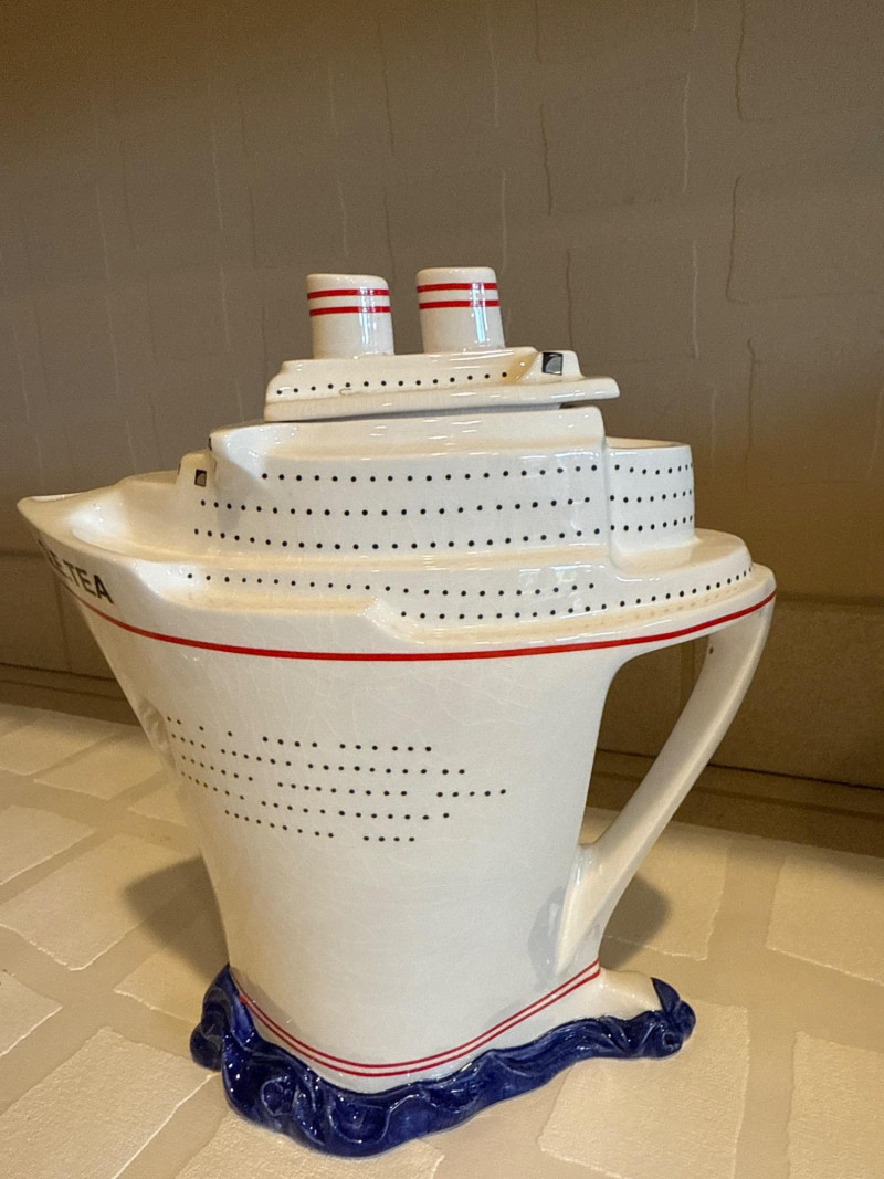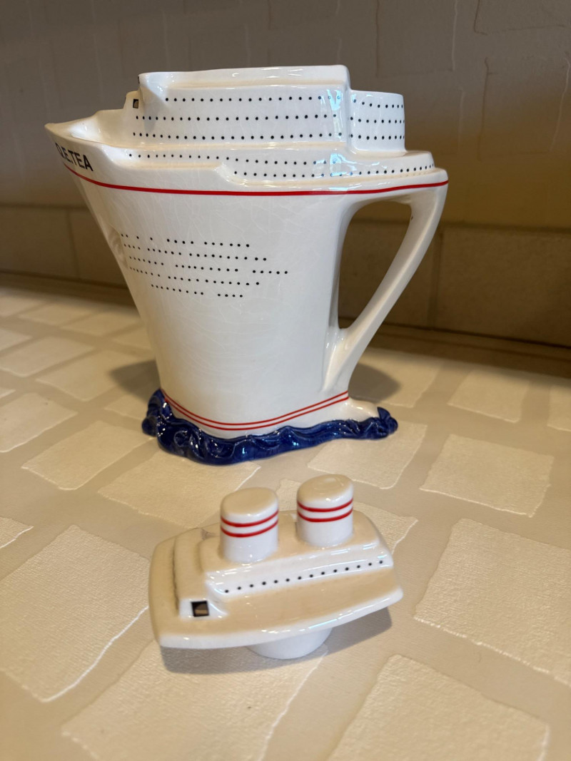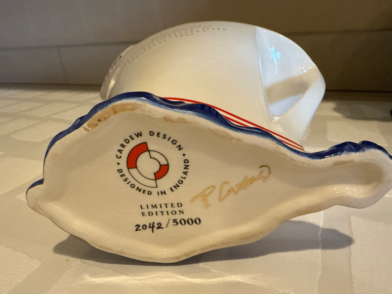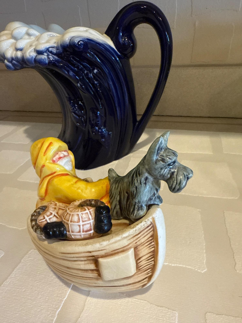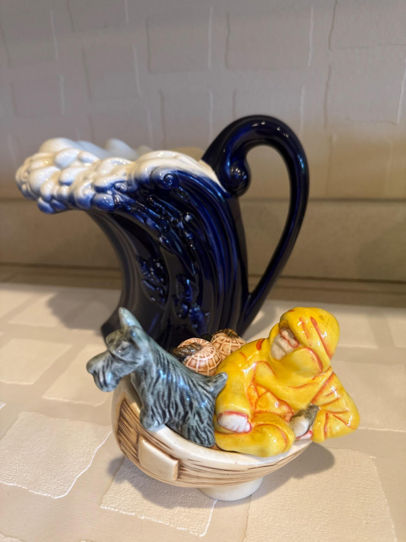 Limited Edition Paul Cardew Teapots: Royal & Nautical Designs The collection includes a "Queen Elizabeth II" cruise ship teapot, and a "Cardew Collectors Club Limited Edition Fisherman With Dog on a Wave" teapot, which also includes a companion wave-shaped creamer. The creamer appears to be missing its lid. These highly detailed teapots are suitable for collectors of novelty teapots, maritime enthusiasts, or as decorative display pieces.