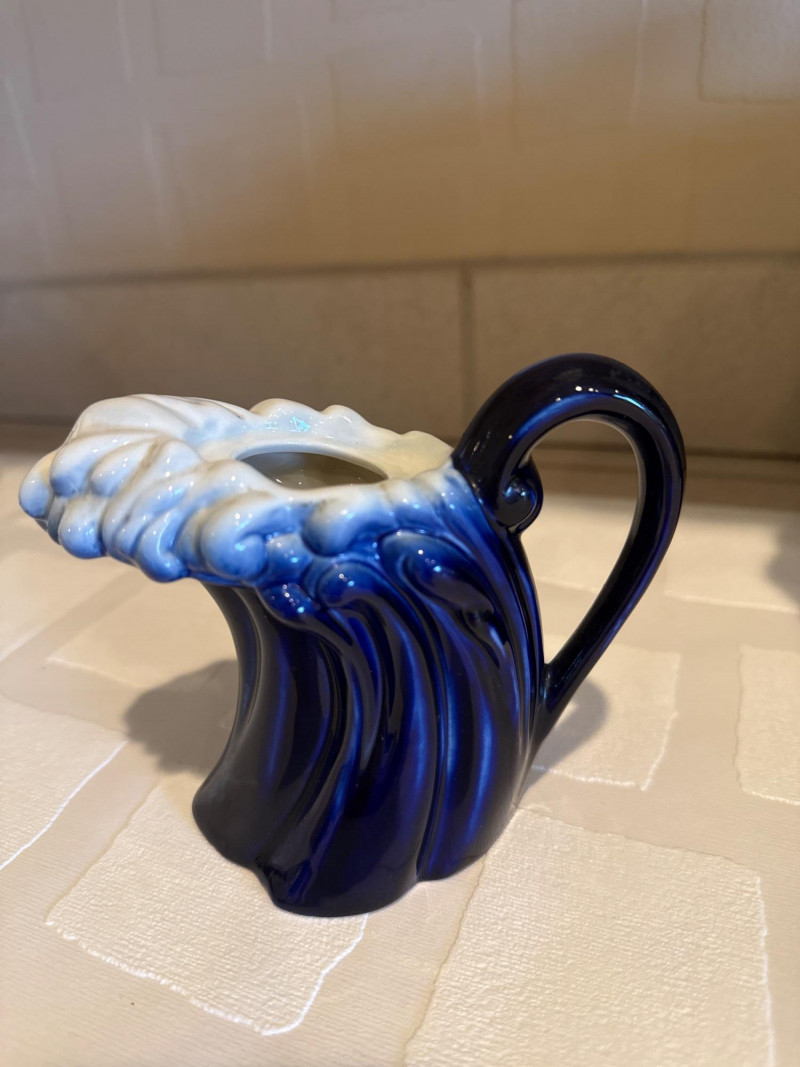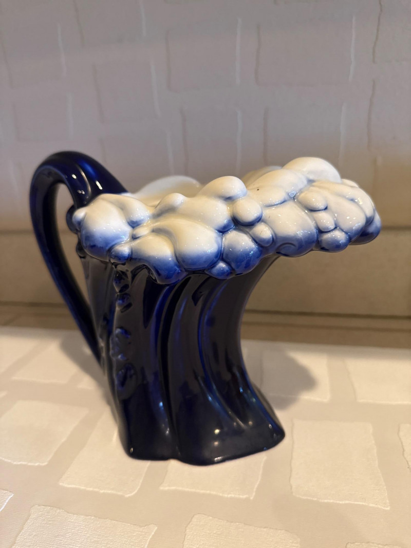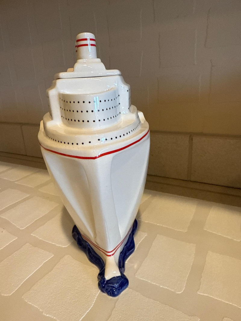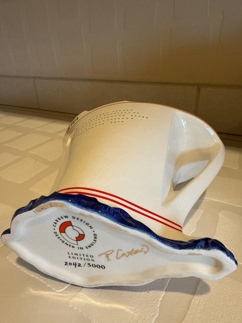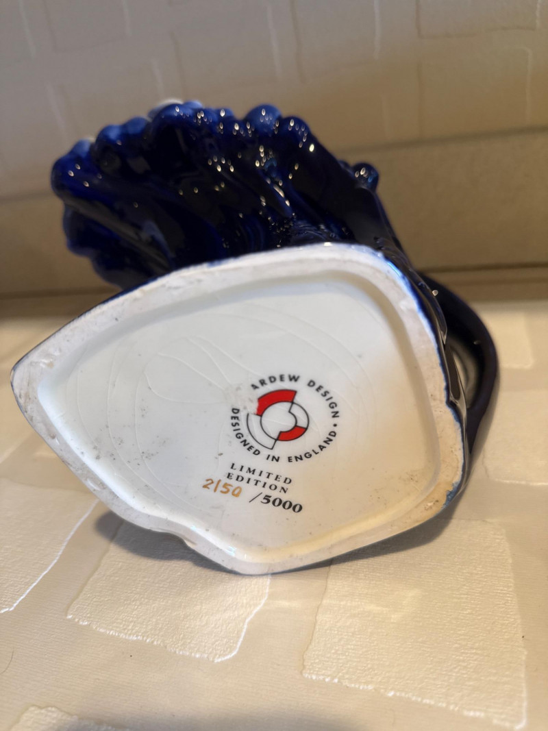 Limited Edition Paul Cardew Teapots: Royal & Nautical Designs The collection includes a "Queen Elizabeth II" cruise ship teapot, and a "Cardew Collectors Club Limited Edition Fisherman With Dog on a Wave" teapot, which also includes a companion wave-shaped creamer. The creamer appears to be missing its lid. These highly detailed teapots are suitable for collectors of novelty teapots, maritime enthusiasts, or as decorative display pieces.