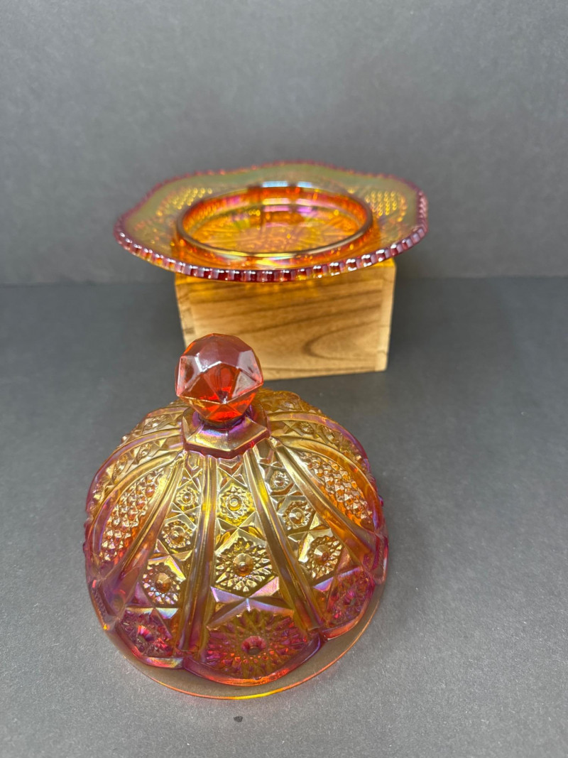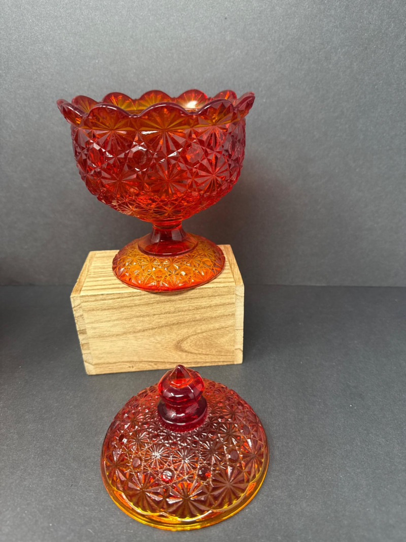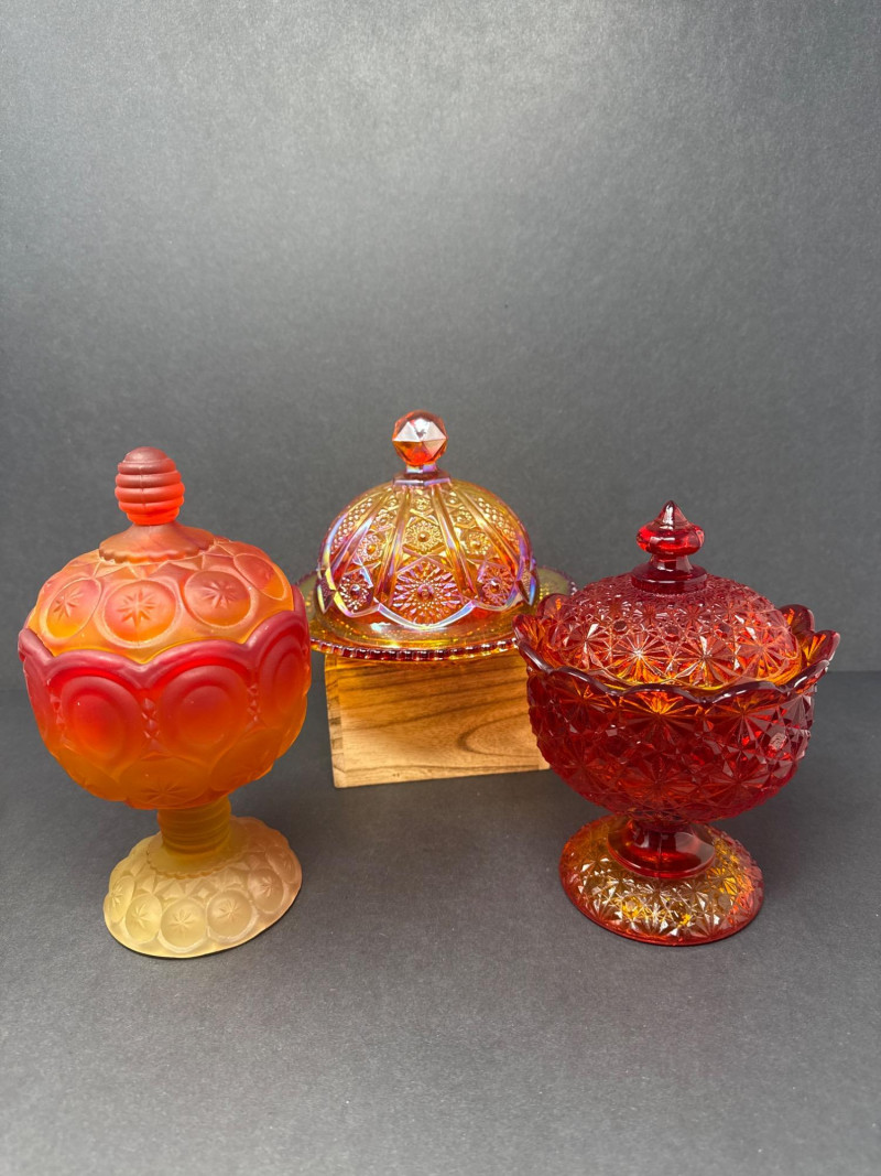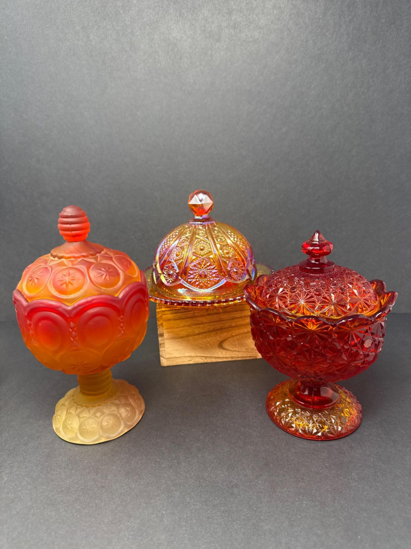 Vintage Moon & Stars Red & Amber Lidded Glass Bowls & Butter Dish This auction offers a lot of three lidded glassware pieces, consisting of two compote-style candy bowls and one covered butter dish. The candy bowls are distinct in their design; one features a frosted appearance with a moon and stars pattern, transitioning from orange to yellow. The other candy bowl is red with a diamond-point pattern. The covered butter dish is iridescent.