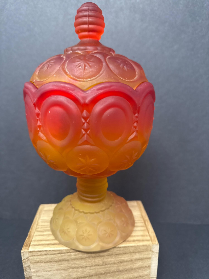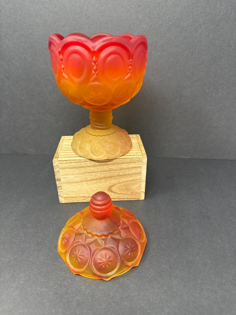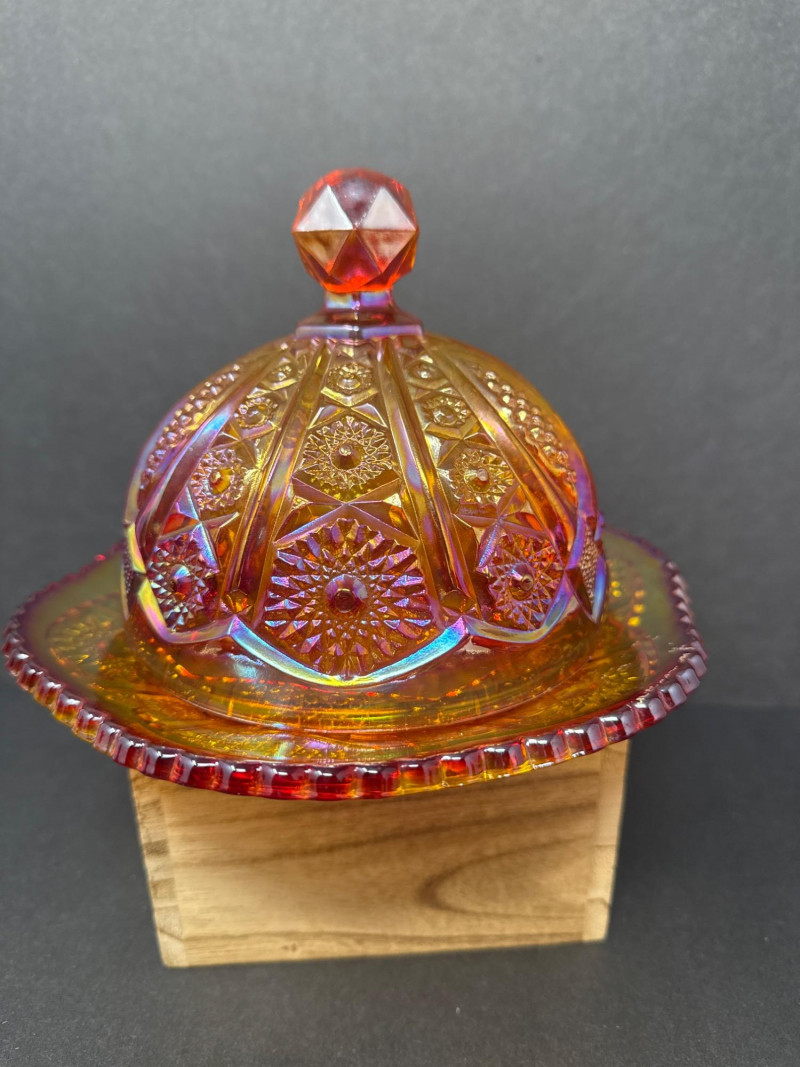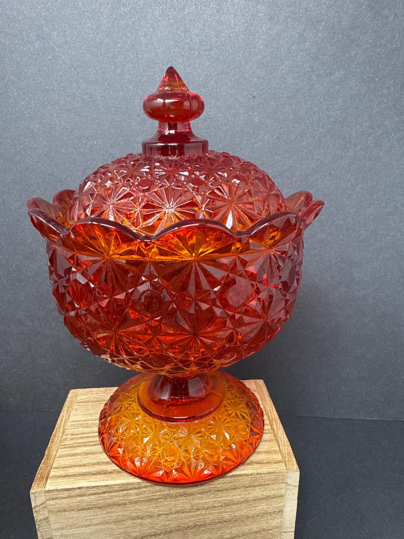 Vintage Moon & Stars Red & Amber Lidded Glass Bowls & Butter Dish This auction offers a lot of three lidded glassware pieces, consisting of two compote-style candy bowls and one covered butter dish. The candy bowls are distinct in their design; one features a frosted appearance with a moon and stars pattern, transitioning from orange to yellow. The other candy bowl is red with a diamond-point pattern. The covered butter dish is iridescent.