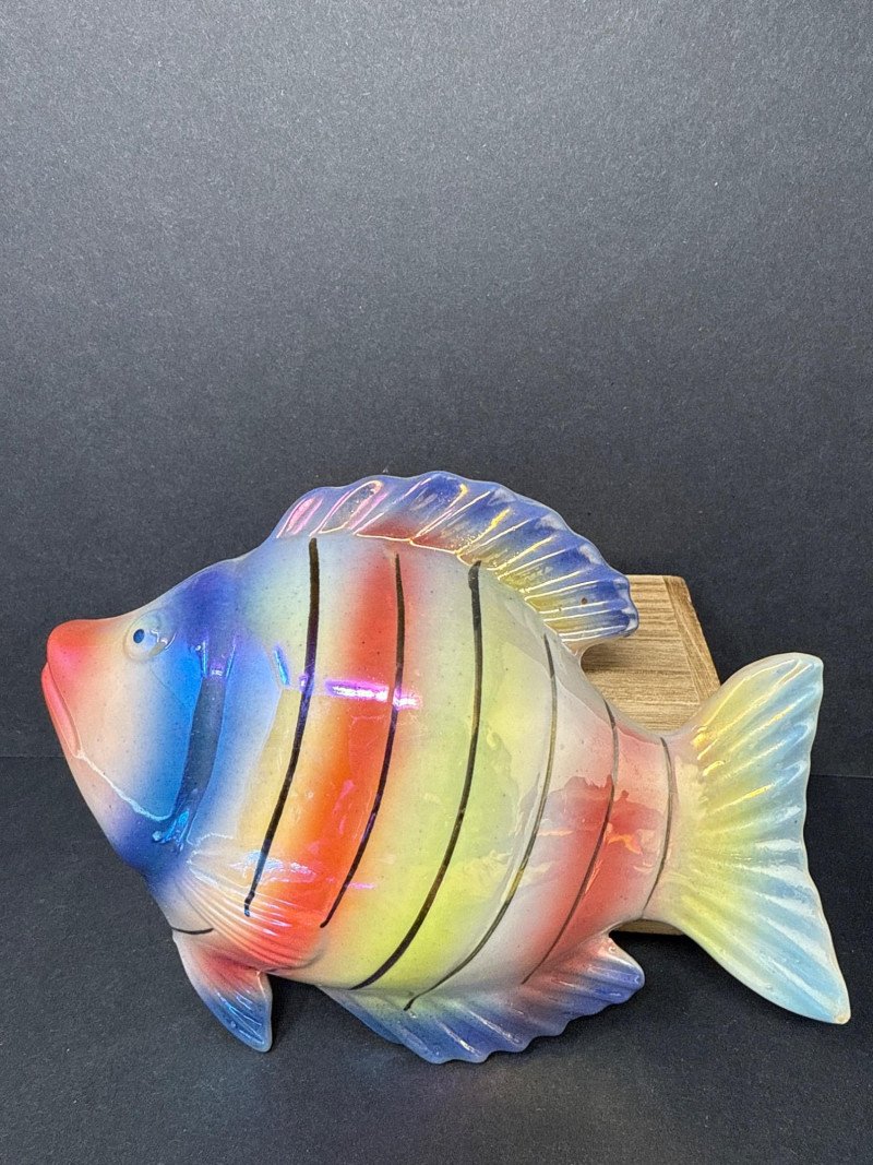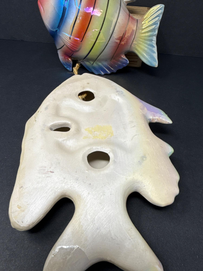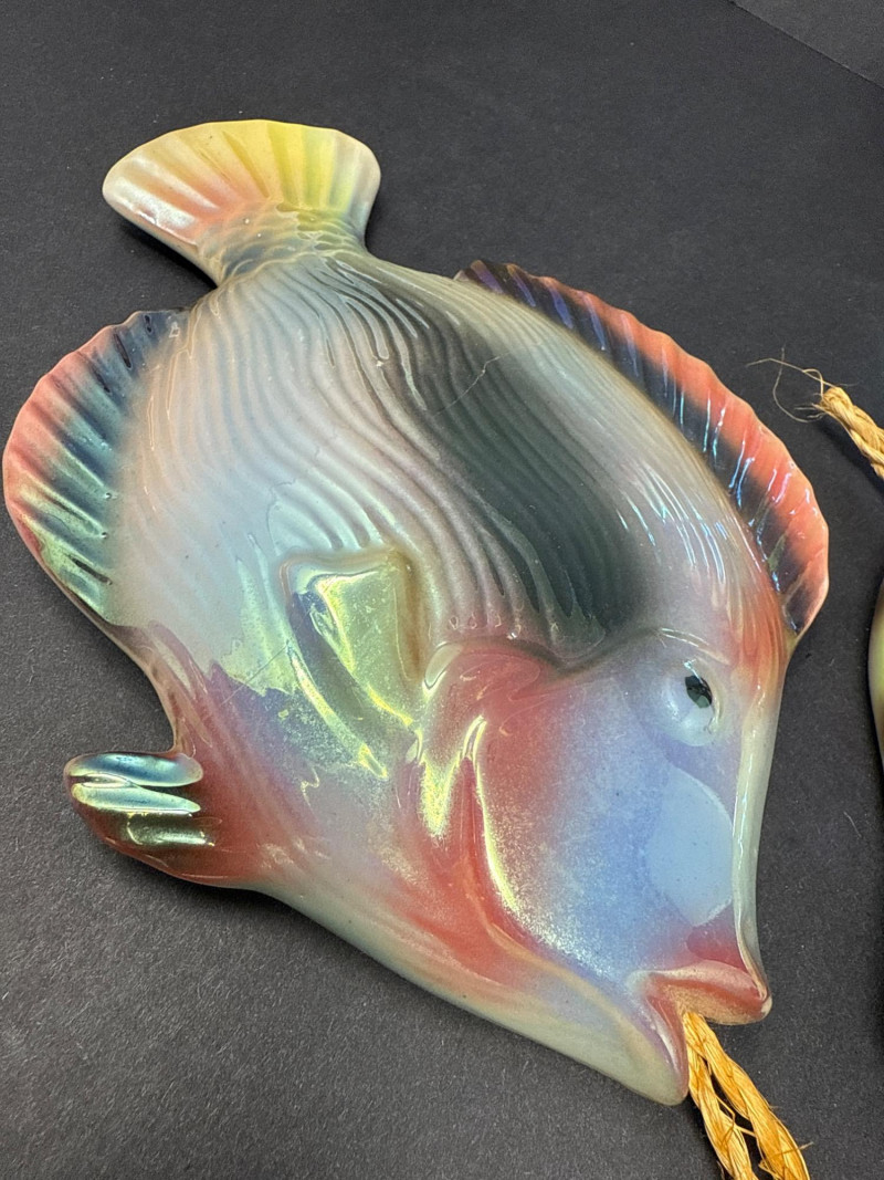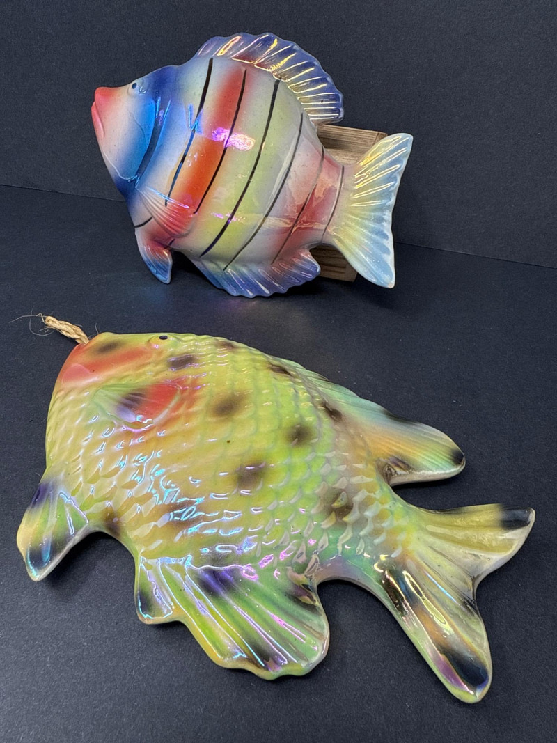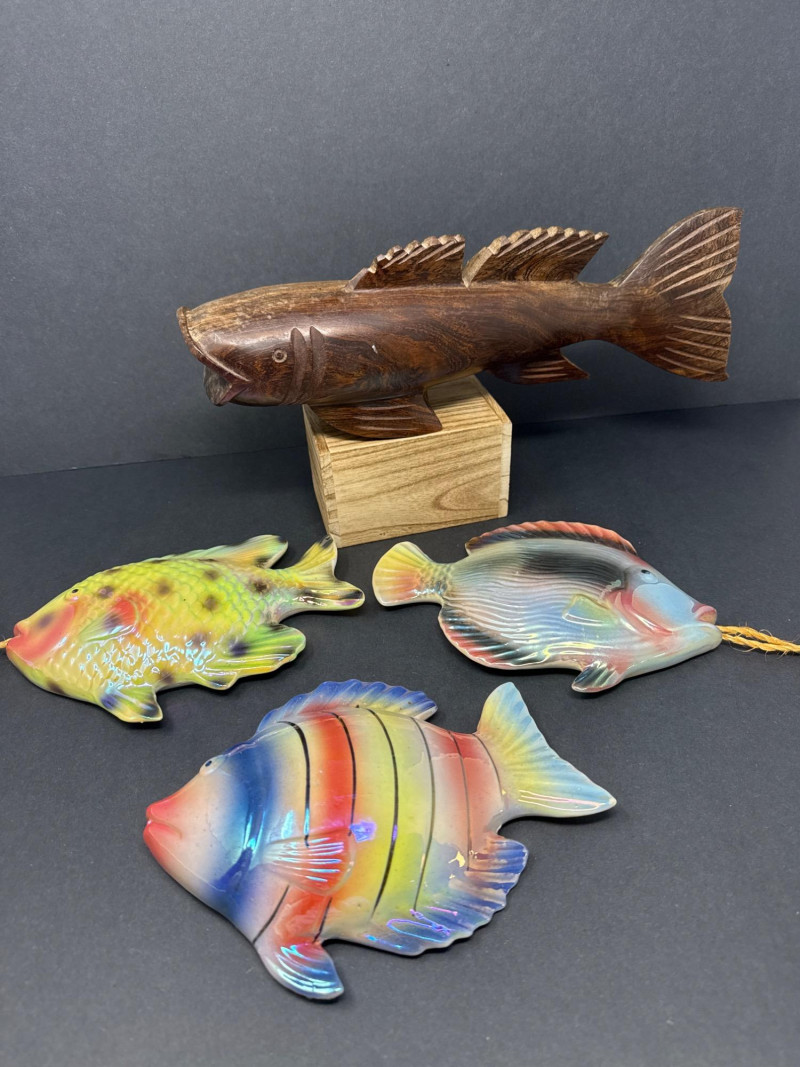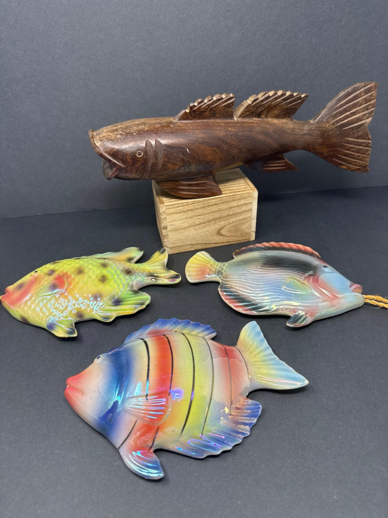 Mid-Century Style Fish Decor: Ironwood Carving & Colorful Ceramic The collection includes one heavy, dark ironwood carved fish and three iridescent ceramic fish. The ceramic fish are brightly colored with a glossy finish. The carved ironwood fish measures approximately 14 inches long by 5.5 inches wide. The ceramic fish each measure approximately 8.5 inches long by 5.5 inches wide. Please note that one of the ceramic fish has a fracture on the top surface that appears more like a scratch and does not go through the piece. These figurines are suitable for adding a coastal or nature-inspired accent to any room.